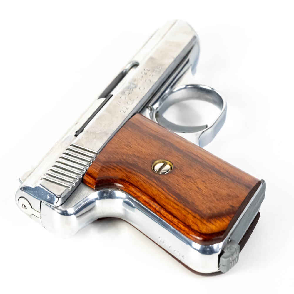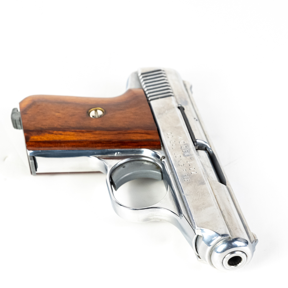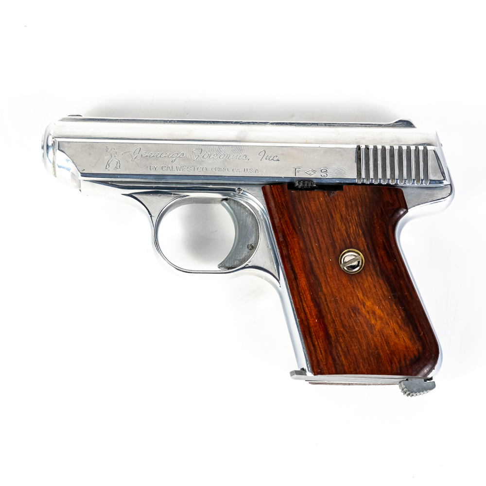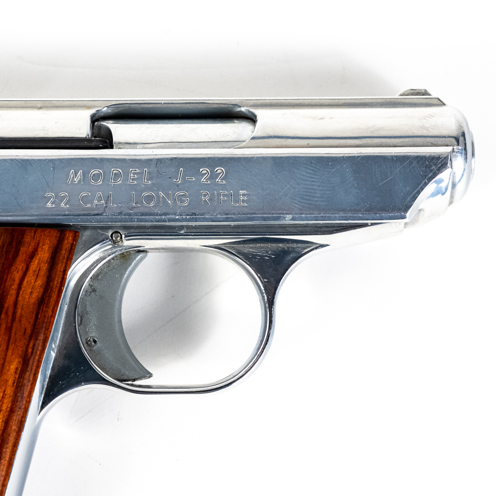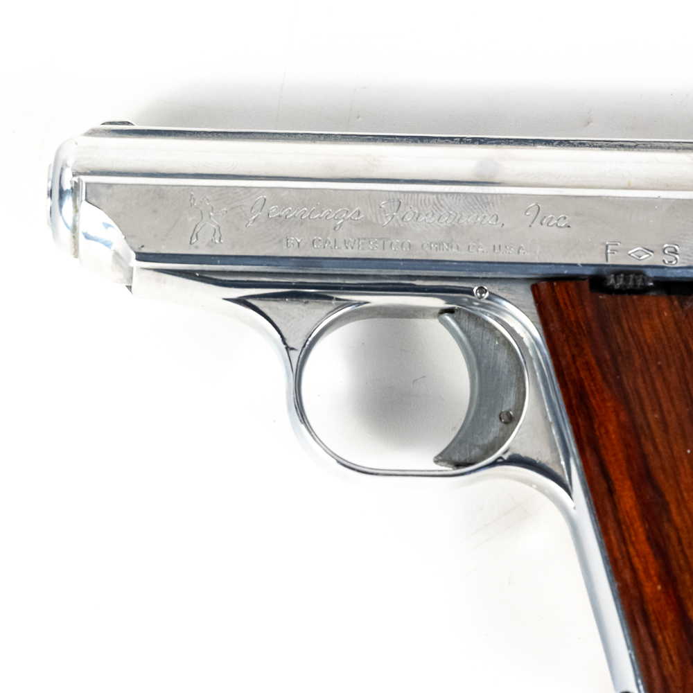 Jennings J-22 Pistol. Caliber .22LR. Nice older production Chrome plated pocket pistol. Pistol appears to be unfired and comes in original box with papers. Good display item or range toy. See photos.