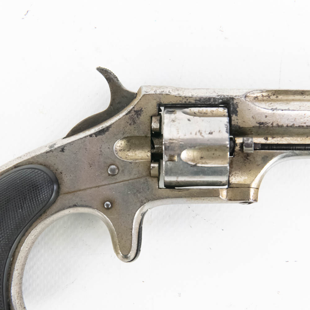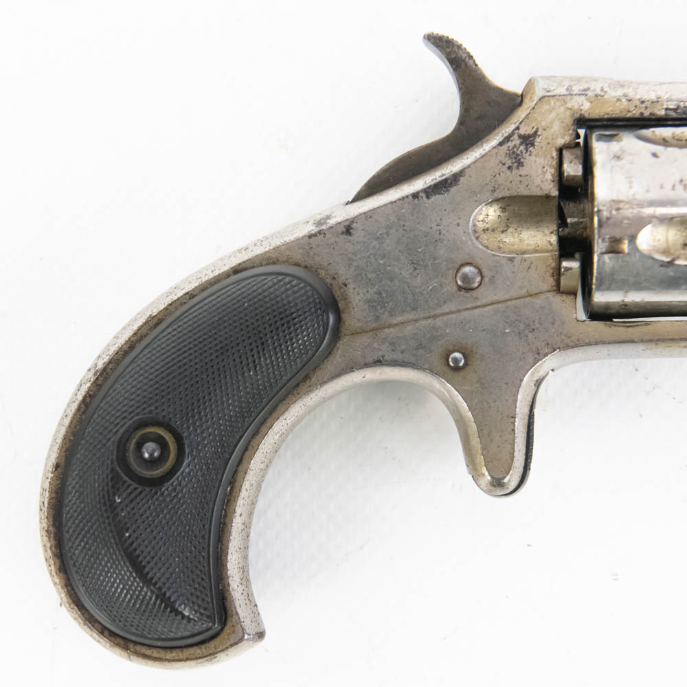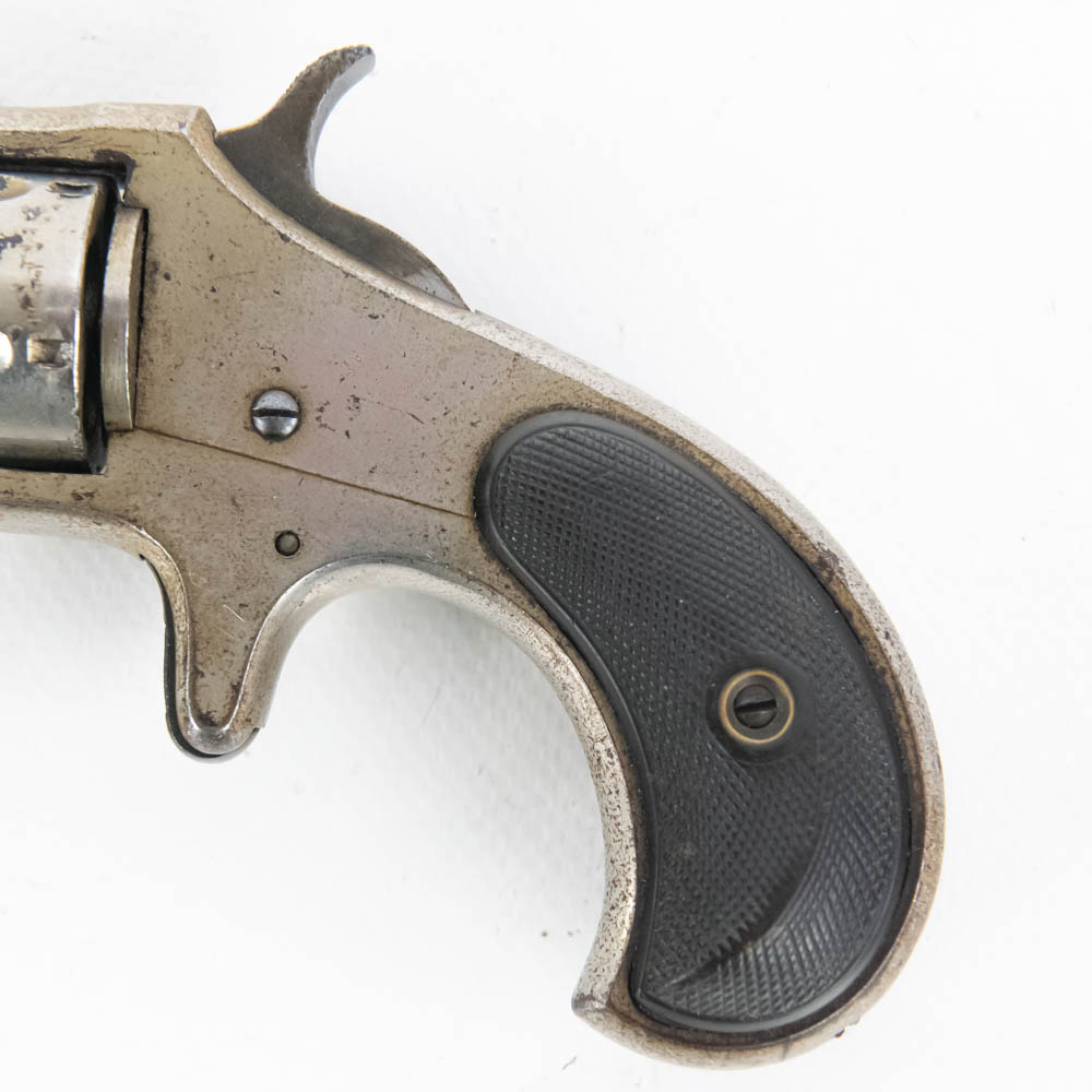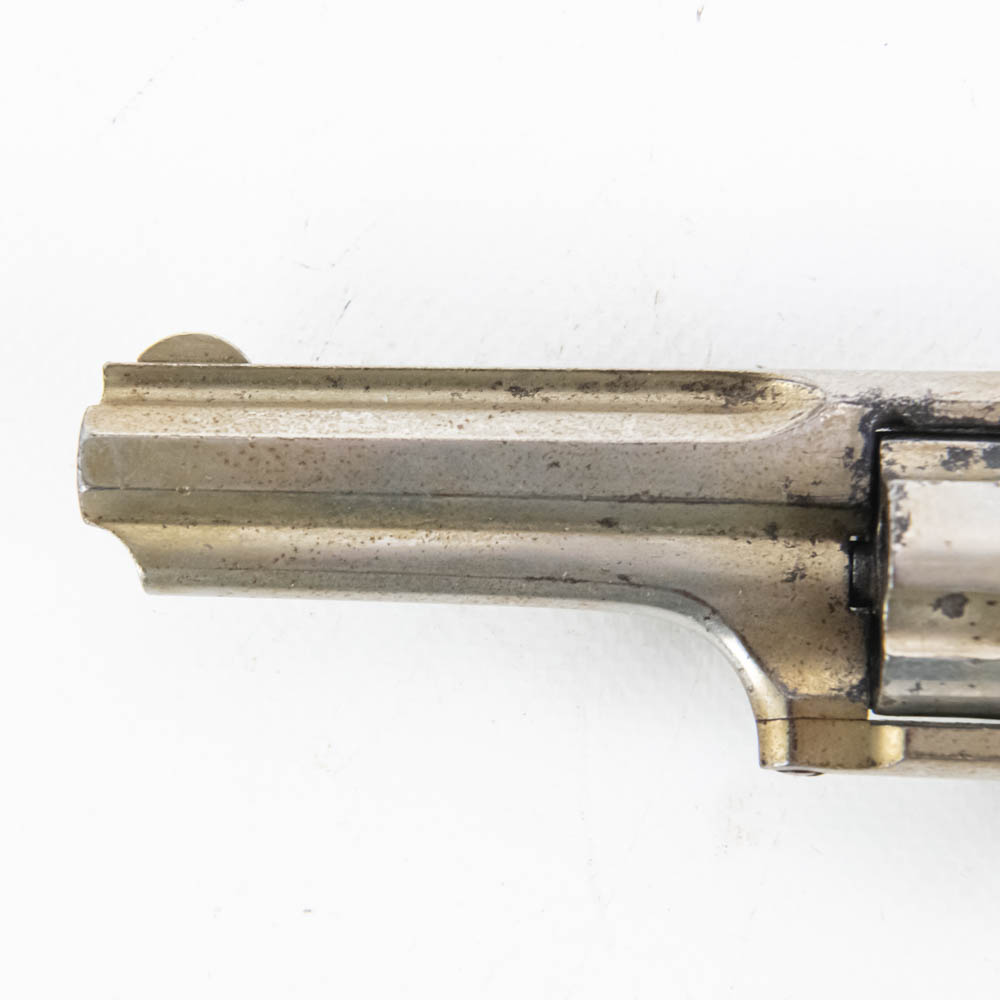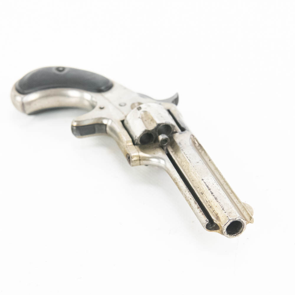 Remington Smoot Number 2 pocket revolver. Caliber .32 Rim fire. Wild West 1870s era concealed carry pistol is in very good condition for age. Factory Nickel plating is still 80% and bears signs of tobacco smoke buildup. Single action mechanism is still very strong and sharp. Very interesting pocket pistol. See photos.
