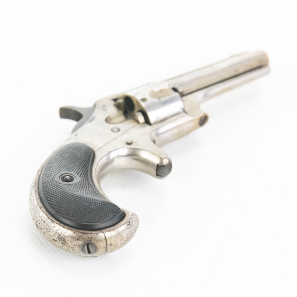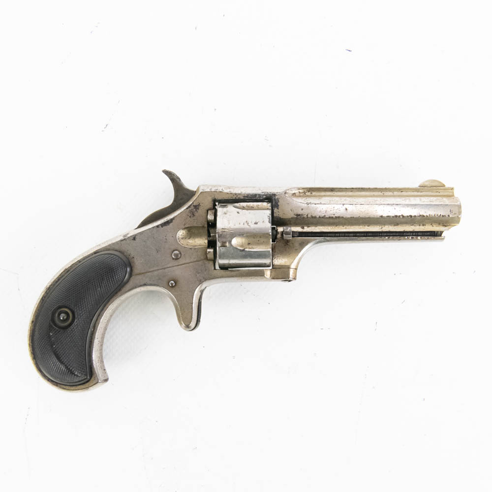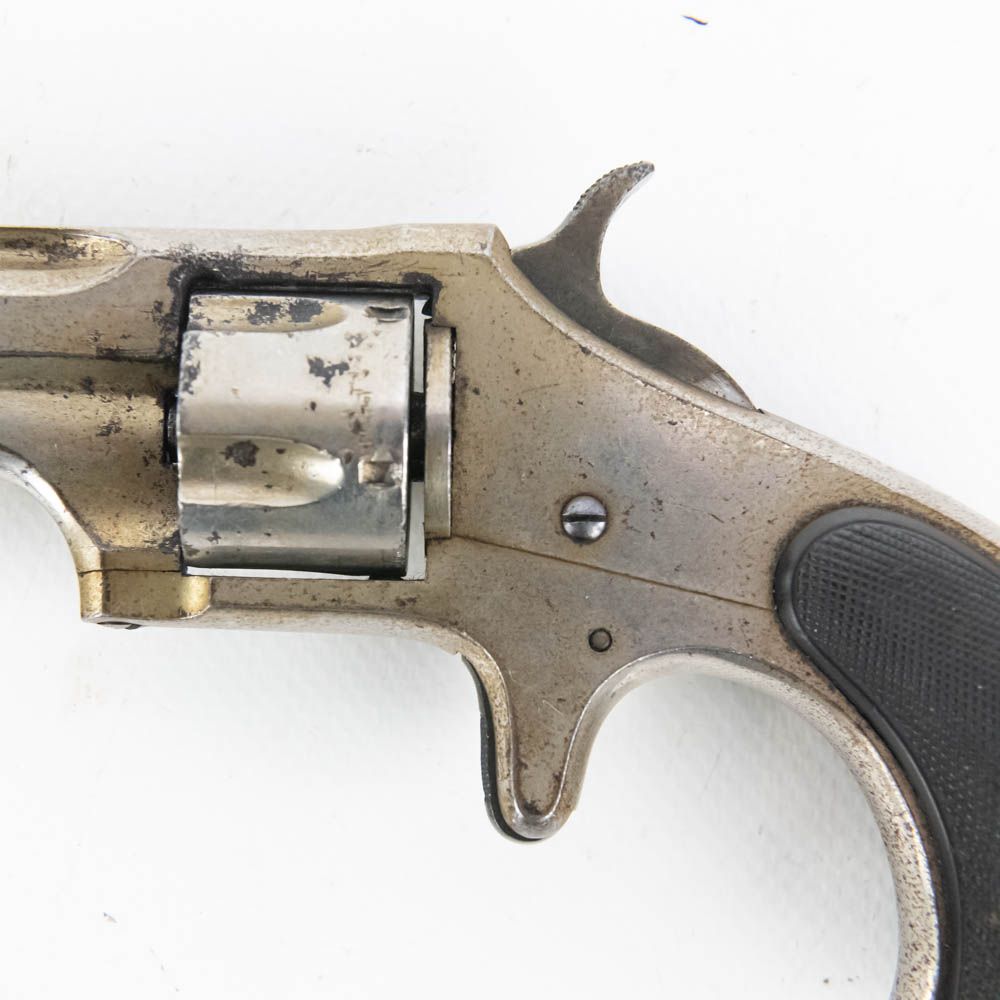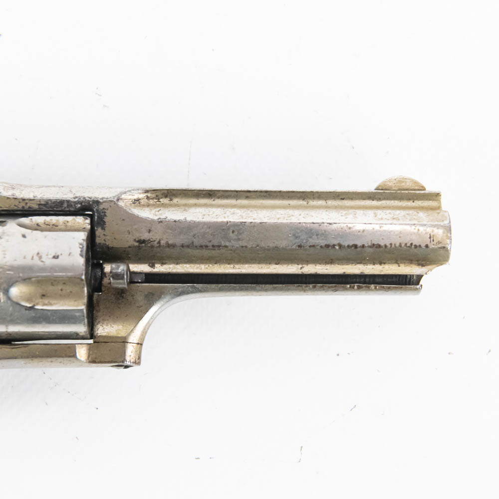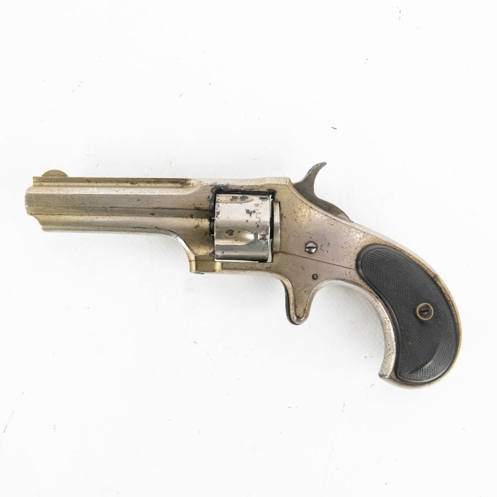 Remington Smoot Number 2 pocket revolver. Caliber .32 Rim fire. Wild West 1870s era concealed carry pistol is in very good condition for age. Factory Nickel plating is still 80% and bears signs of tobacco smoke buildup. Single action mechanism is still very strong and sharp. Very interesting pocket pistol. See photos.