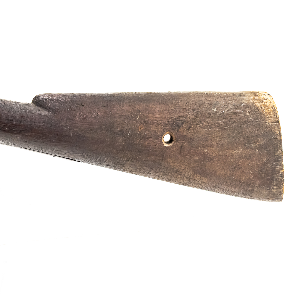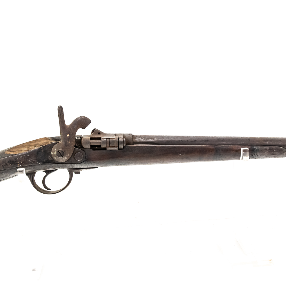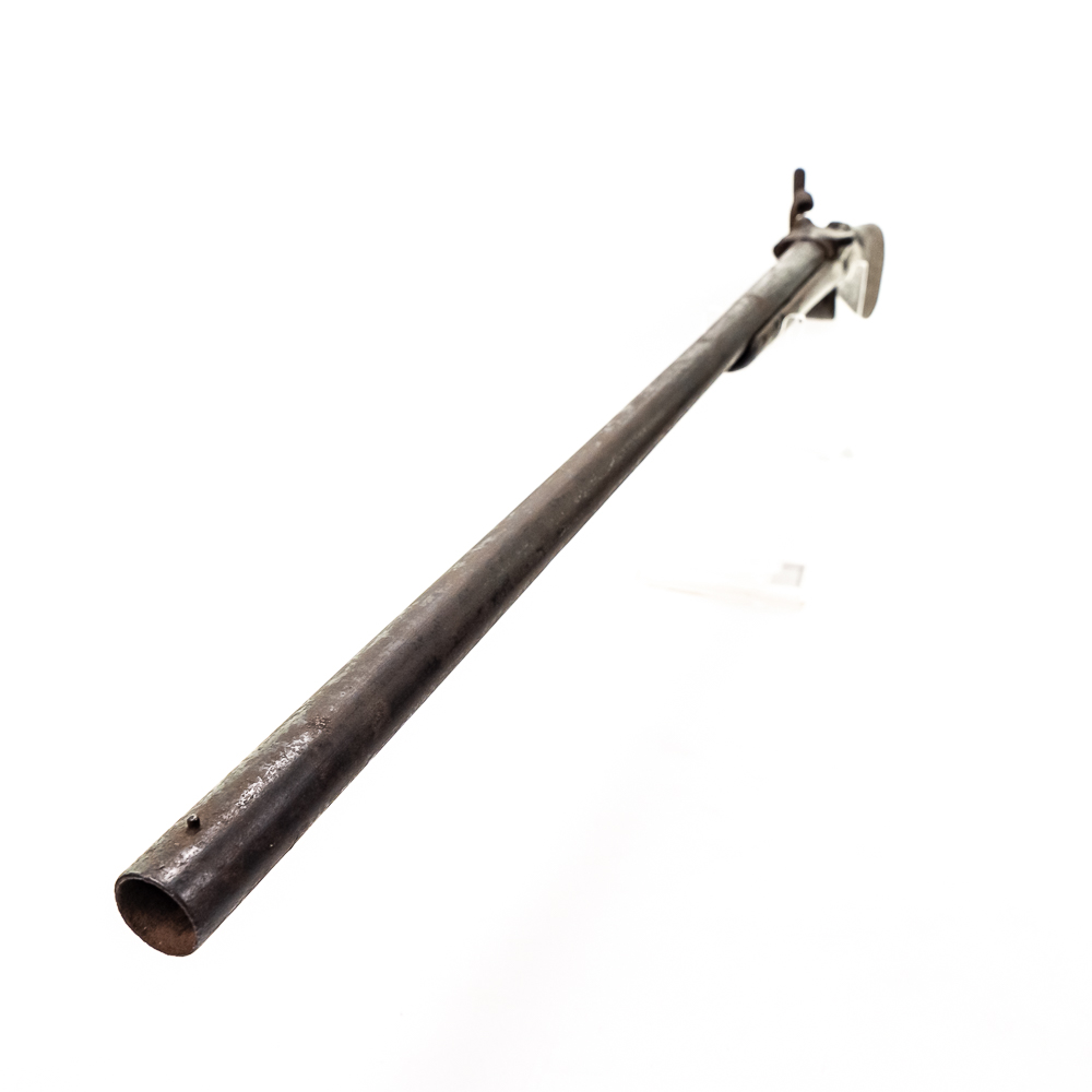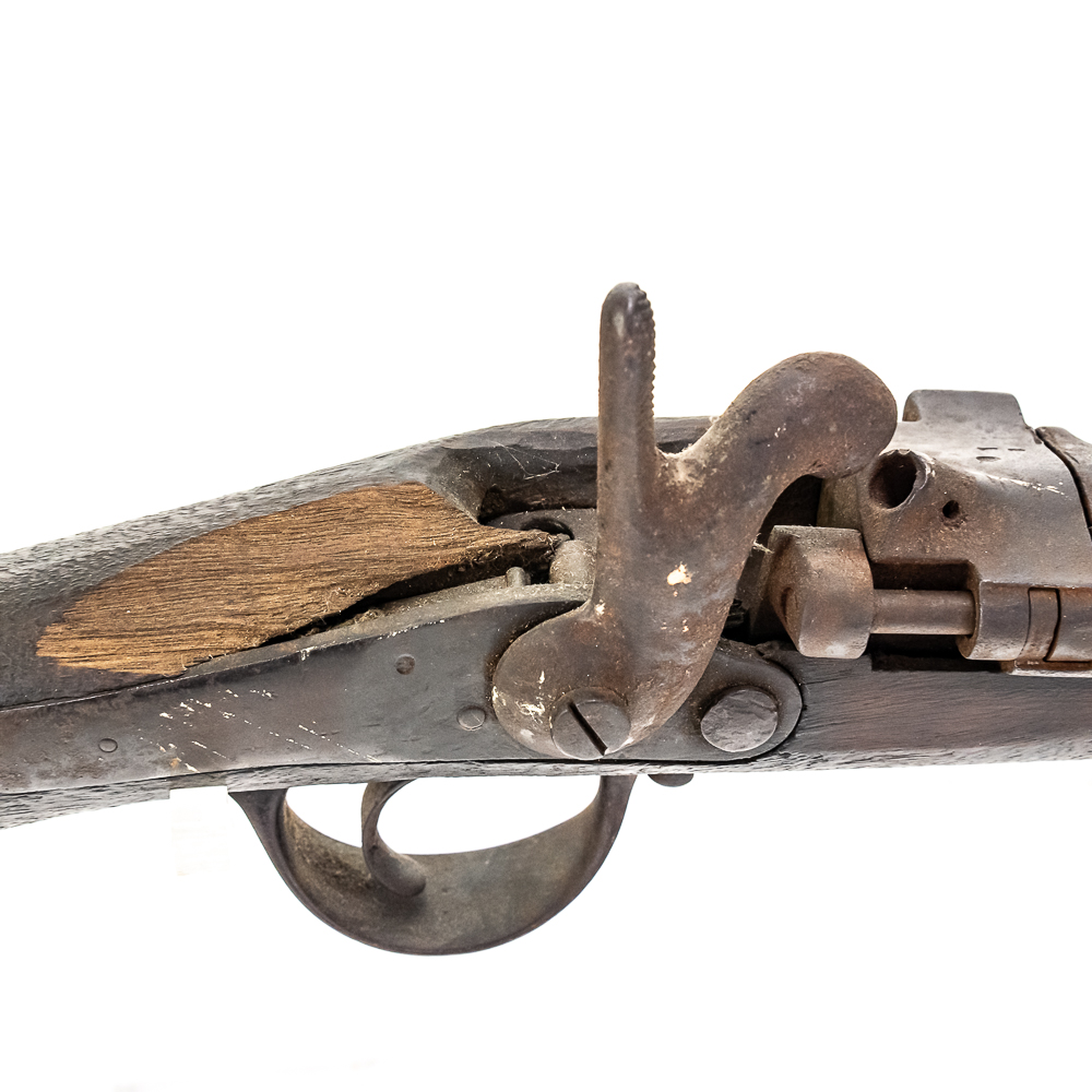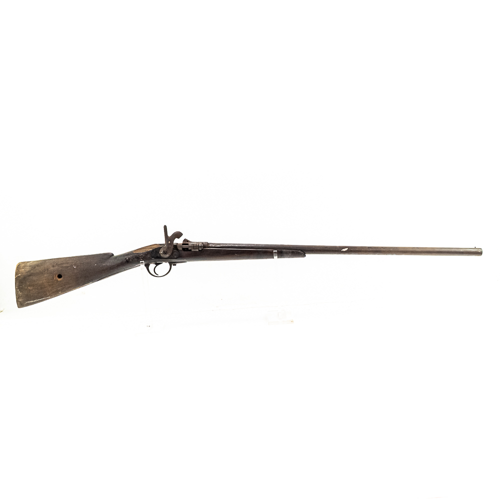 Belgian made musket converted to 12ga breech loading shotgun for sale to African and East Asian tribesmen. 32″ barrel is in very rough condition, Snider patent breech mechanism is missing firing pin and metal is heavily corroded. Stock is cut down and had hole drilled to hang on wall. Sold as wall-hanger only but must still go to FFL due to Illinois law.