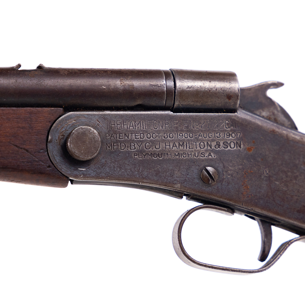 Hamilton No2 22lr Rifle in fair condition with wear and oxidation. The action DOES NOT stay closed. Do Not fire! Stock screw and rear sight missing. C&R Eligible NSN
