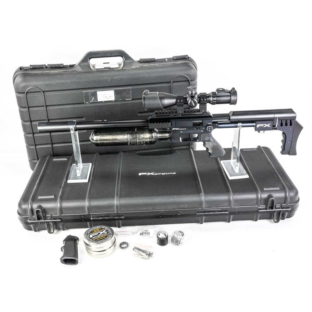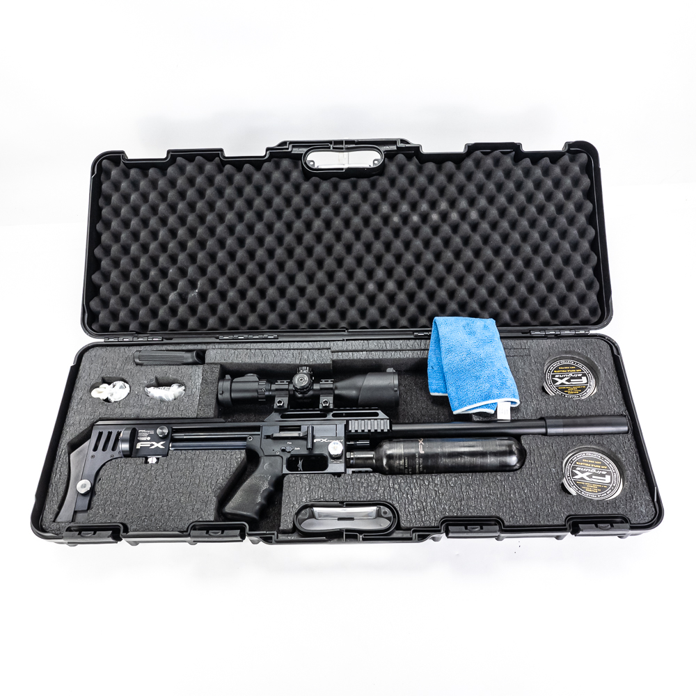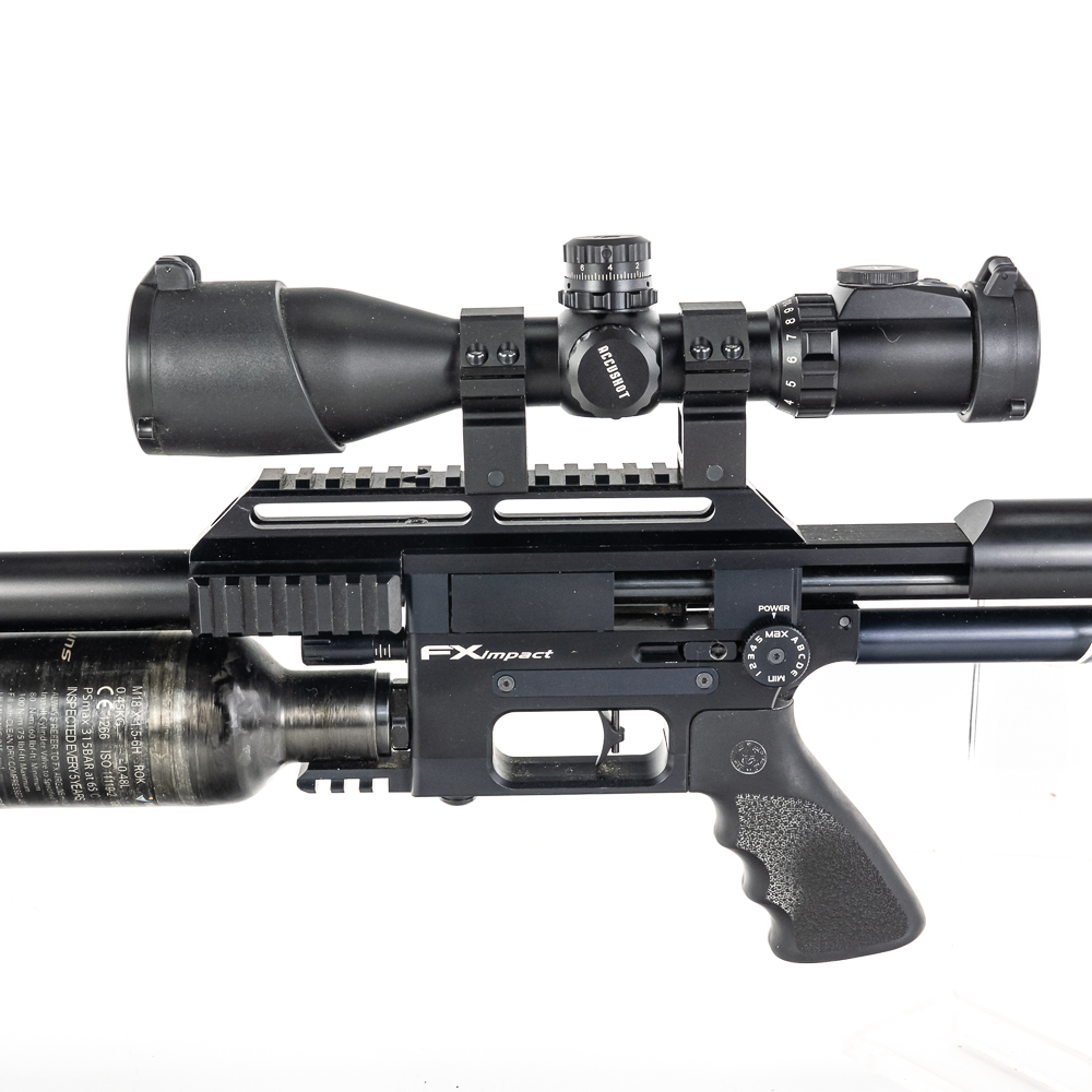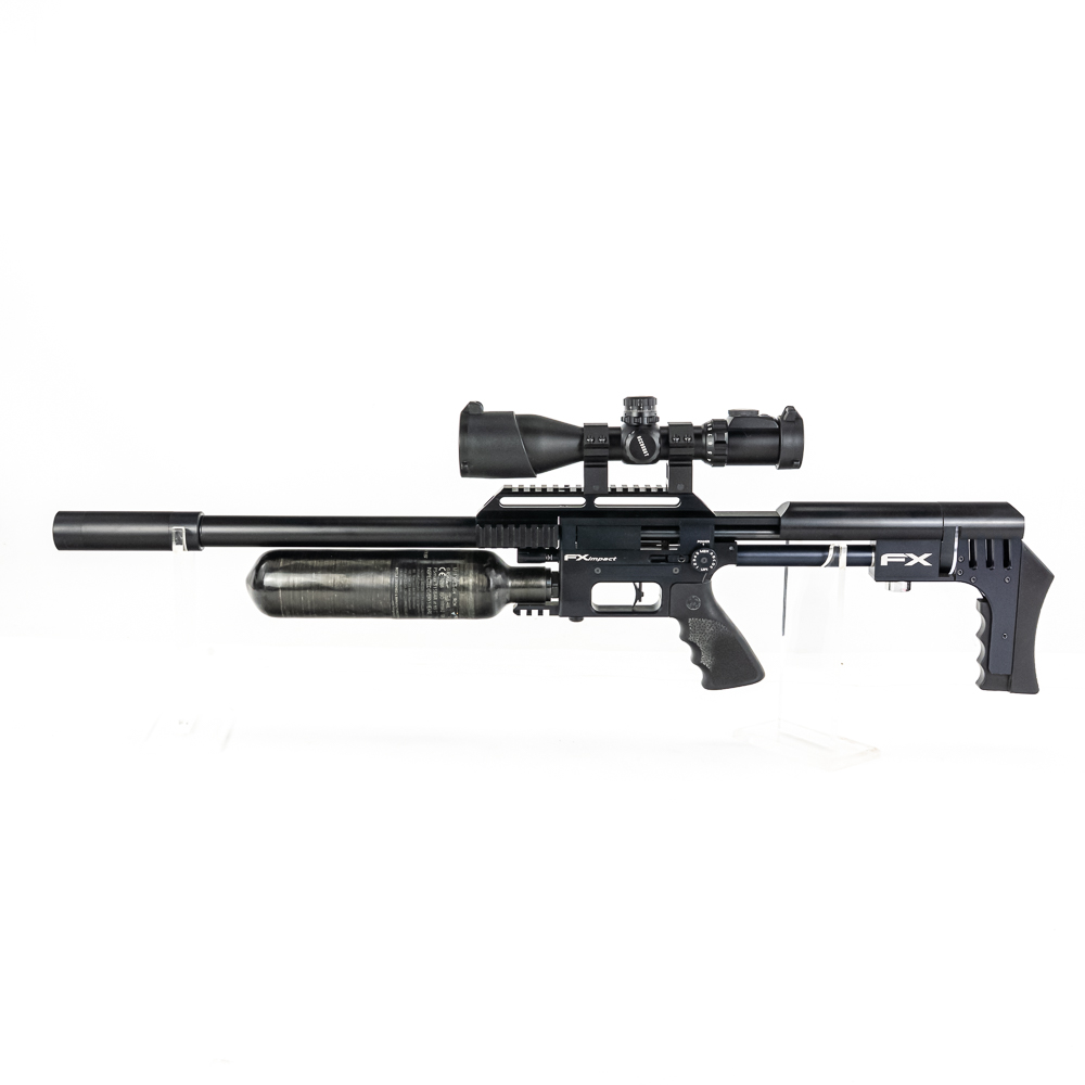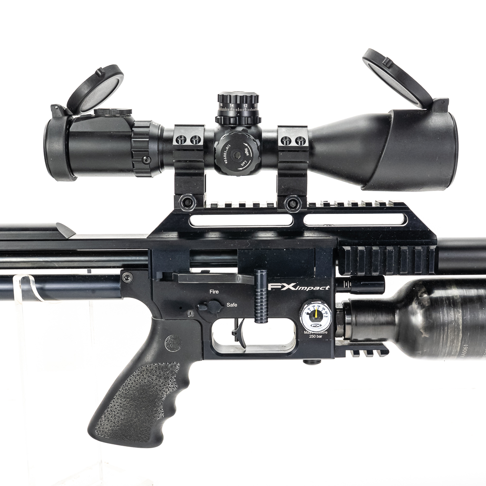 FX Impact M4 Compact Air Rifle. Caliber 6.35mm pellet. Swedish built, extremely high quality PCP (PreCharged Pneumatic) Air rifle is made for competition level target shooting. High end full metal stock air rifle is in excellent used condition and comes with AccuShot 4-16 illuminated scope, and factory sound moderator. Rifle comes with original factory hard case for rifle in disassembled state and factory sold case for rifle fully assembled. Very nice low noise target rifle with all the goodies. See photos.