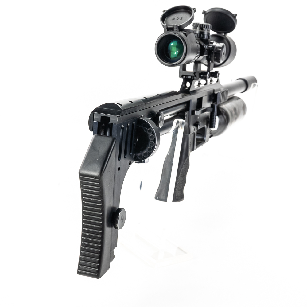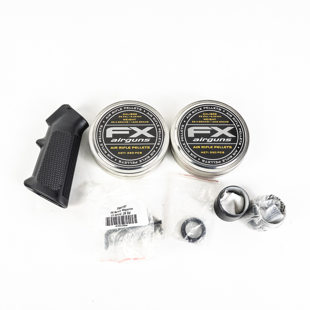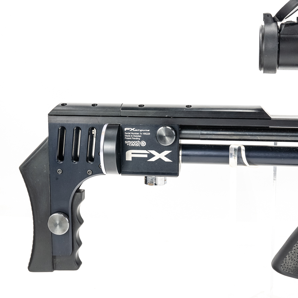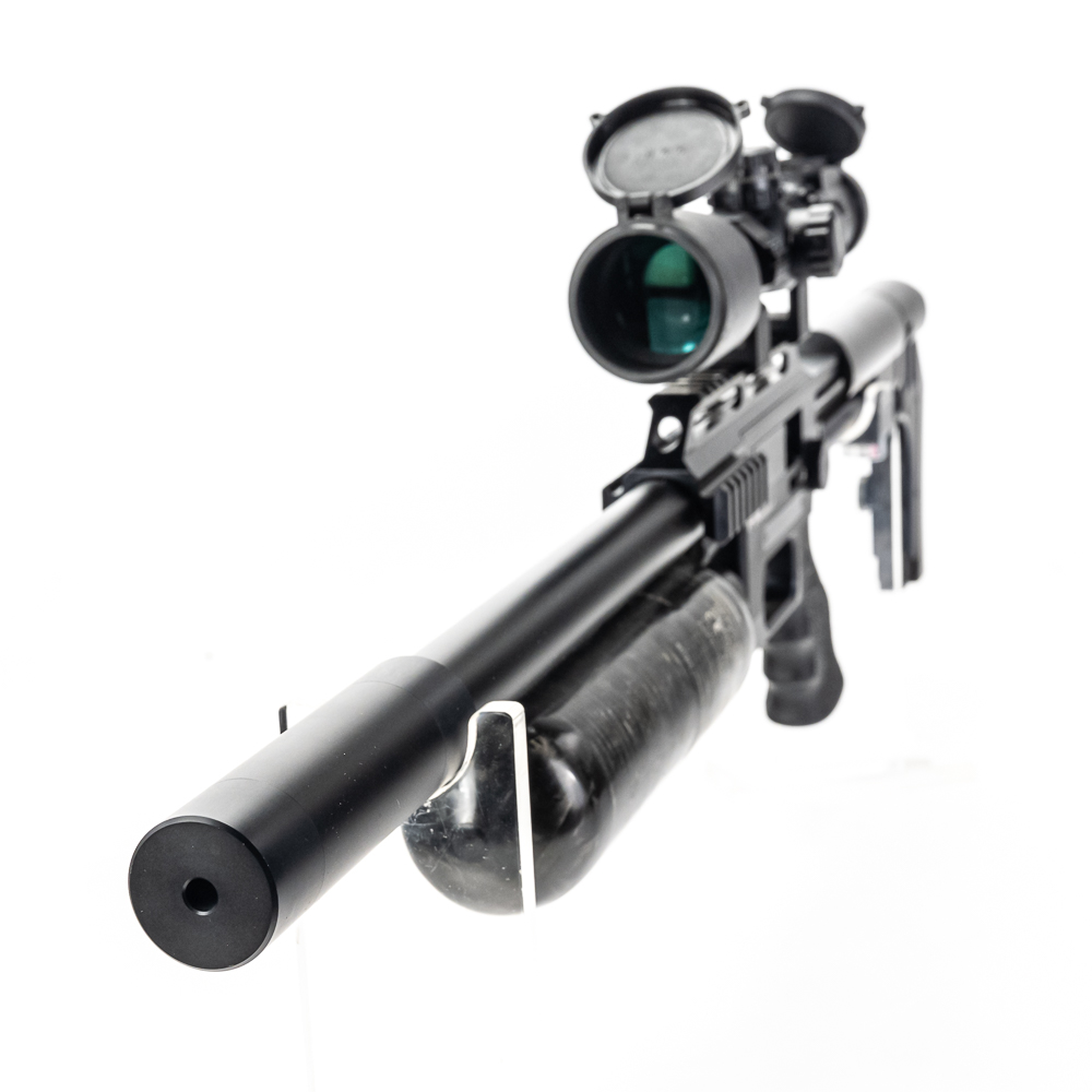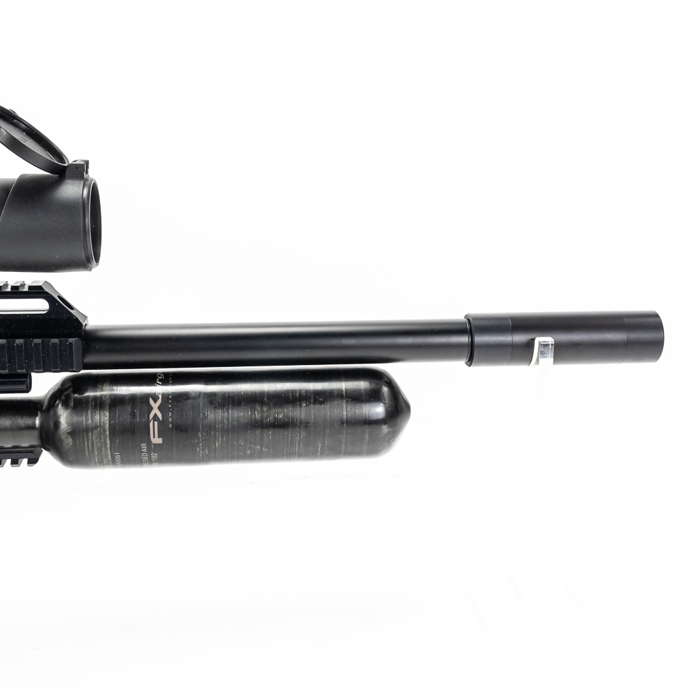 FX Impact M4 Compact Air Rifle. Caliber 6.35mm pellet. Swedish built, extremely high quality PCP (PreCharged Pneumatic) Air rifle is made for competition level target shooting. High end full metal stock air rifle is in excellent used condition and comes with AccuShot 4-16 illuminated scope, and factory sound moderator. Rifle comes with original factory hard case for rifle in disassembled state and factory sold case for rifle fully assembled. Very nice low noise target rifle with all the goodies. See photos.