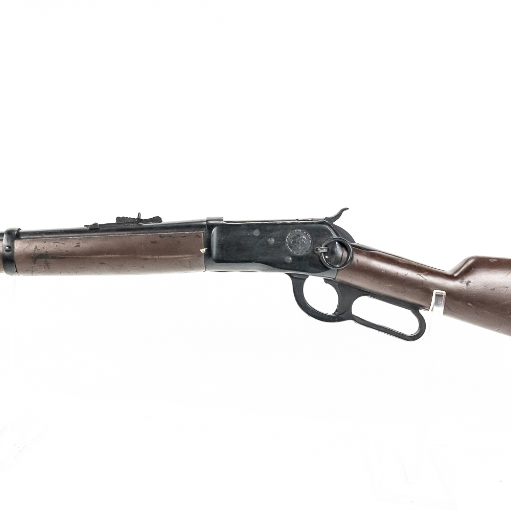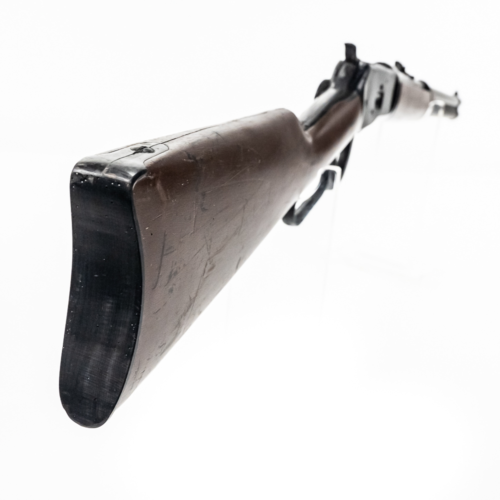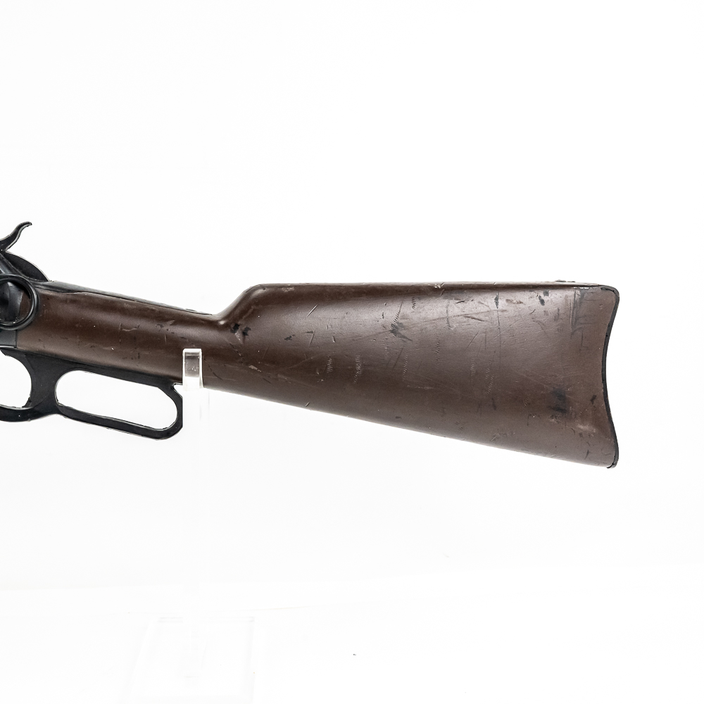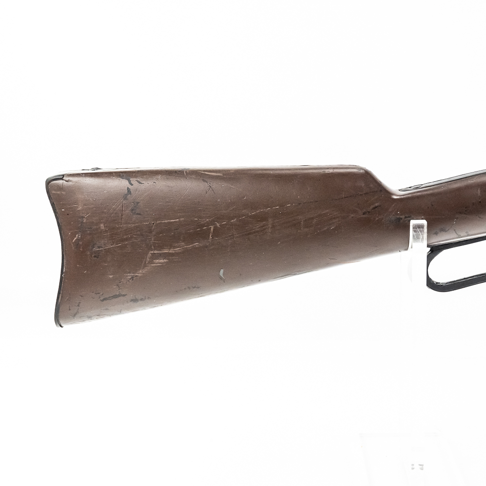 Western Stage Props made Hard rubber construction full size replica of Winchester model 1892 rifle. Non metal full size copy of Winchester 1892 carbine model rifle made for stunt and prop usage in western movies. Prop rifle is in excellent used condition with dents, dings and scratches from being used as movie and television prop. These items rent to movies for $50 per day and are seldom found for sale. Excellent display item for a man cave or movie room. See photos.