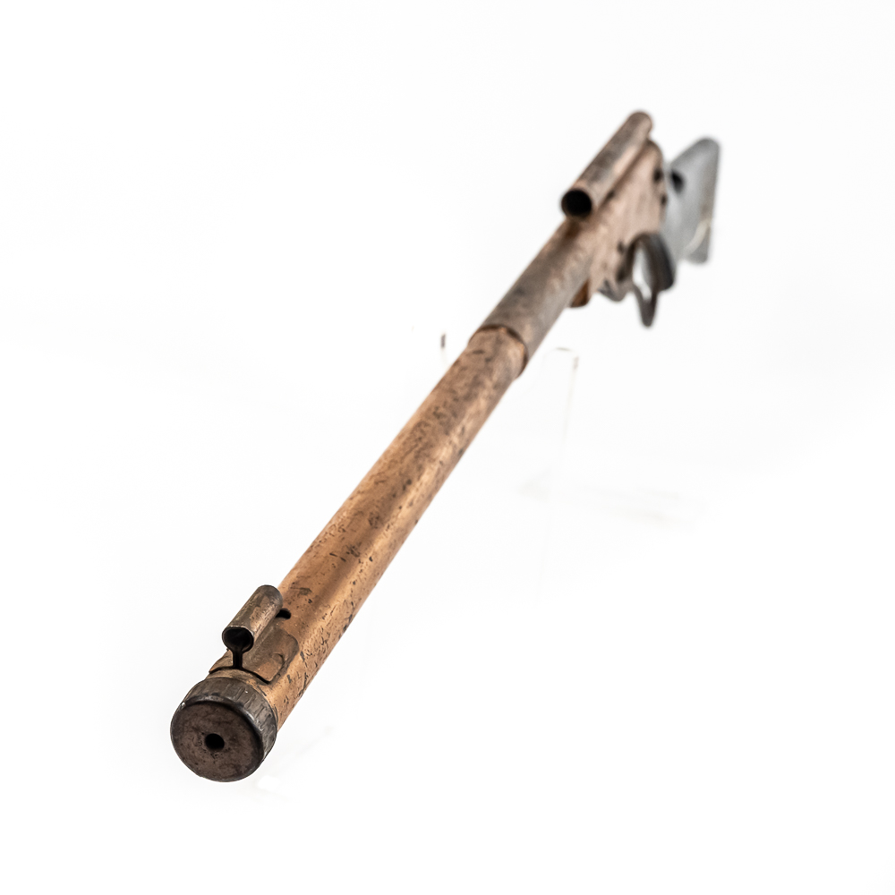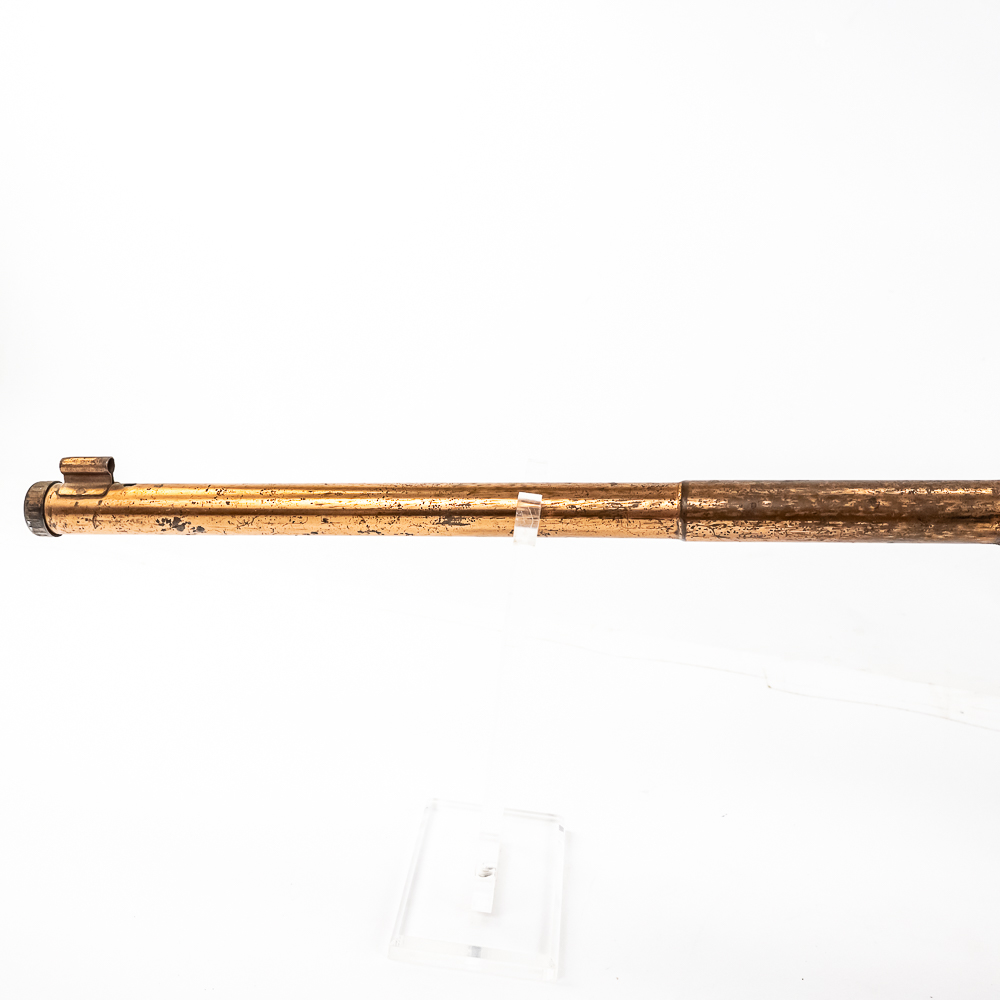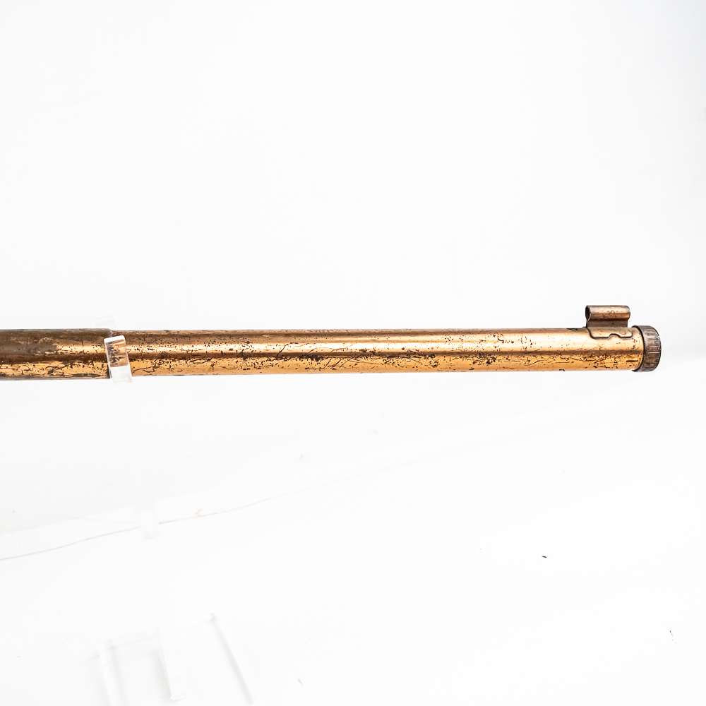 The metal retains about 75% of the original copper plate finish with some patina; giving it some vintage appeal. The wood stock is in about 85% original condition with most of the decal still intact.