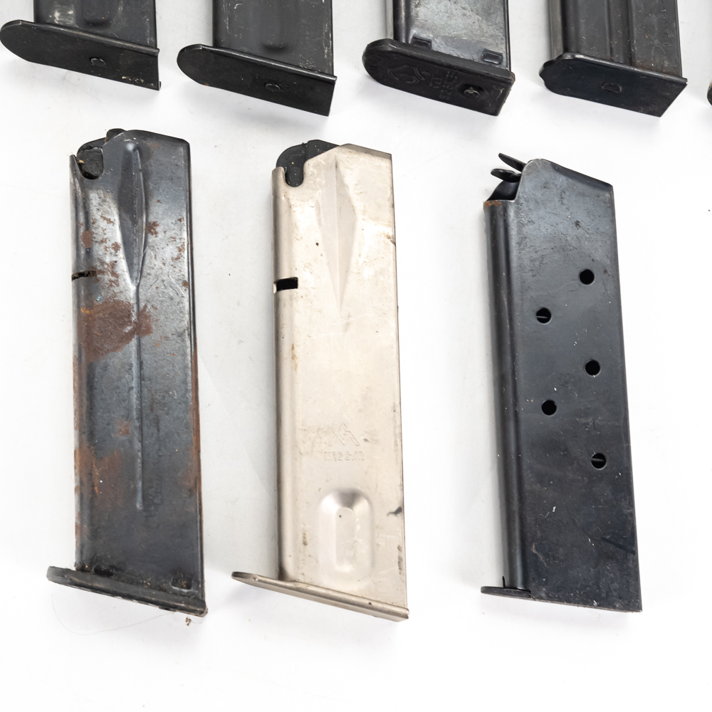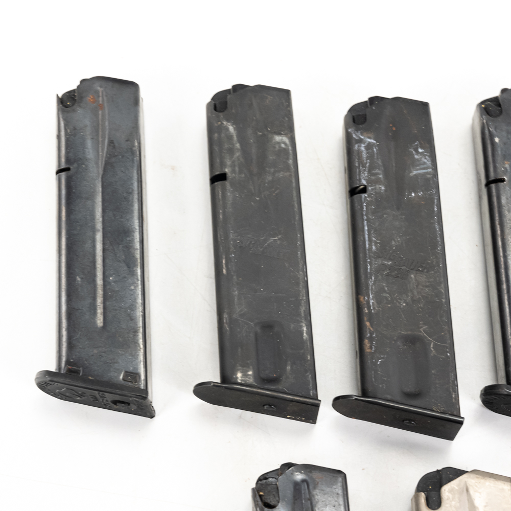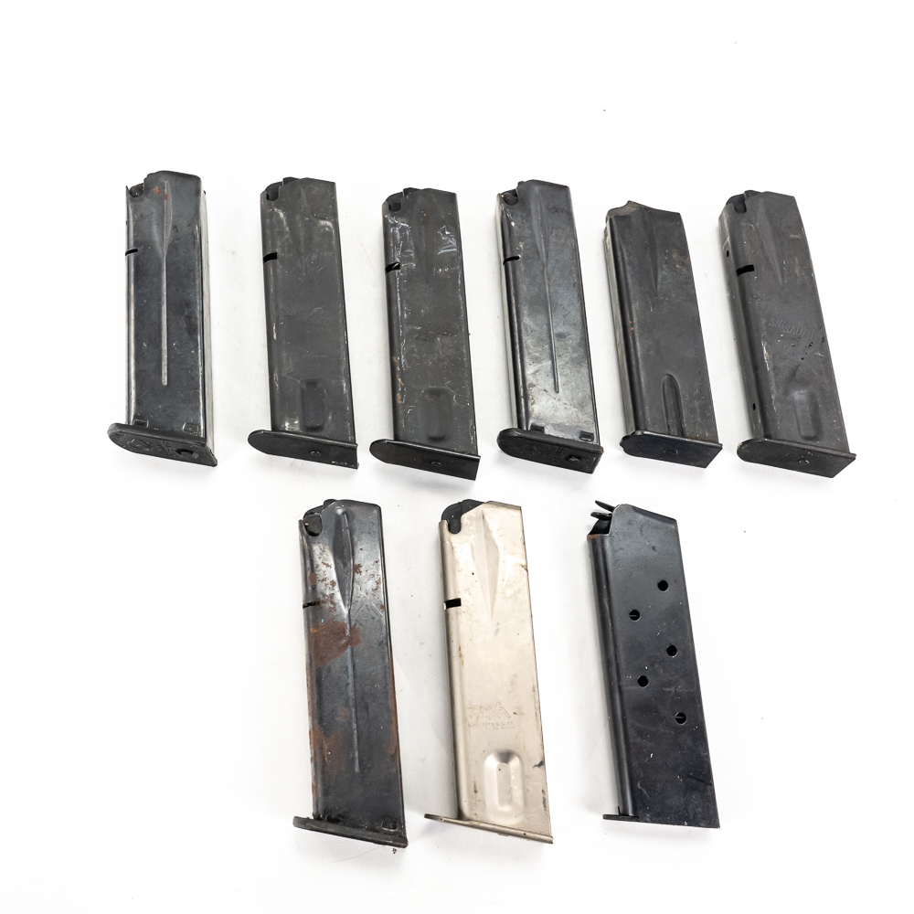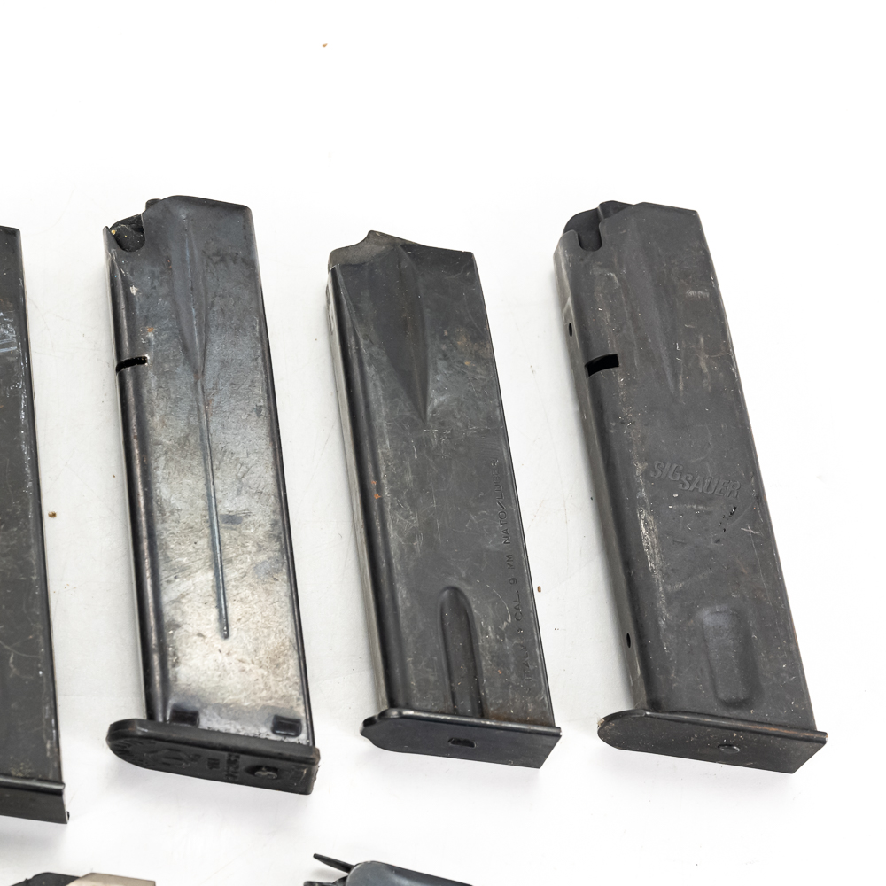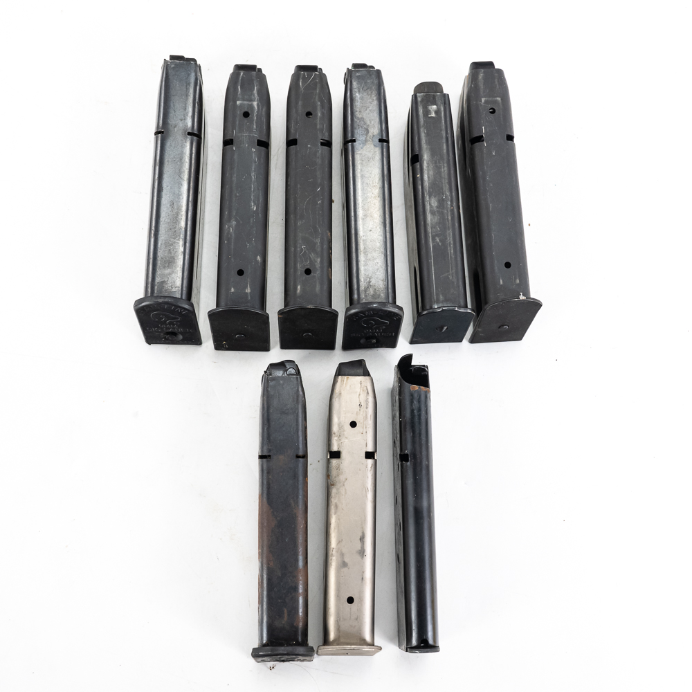 9 assorted pistol magazines. 3 Sig P226 15rd magazines. 3 Ram-line 15rd mags for Sig P226. 1 MecGar 15rd magazine for Sig P226. 1 Beretta m92 15rd magazine. and 1 Colt 1911 .45ACP magazine. Magazines range from brand new to well worn. Nice reseller lot! See photos.