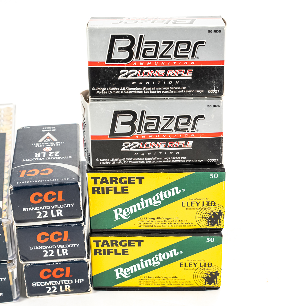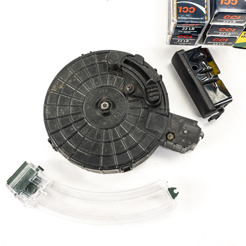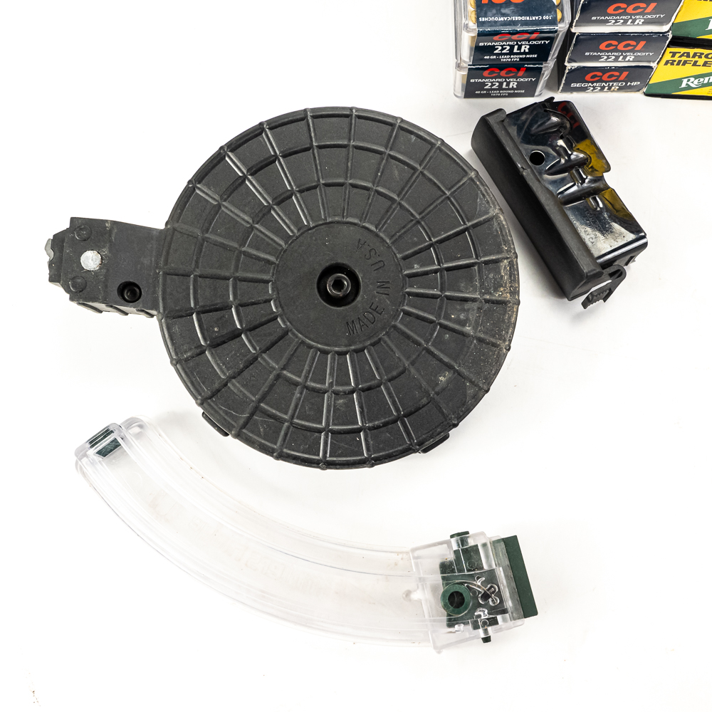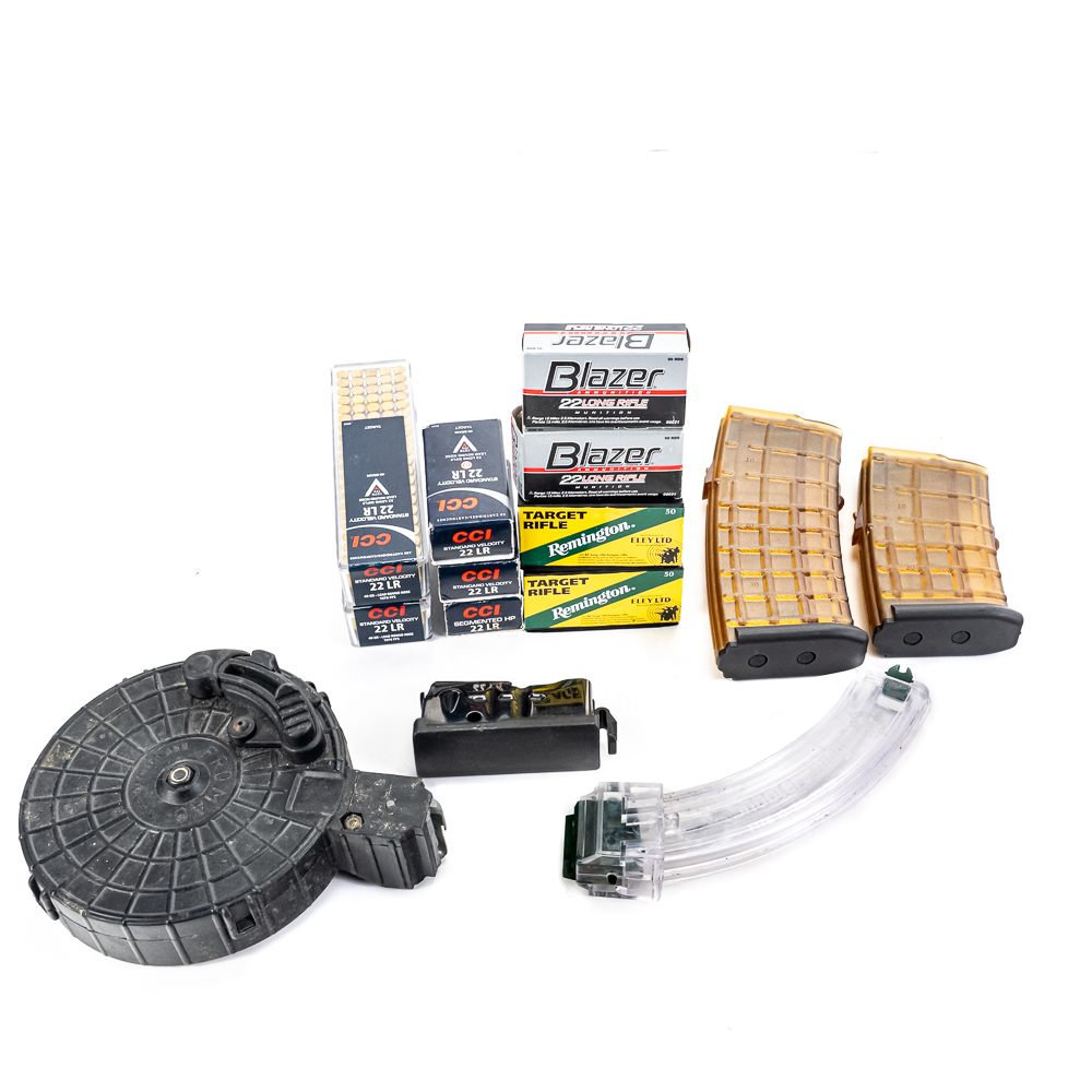 550 rounds of caliber .22LR ammunition from mixed manufacturers. Lot also includes 50 and 25 round drum magazines for 10/22 rifle, Savage .308 box magazine, and 2 rare MSAR magazines, 1 30 and 1 20 round magazine. Good plinking lot. See photos.