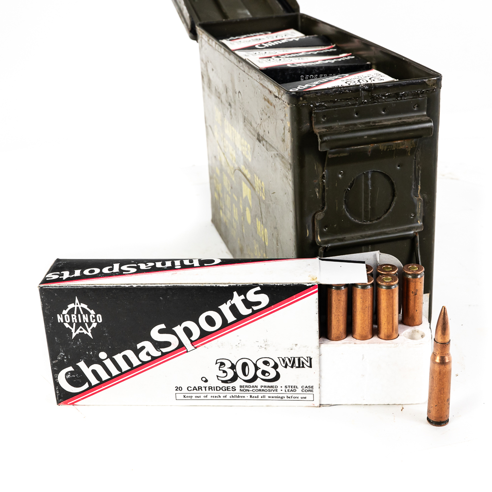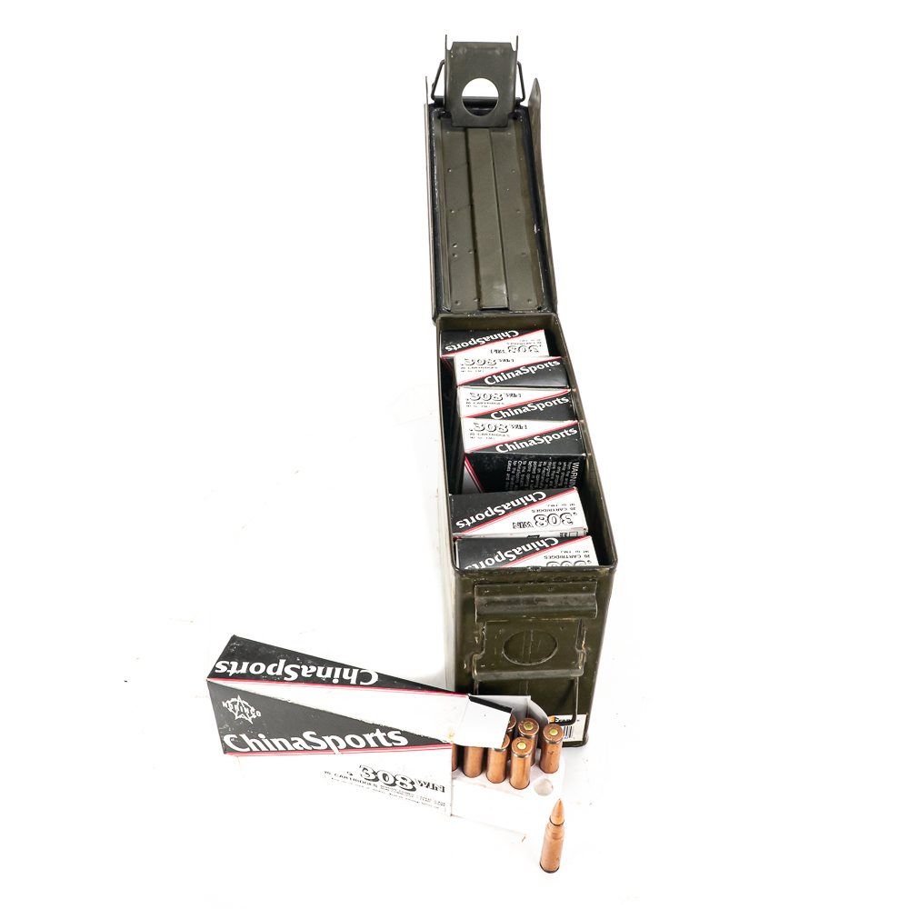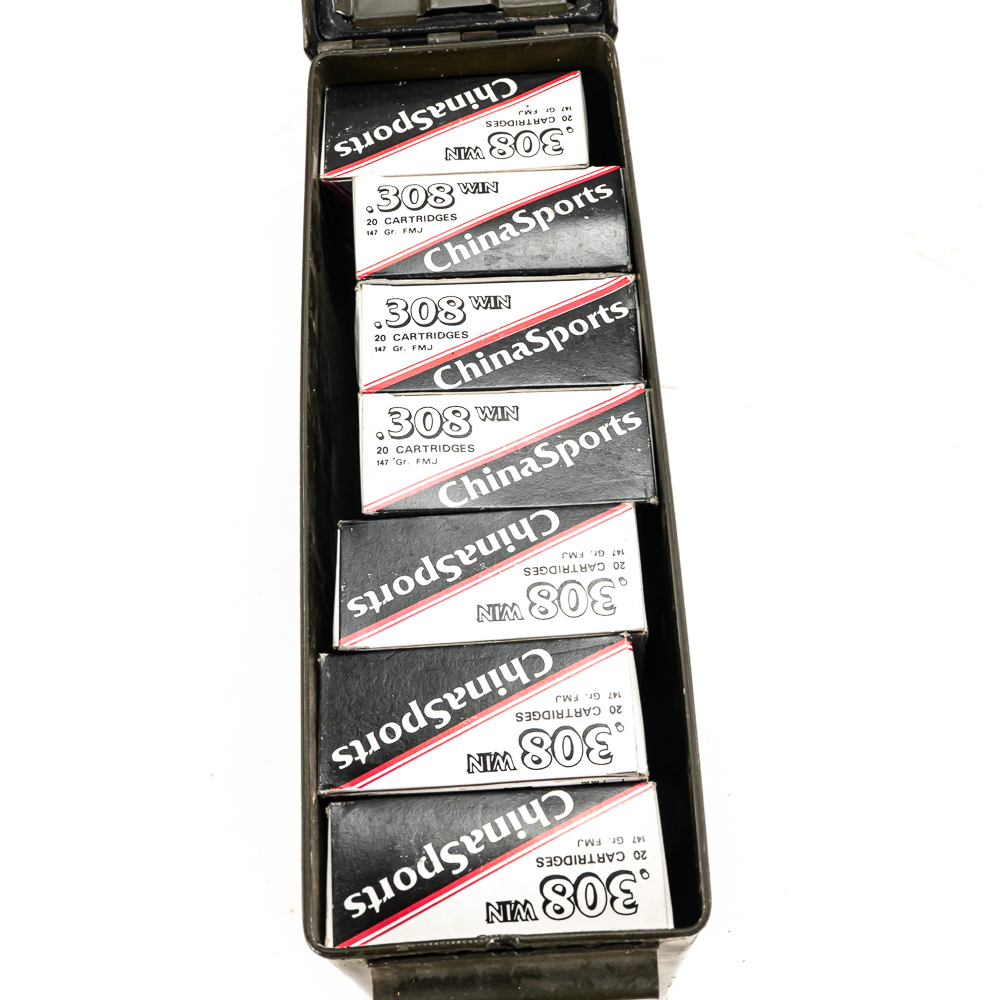 140 rounds of caliber .308 Winchester ammunition. Ammunition is Chinasports 147Gr. FMJ steel case ammunition in 20 round boxes in steel ammunition can. Good collector or stockpile ammunition that is hard to find. See photos.