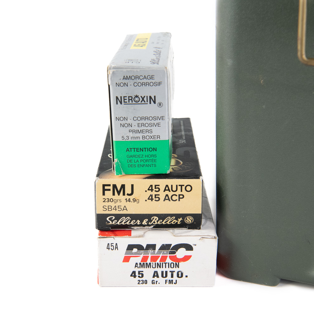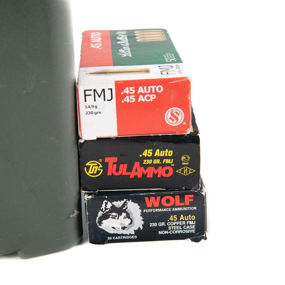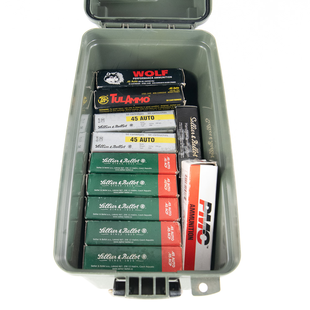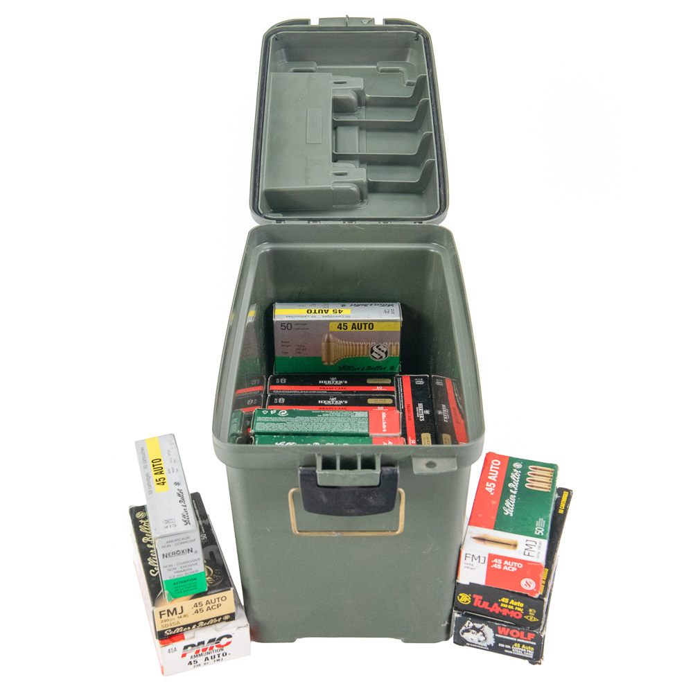 1100 rounds of caliber .45 ACP/.45Auto ammunition. Ammunition is mixed manufacturer modern brass and steelcased ammunition. Ammunition is packaged in 50rd boxes in plastic ammunition can. Good range ammunition. See photos.