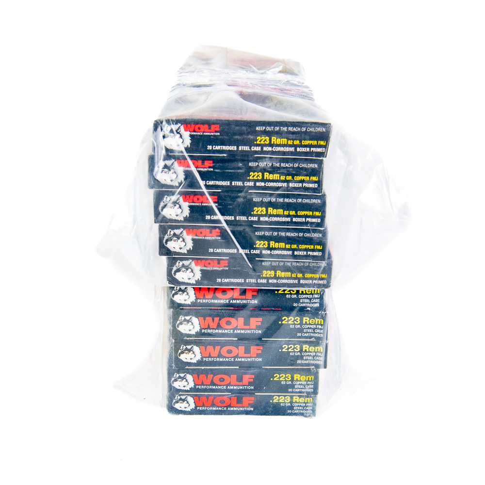 1000 rounds of caliber .223 Remington ammunition. Ammunition is Wolf 62gr FMJ steel case ammunition in 20 round boxes in plastic sleeve. Good collector or stockpile ammunition that is no longer imported. See photos.