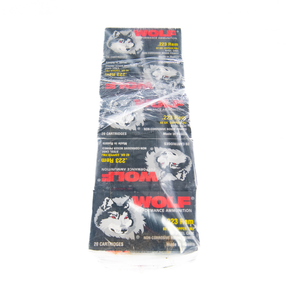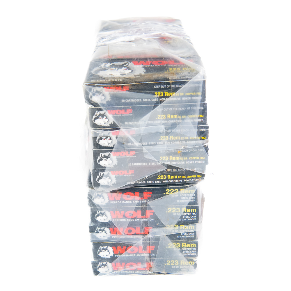 1000 rounds of caliber .223 Remington ammunition. Ammunition is Wolf 62gr FMJ steel case ammunition in 20 round boxes in plastic sleeve. Good collector or stockpile ammunition that is no longer imported. See photos.