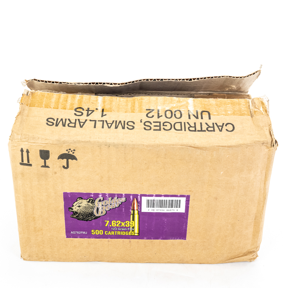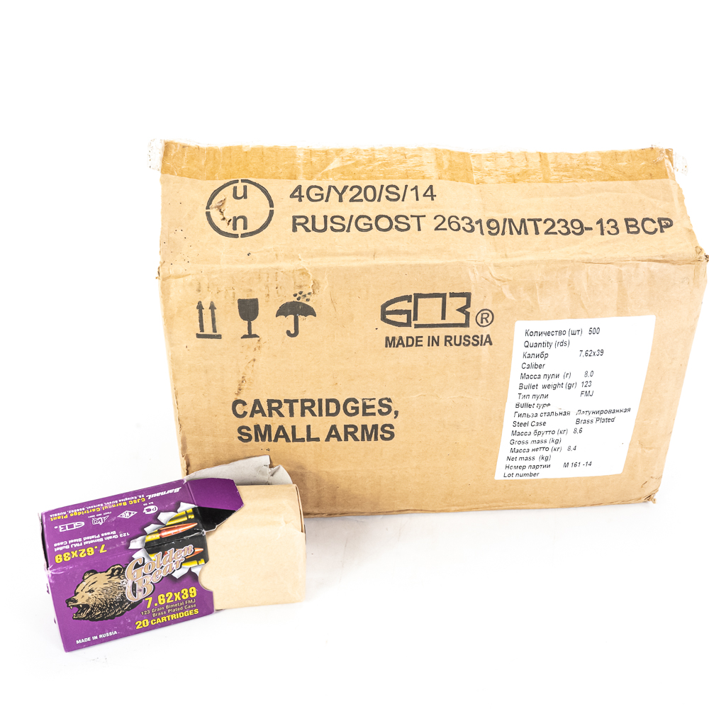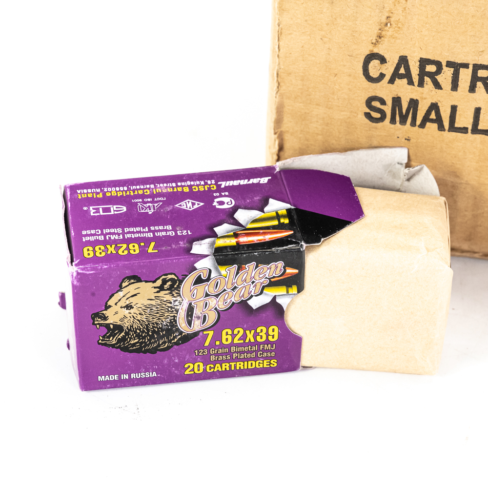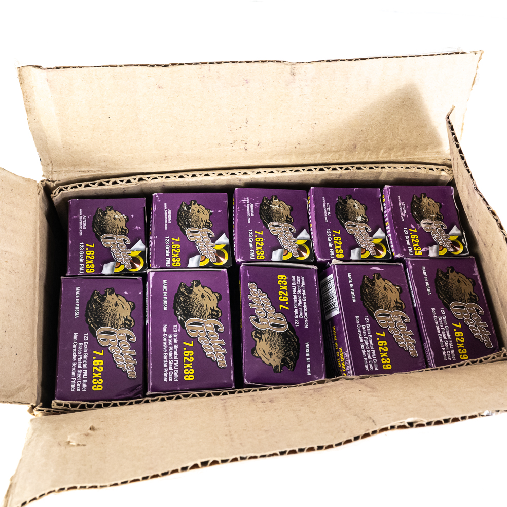 500 rounds of caliber 7.62×39 ammunition. ammunition is Golden Bear steel case 123gr. FMJ ammunition. Ammunition is packed in 20rd boxes. Great stockpile or range ammunition. See photos.