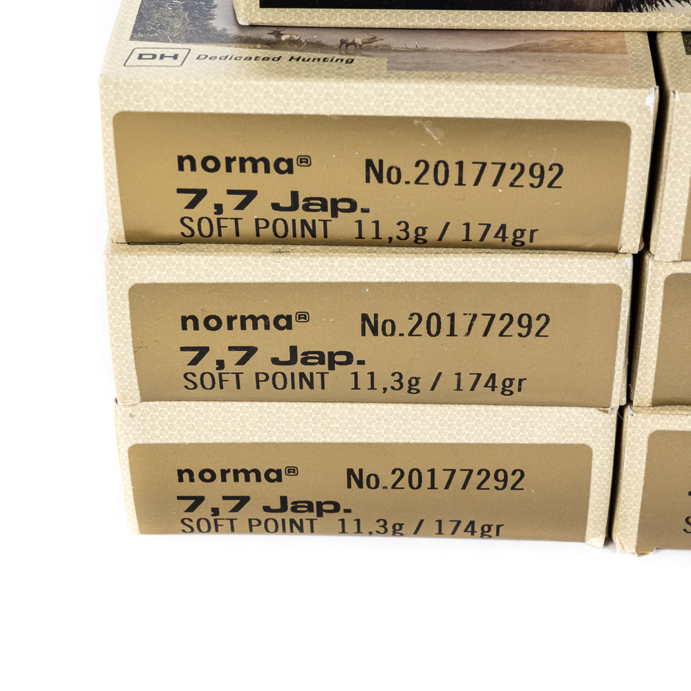 140 rounds of caliber 7.7 Japanese rifle ammunition. Norma produced commercial ammunition from Sweden. All ammunition is 174gr. Soft Point hunting ammunition. High Quality and hard to find ammunition. See photos.