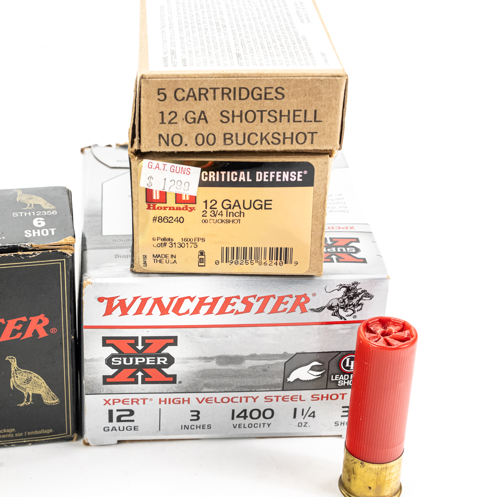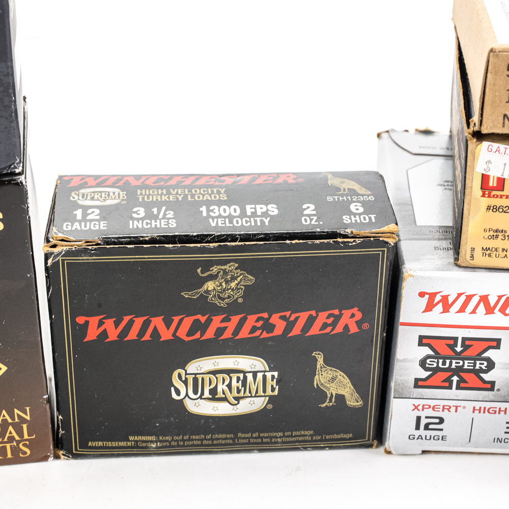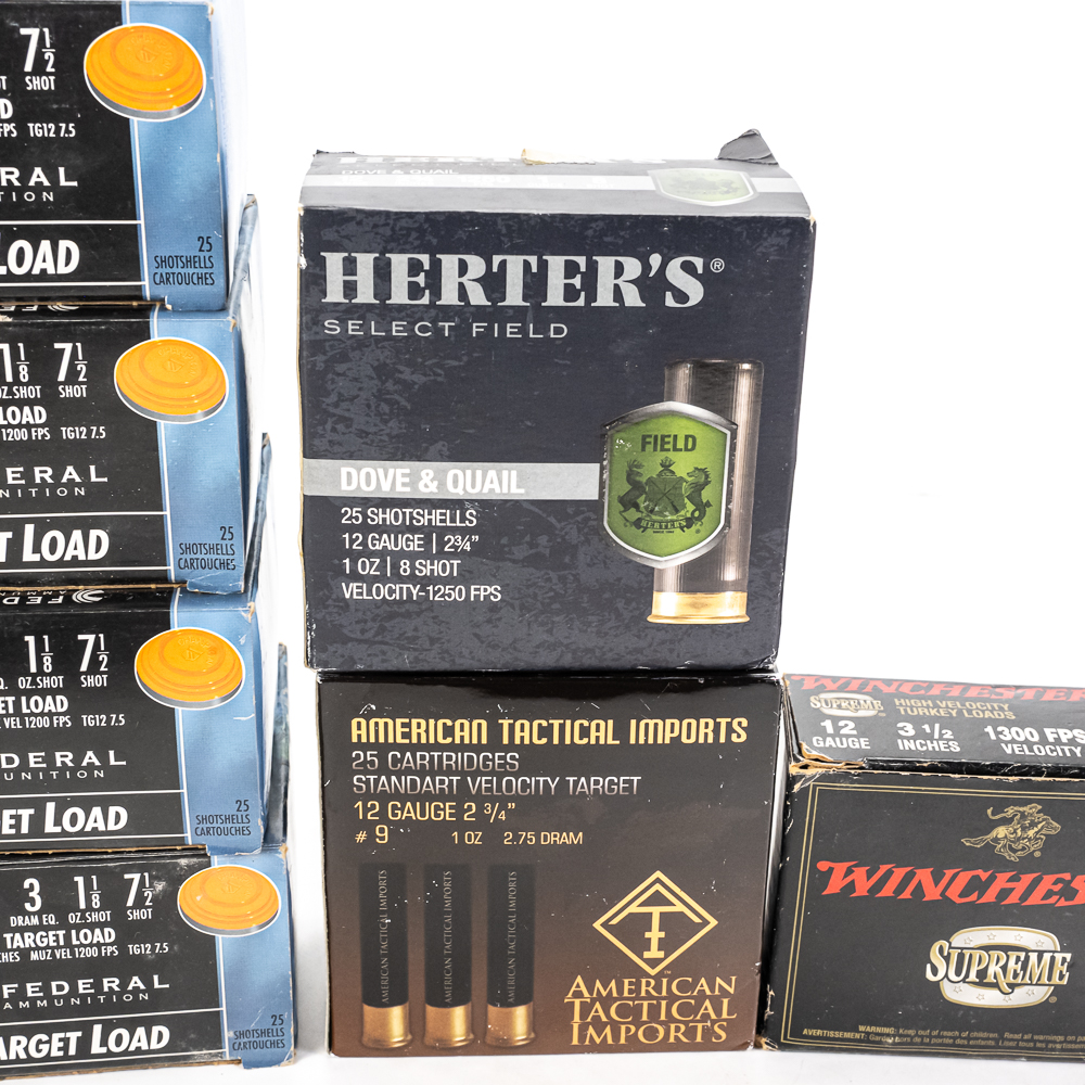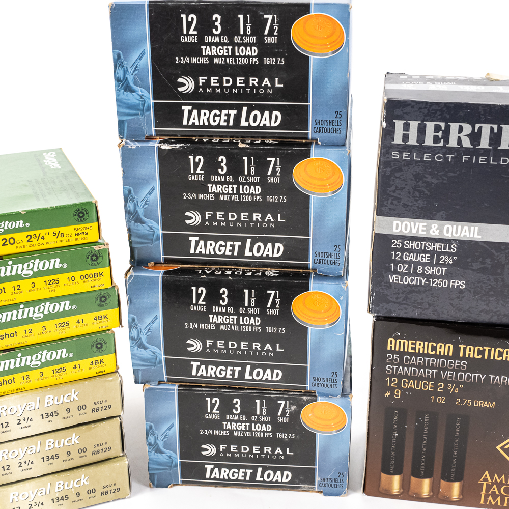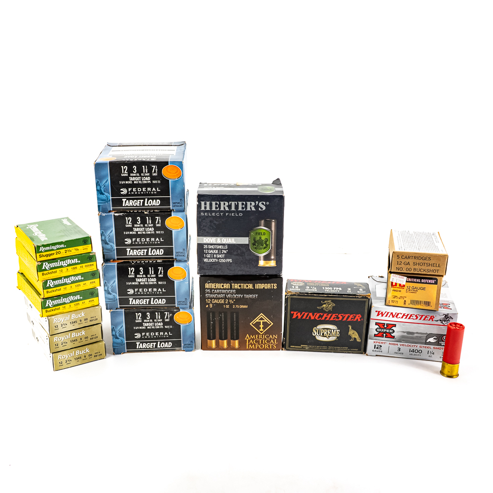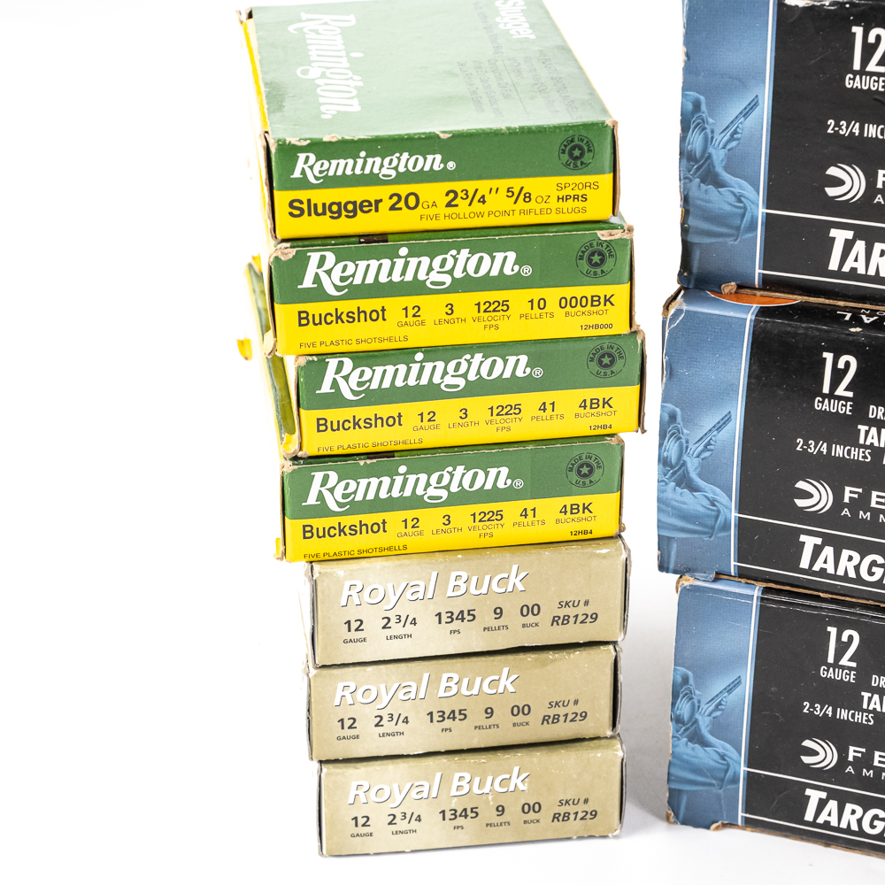 210 rounds of caliber 12ga. shotgun ammunition. Mixed manufacturers, shot sizes and shell lengths. Lot includes target ammunition, hunting ammunition and buckshot. Lot also includes 4 rounds of 20ga slugs. Great blasting ammunition. See photos.
