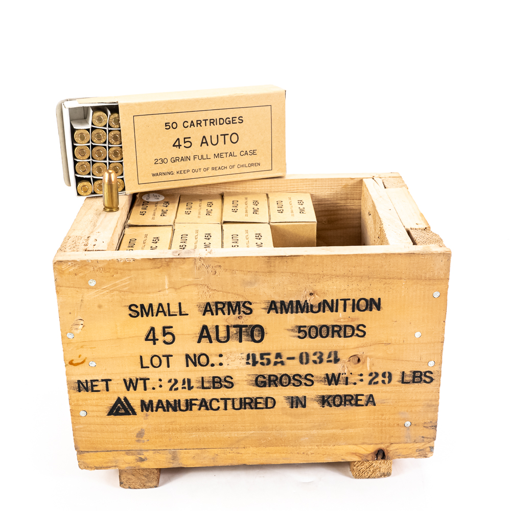 800 rounds of caliber .45ACP pistol ammunition. Ammunition is 230grain Ball FMJ ammunition made in South Korea by PMC. Ammunition is packed in 50 round boxes in wooden crate. Excellent stockpile ammunition. See photos.