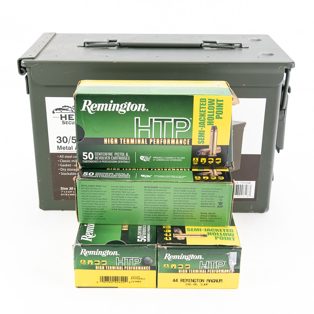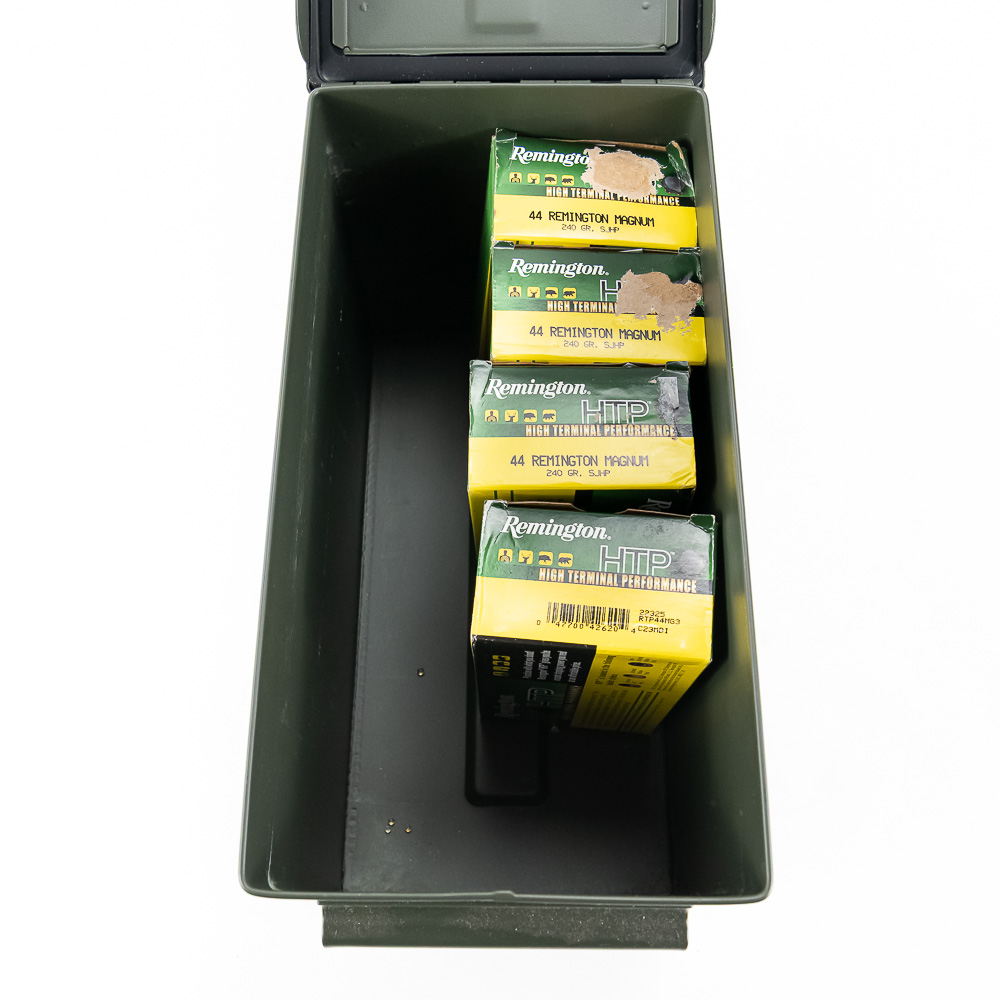 200 rounds of caliber .44 Magnum ammunition. Ammunition is factory Remington 240gr. SJHP hunting ammunition loaded in 50 round boxes. Ammunition comes in metal .50 caliber ammunition can. Excellent Whitetail ammunition. See photos.