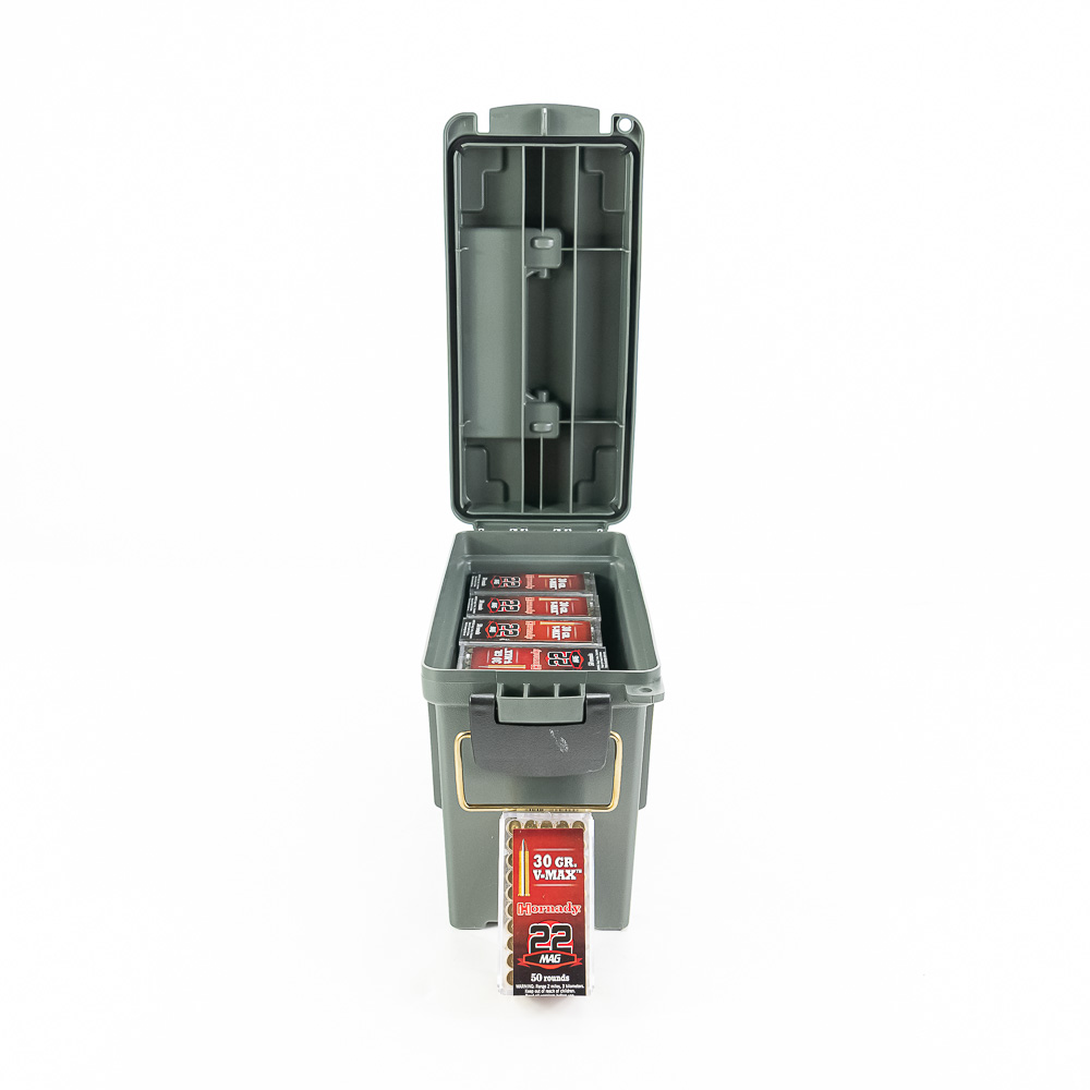 900 rounds of caliber .22 Magnum ammunition. Ammunition is factory Hornady 30gr. V-Max ammunition. Ammunition is packed in 50 round boxes in plastic ammunition can. Excellent target or small game ammunition. See photos.
