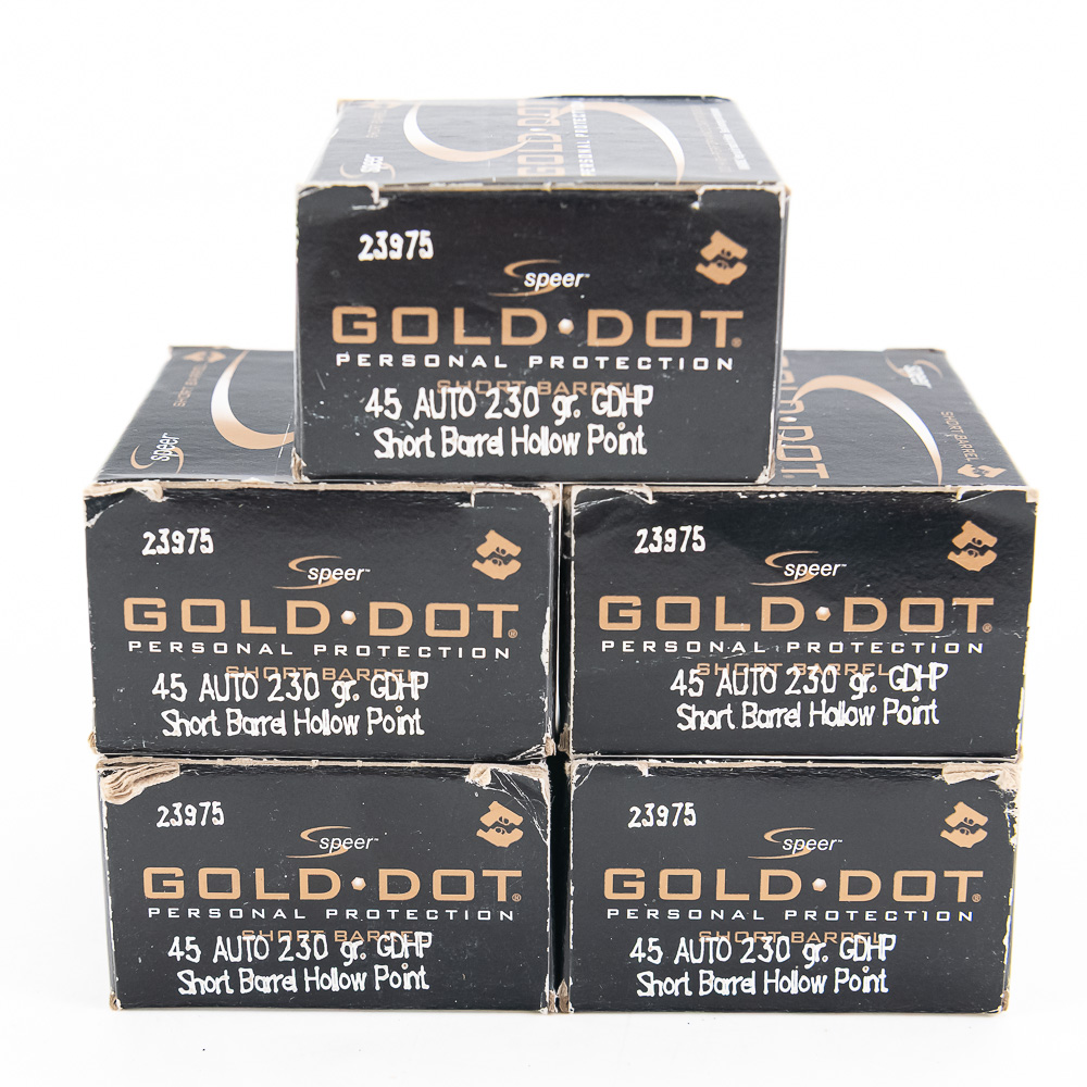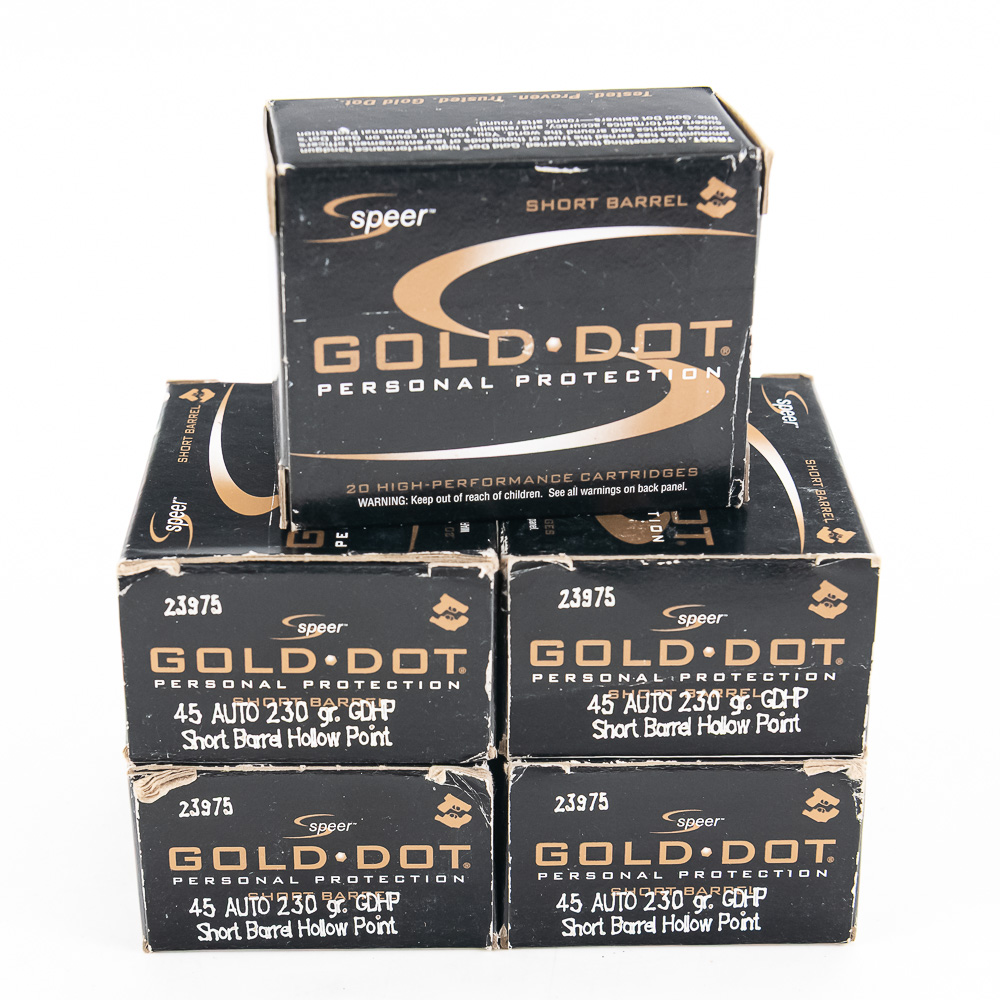 100 rounds of caliber .45ACP Ammunition. Ammunition is Factory Speer 230gr. JHP short barrel special loads. Ammunition is special loading made to give peak performance for shorter barreled firearms.