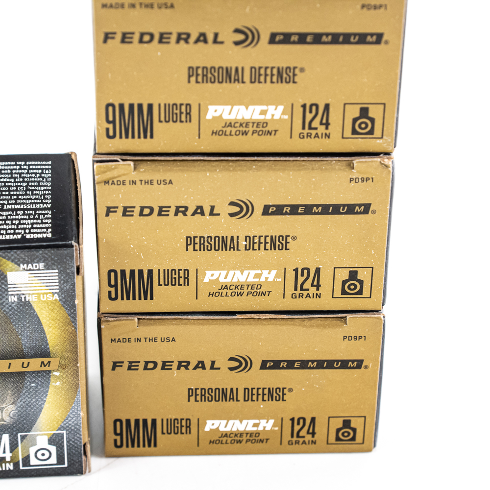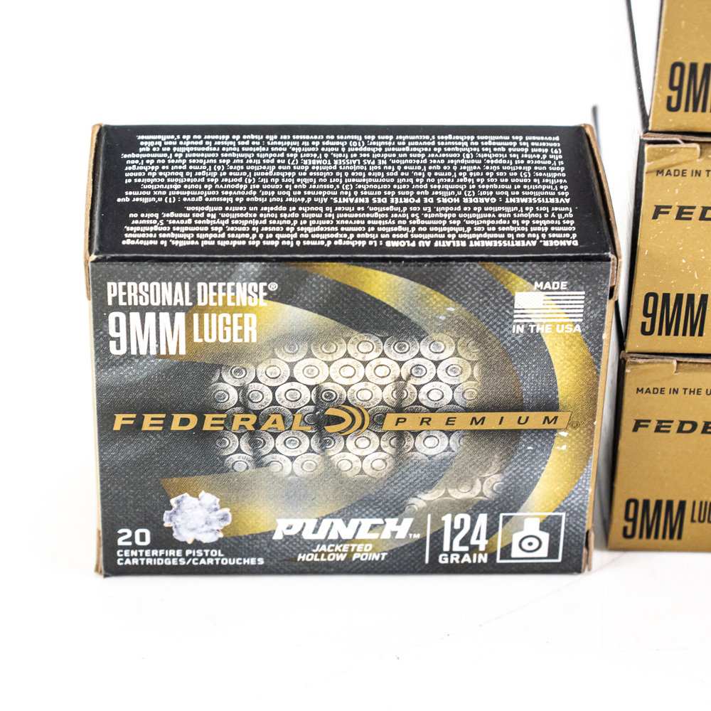 120 rounds of caliber 9mm Luger ammunition. Ammunition is Federal Punch 124gr. JHP ammunition. Ammunition is loaded in 20 round boxes. Excellent defensive ammunition. See photos.