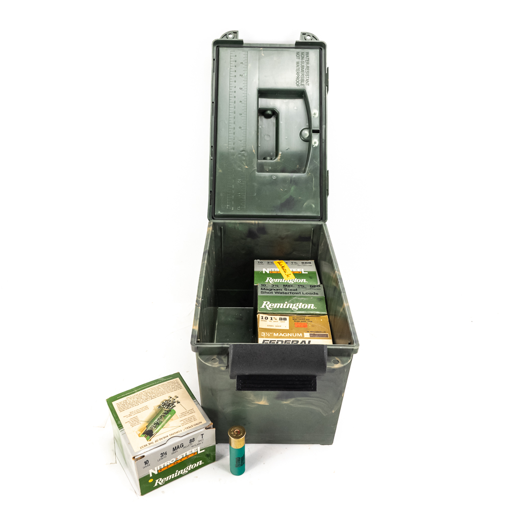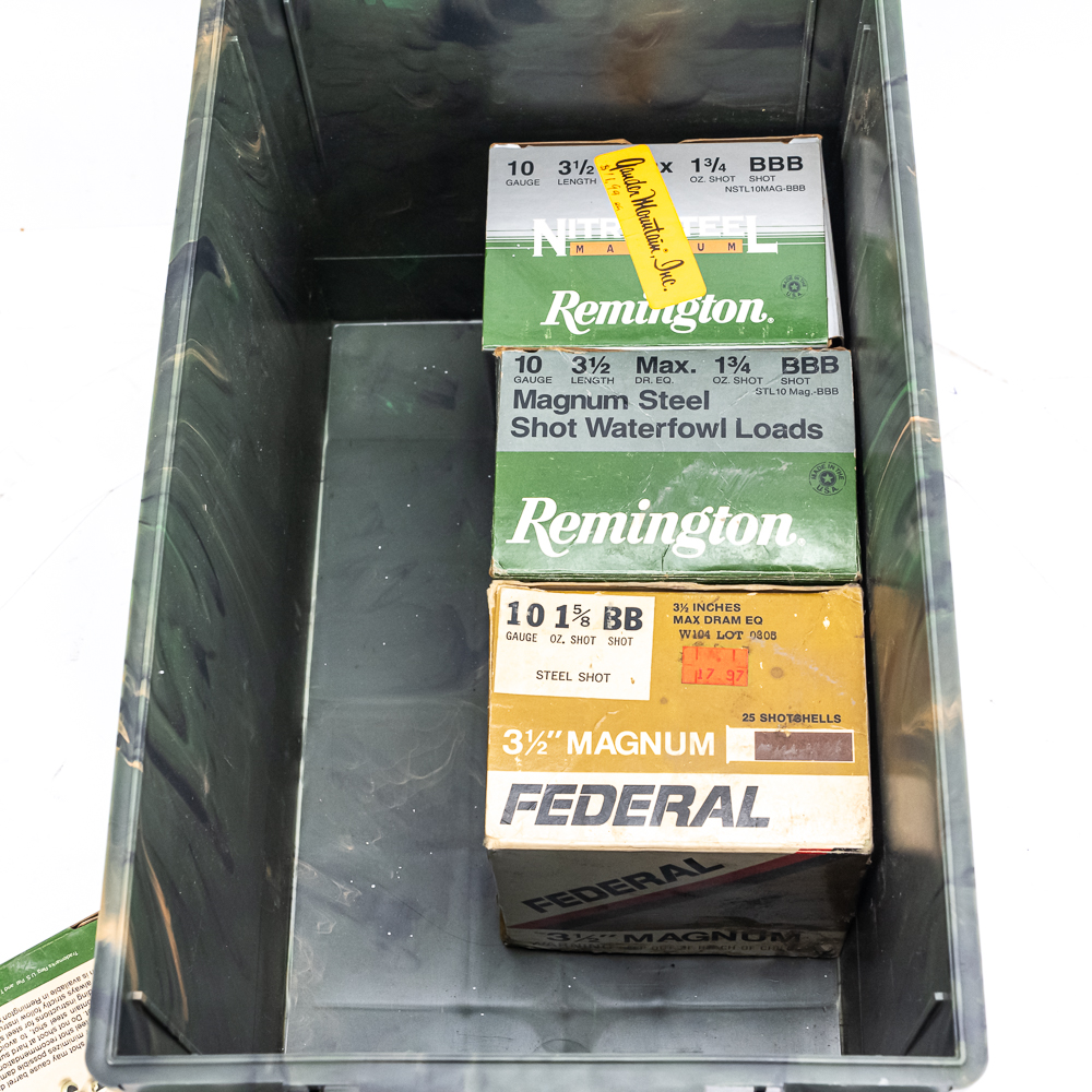 75+ rounds of caliber 10GA. Shotgun ammunition. Ammunition is Remington and Federal waterfowl ammunition. Shot sizes include BBB,BB and T shot. Ammunition comes in 25 round boxes, 2 full, 2 partial and in a plastic dry box. Excellent Snow Goose ammunition. See photos.