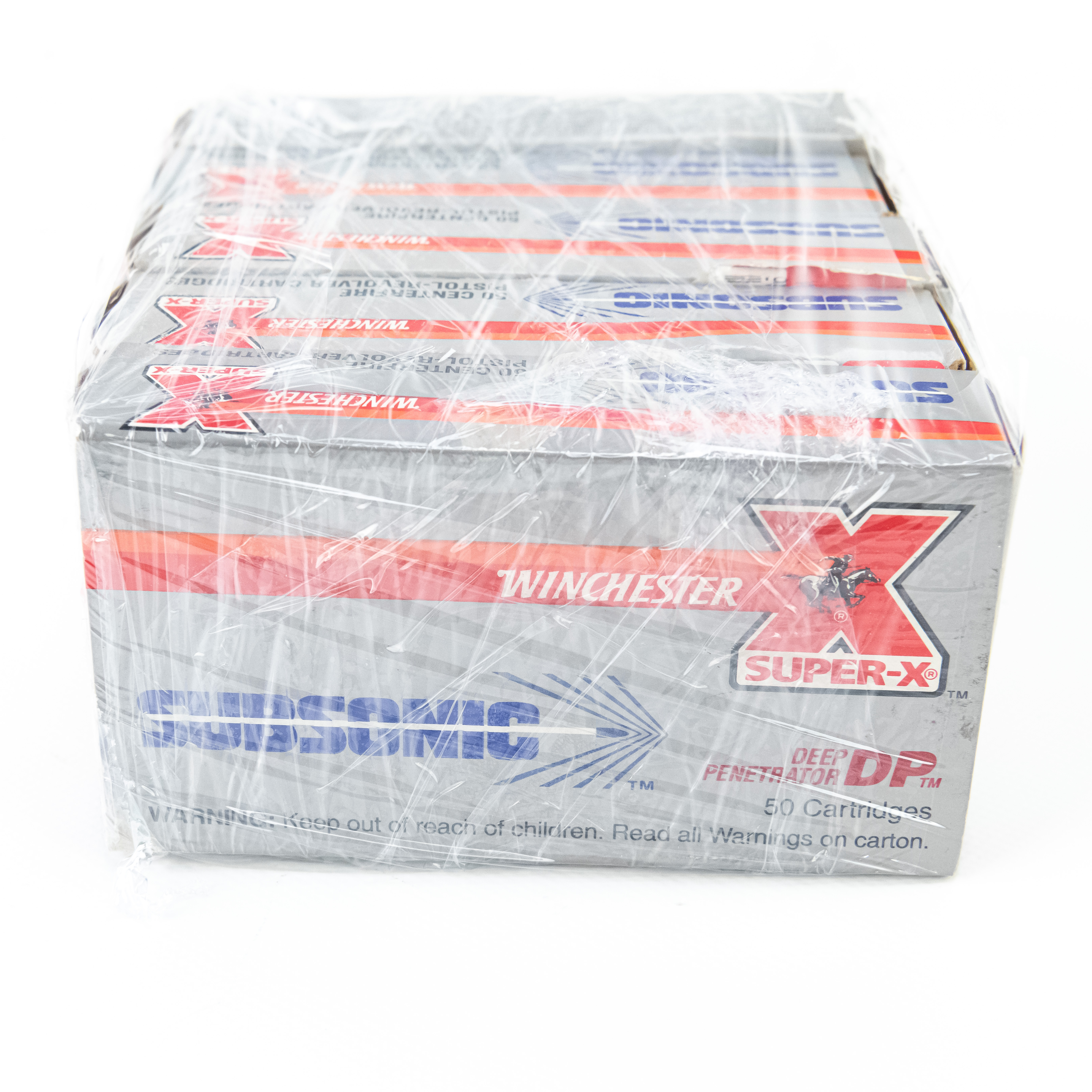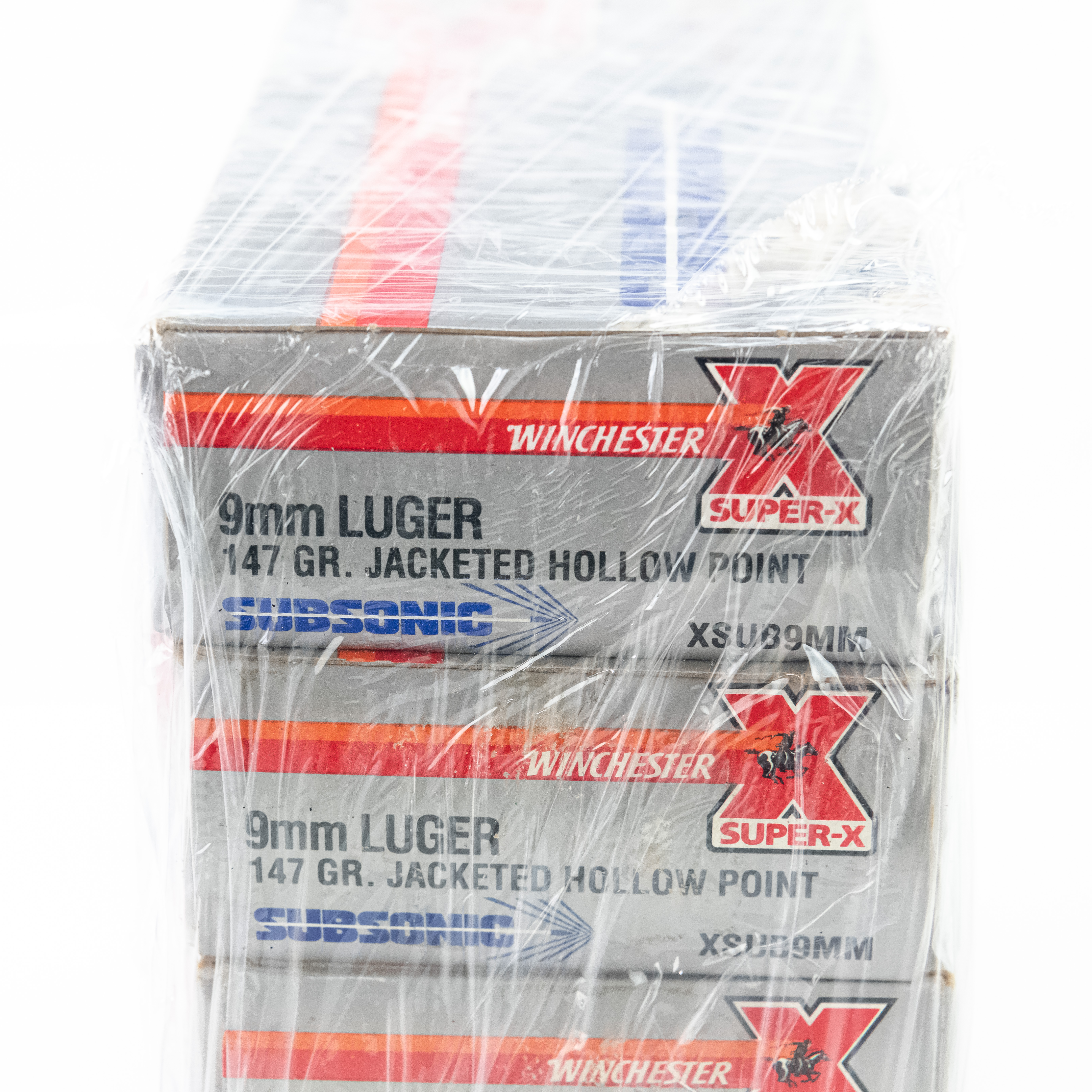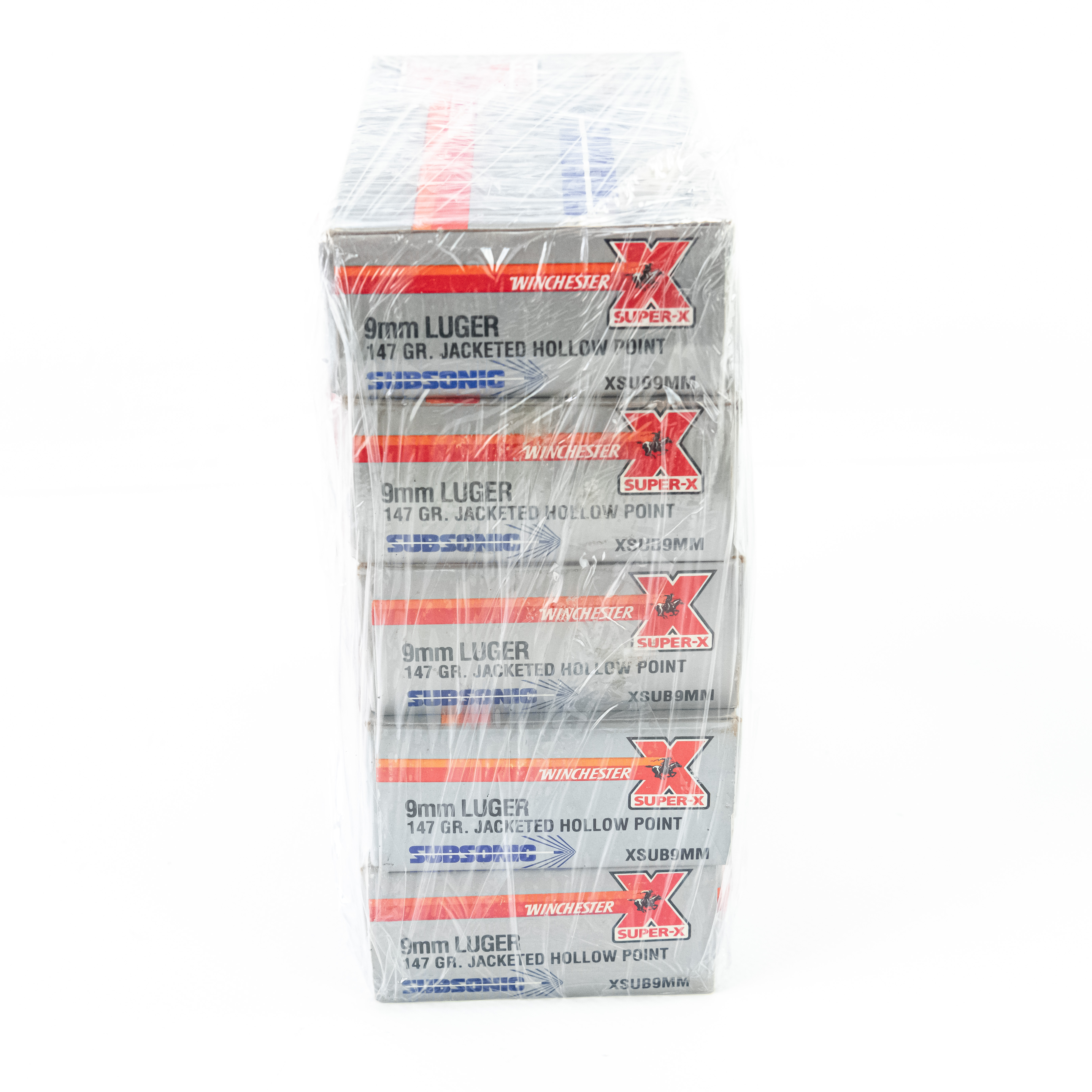 250 rounds of caliber 9mm Luger subsonic ammunition. Ammunition is older production Winchester Super-X 147gr. JHP ammunition. Ammunition is packed in 50 round boxes. No longer made ammunition is hard to find collector item or great for suppressed 9mm PCC. See photos.