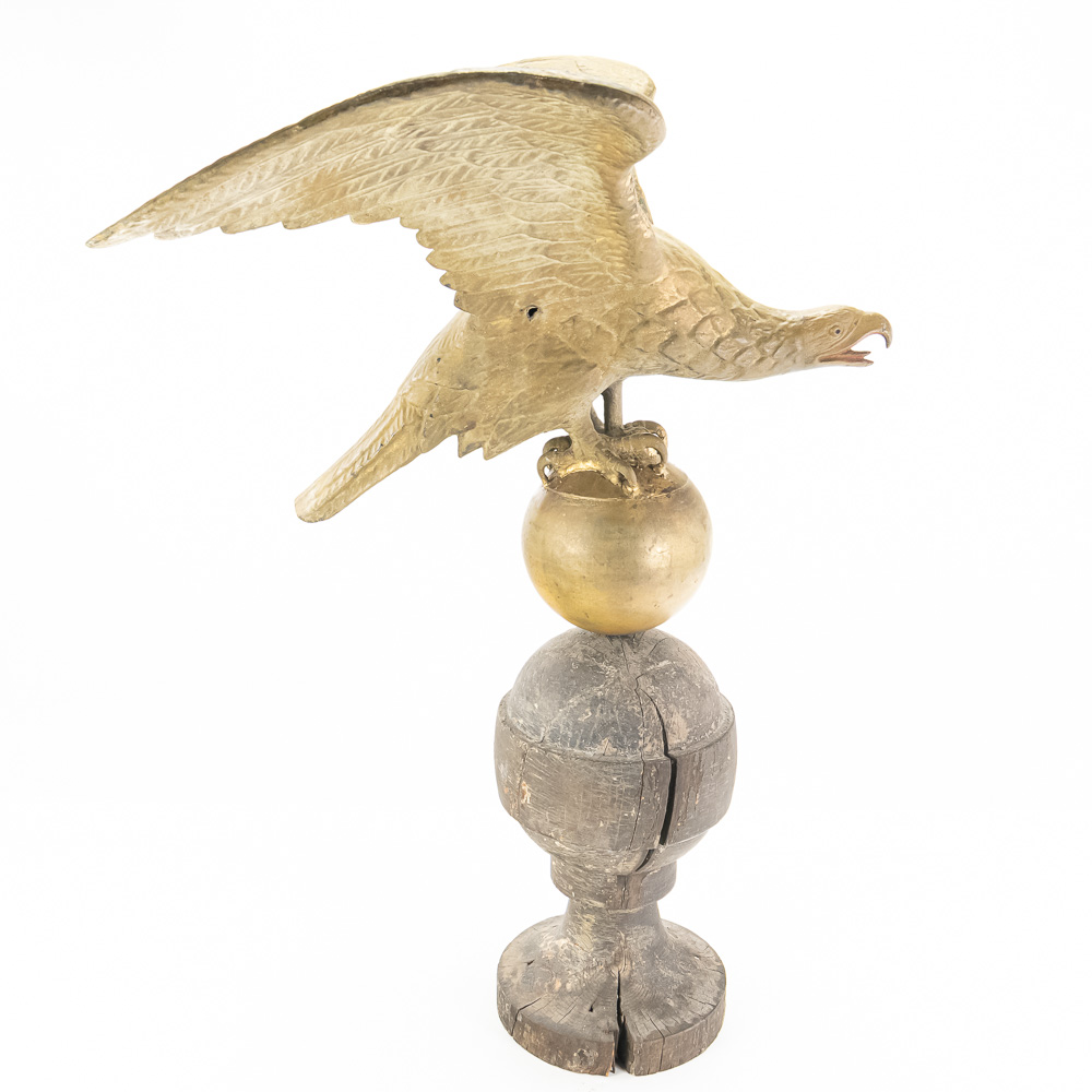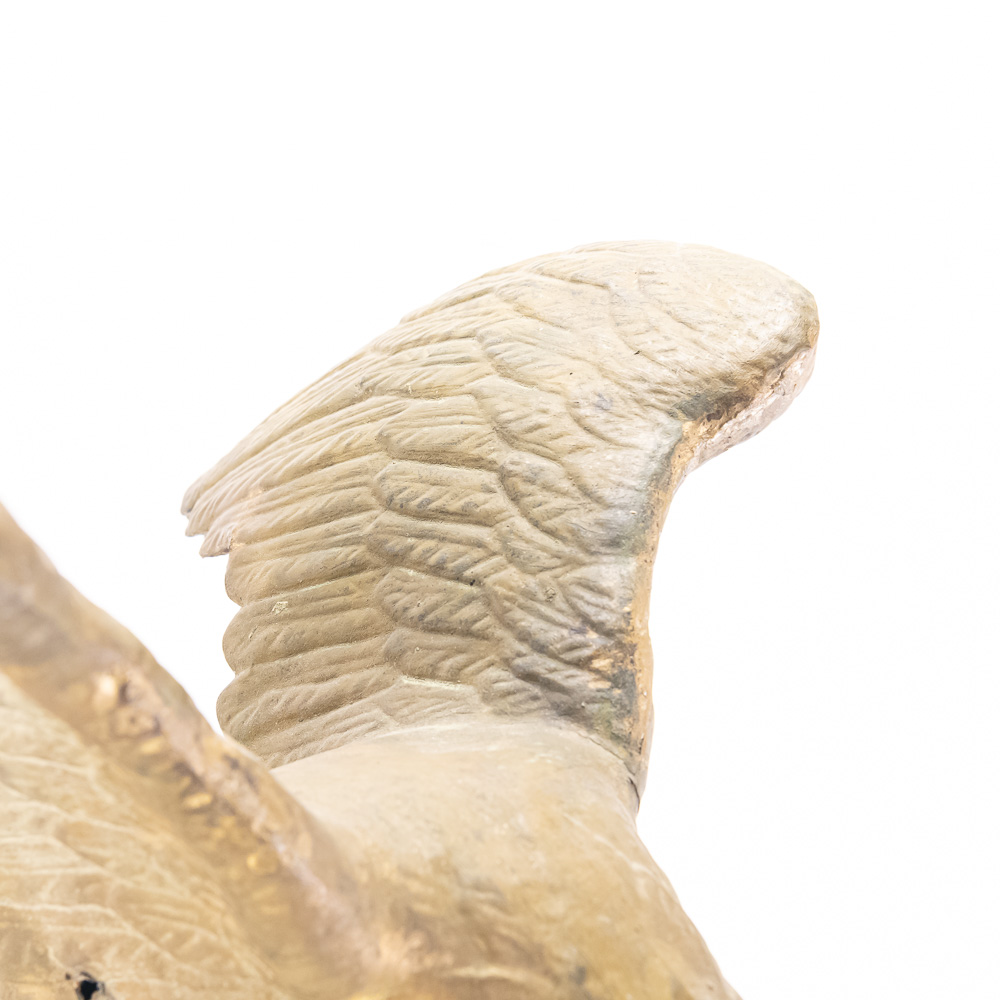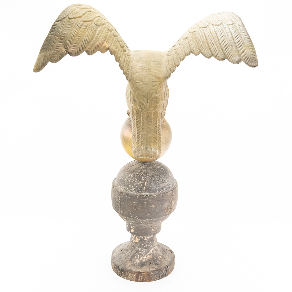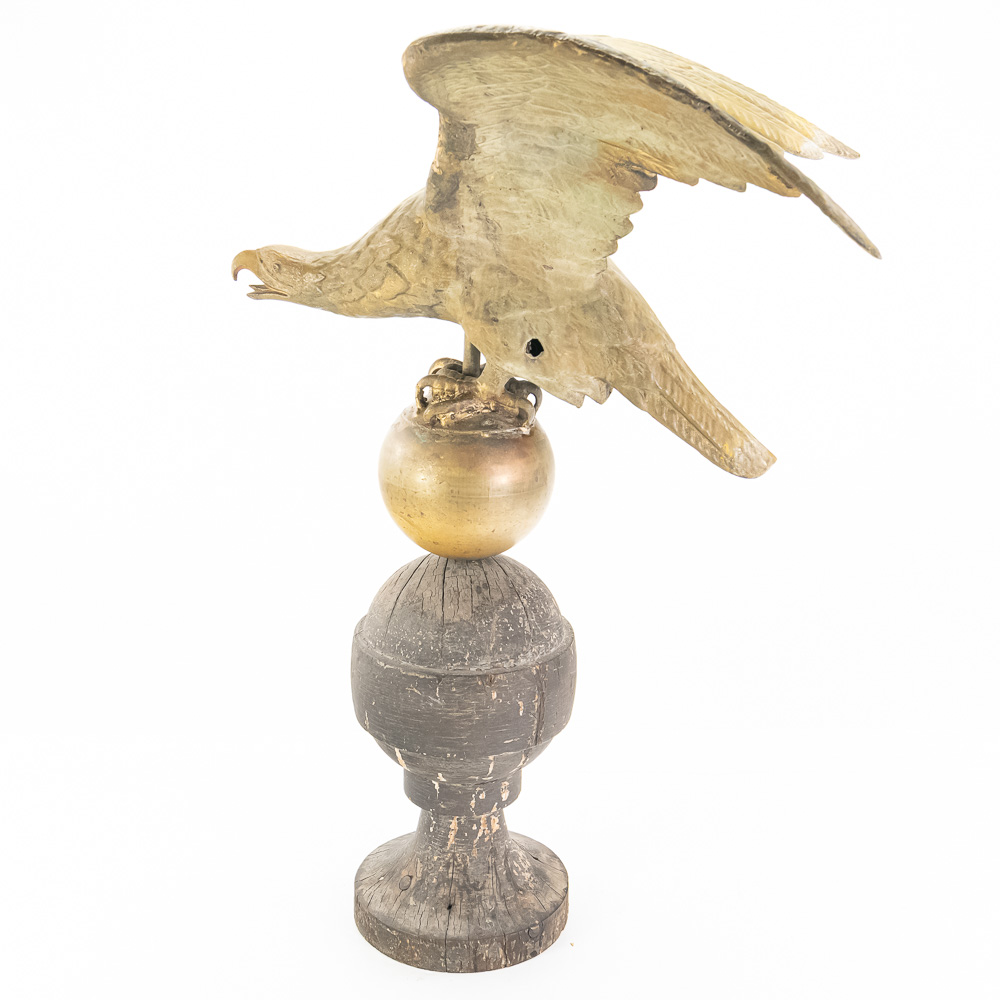Weather vane depicting an eagle in flight. Circa late 1800’s. Eagle has a few bullet holes. Matte gold finish, not gold or shiny. Wood base is most likely not original to the piece. It has been re-painted and has cracks.