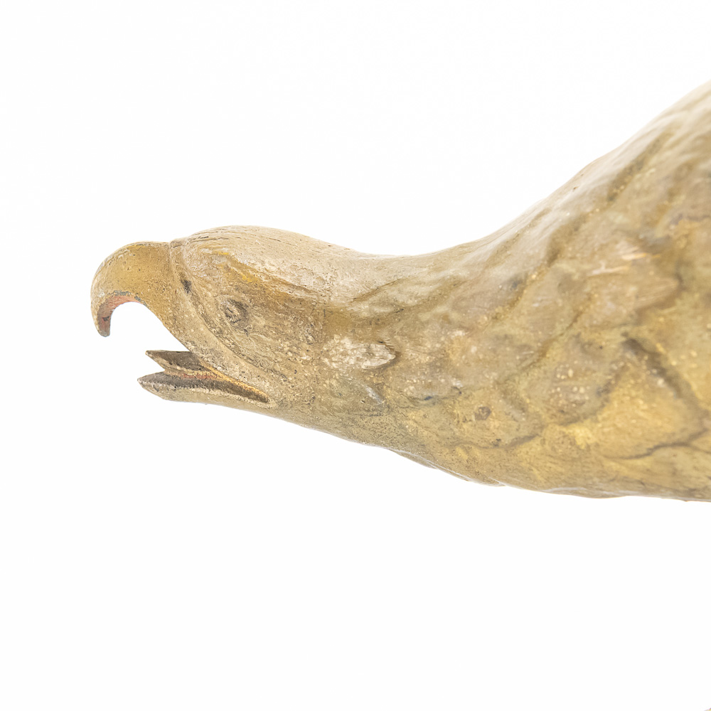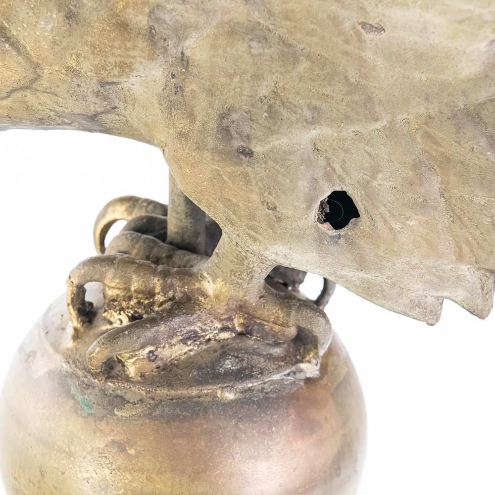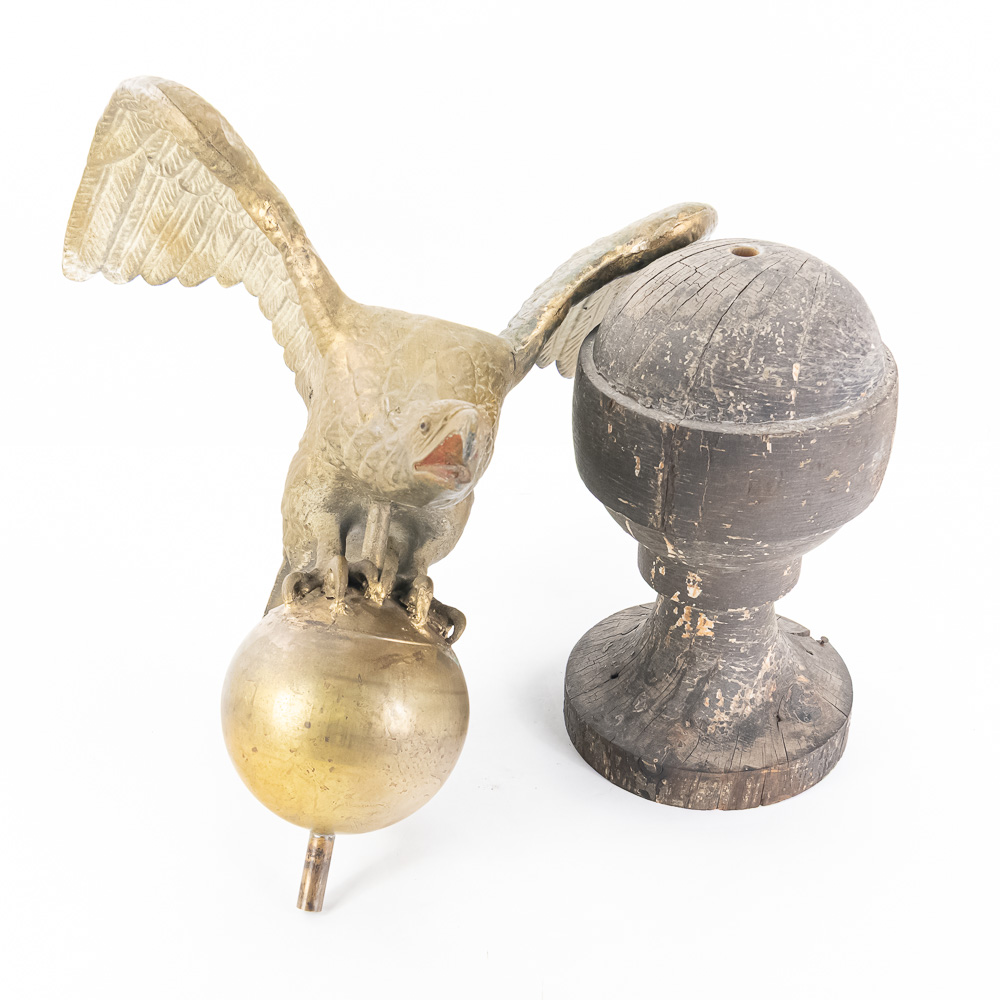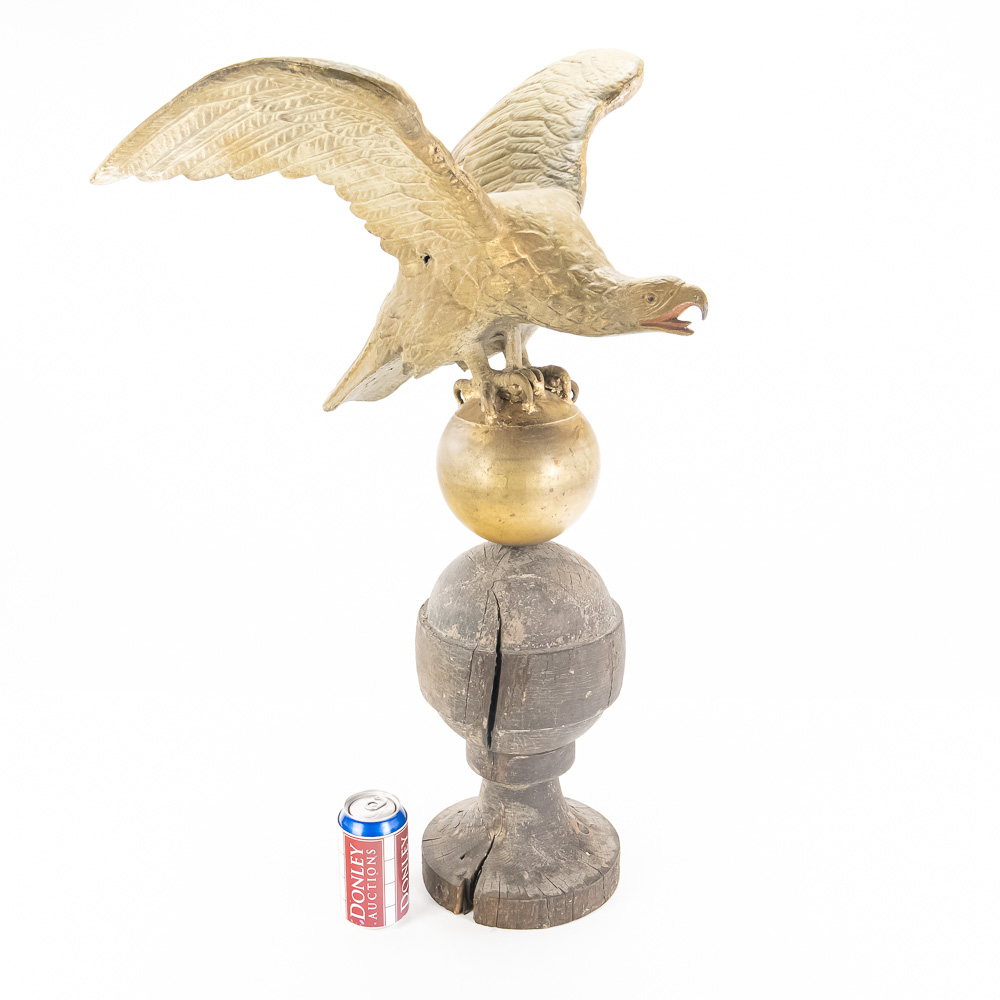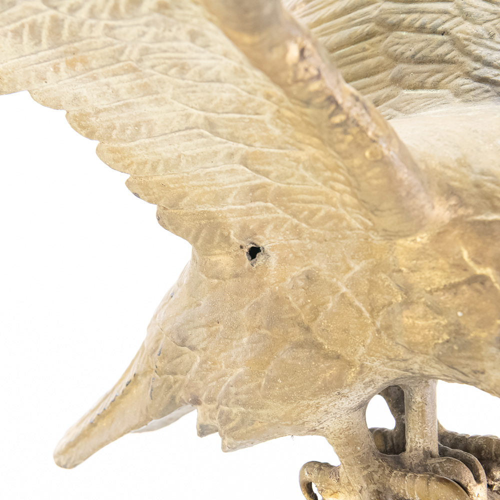 Weather vane depicting an eagle in flight. Circa late 1800’s. Eagle has a few bullet holes. Matte gold finish, not gold or shiny. Wood base is most likely not original to the piece. It has been re-painted and has cracks.