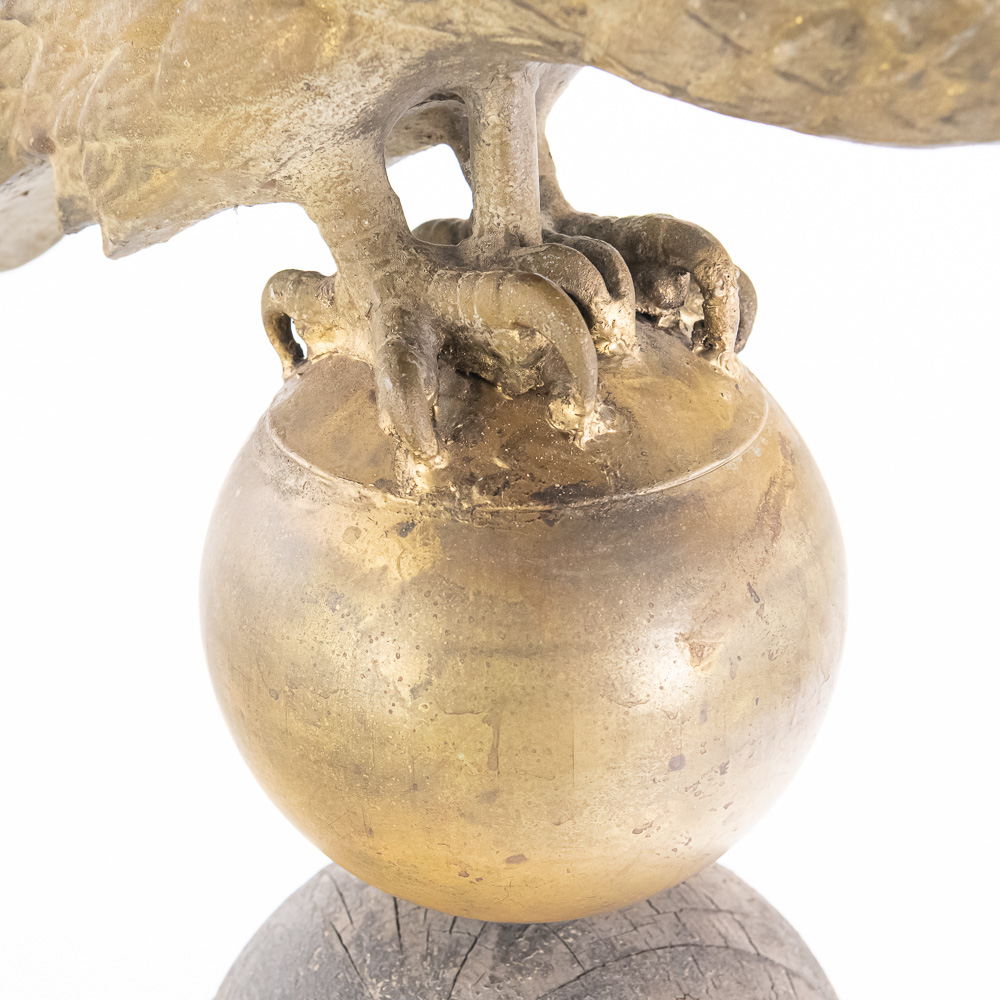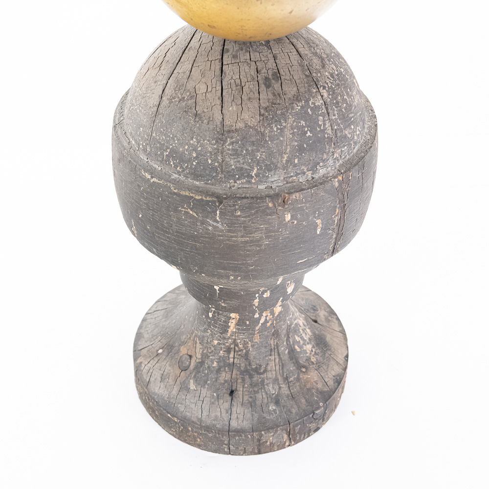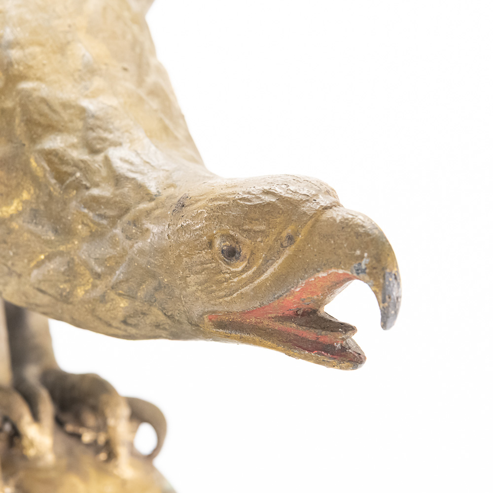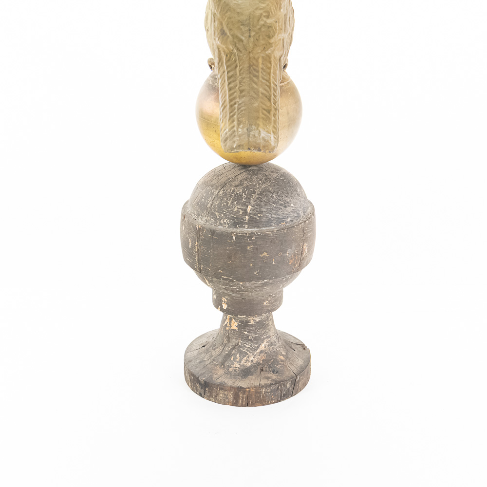 Weather vane depicting an eagle in flight. Circa late 1800’s. Eagle has a few bullet holes. Matte gold finish, not gold or shiny. Wood base is most likely not original to the piece. It has been re-painted and has cracks.