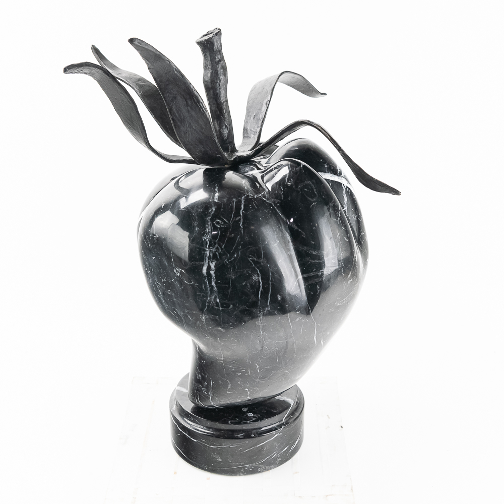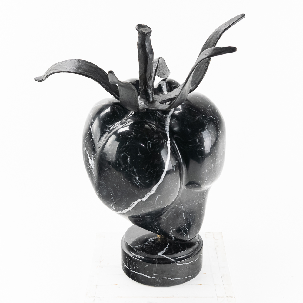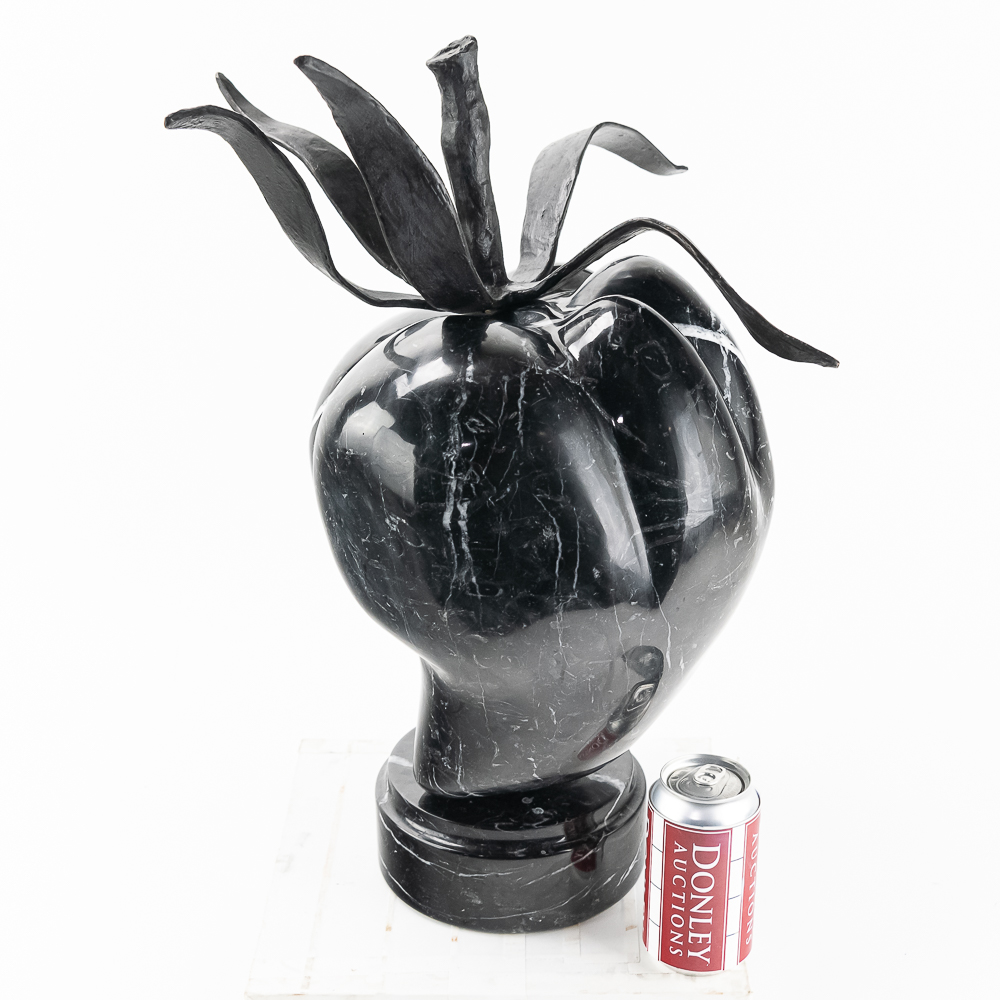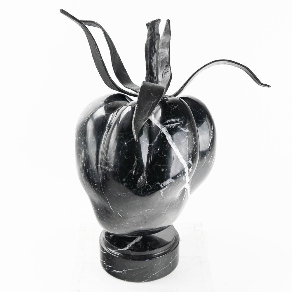 Sculpted by the St Barth’s island artist de Roux is a carved and polished black granite poblano pepper with hand forged iron leaves and stem and mounted to a rotating black granite base. Carved from the volcanic black granite the island is famous for. Measures 21.5″ tall and about 18″ in diameter. Very heavy.