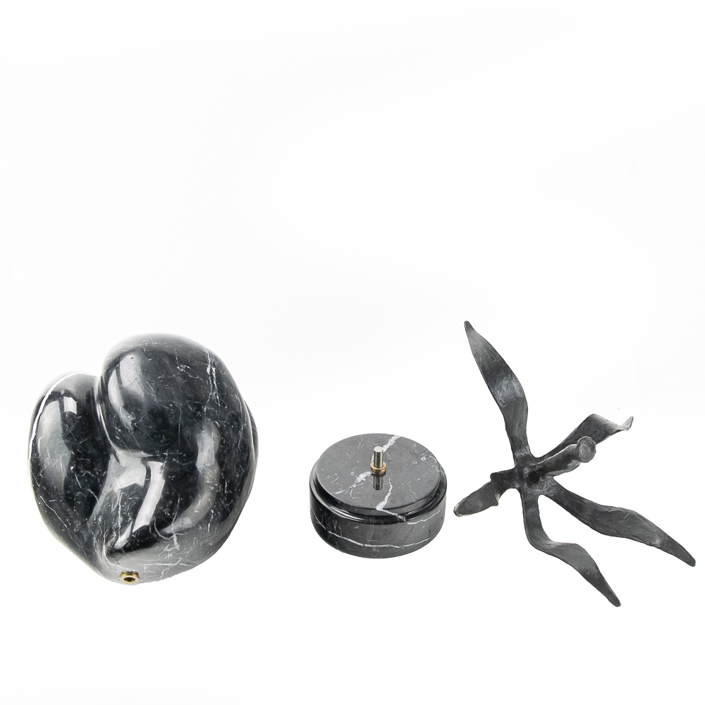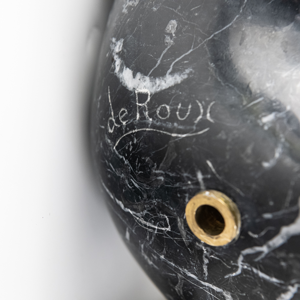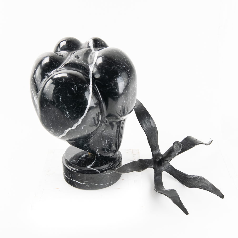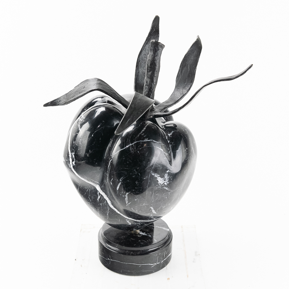 Sculpted by the St Barth’s island artist de Roux is a carved and polished black granite poblano pepper with hand forged iron leaves and stem and mounted to a rotating black granite base. Carved from the volcanic black granite the island is famous for. Measures 21.5″ tall and about 18″ in diameter. Very heavy.