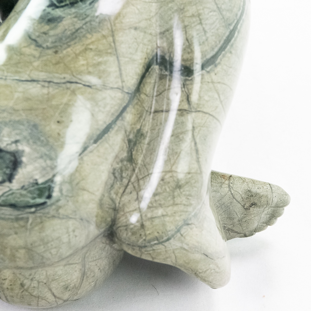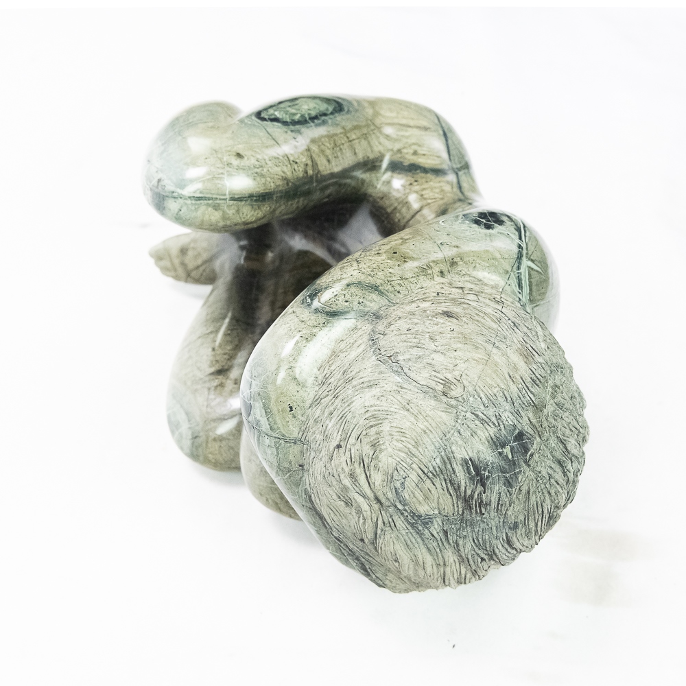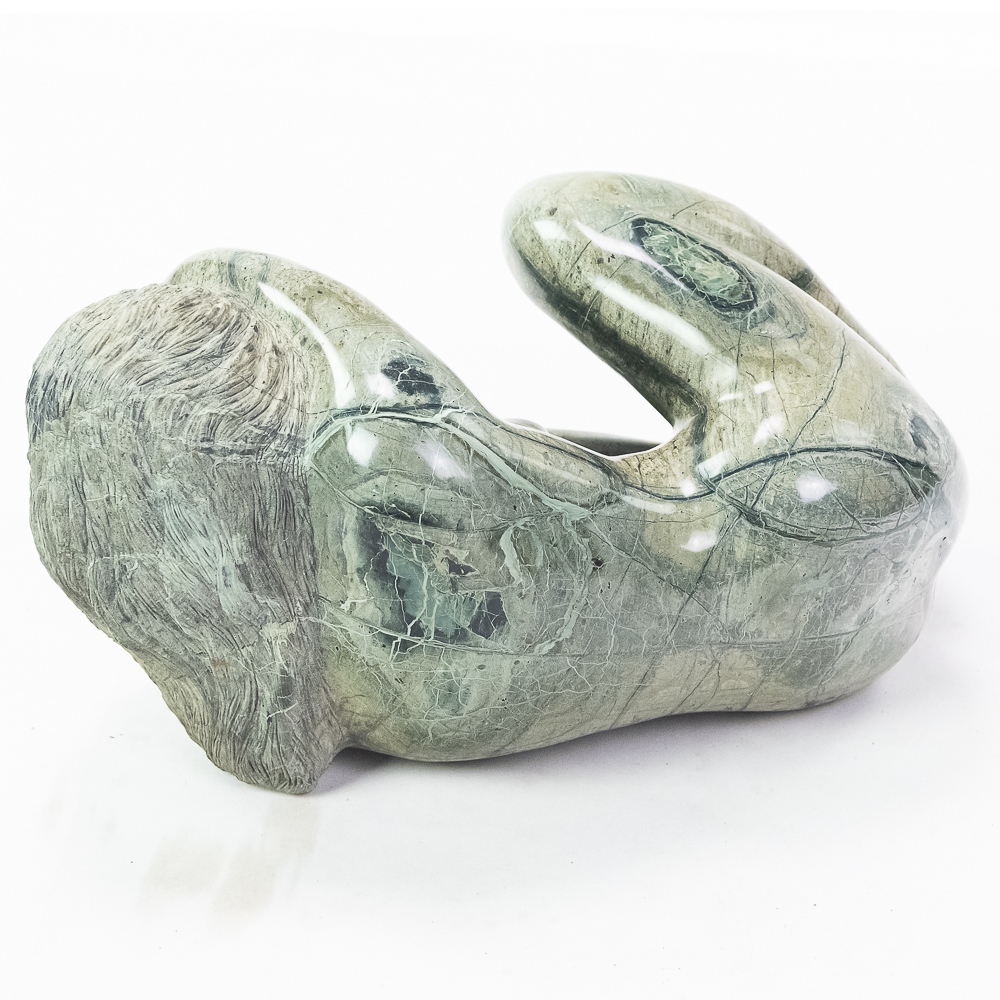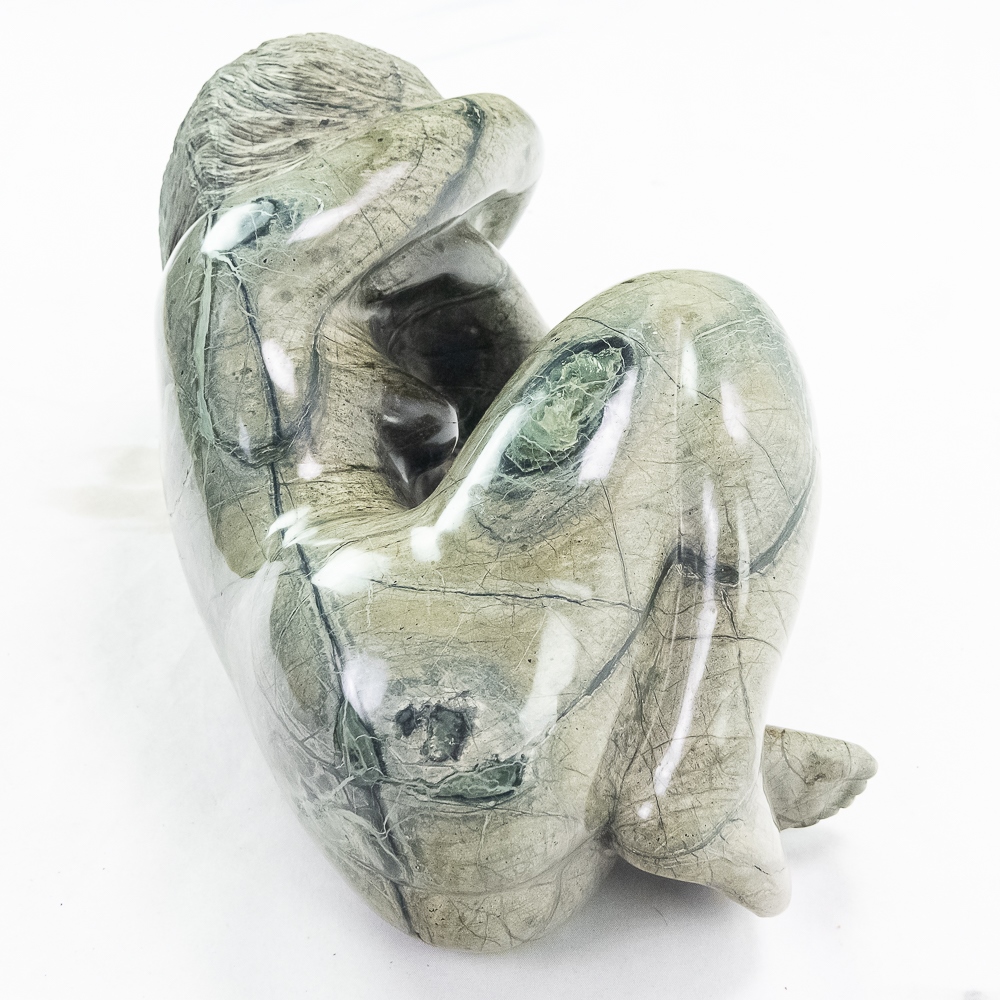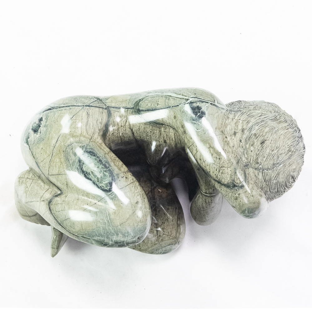 Unknown artist (Contemporary). A girl curled up. In green serpentine rock formation. Body polished. Condition good. 8″ x 16″ x 11″