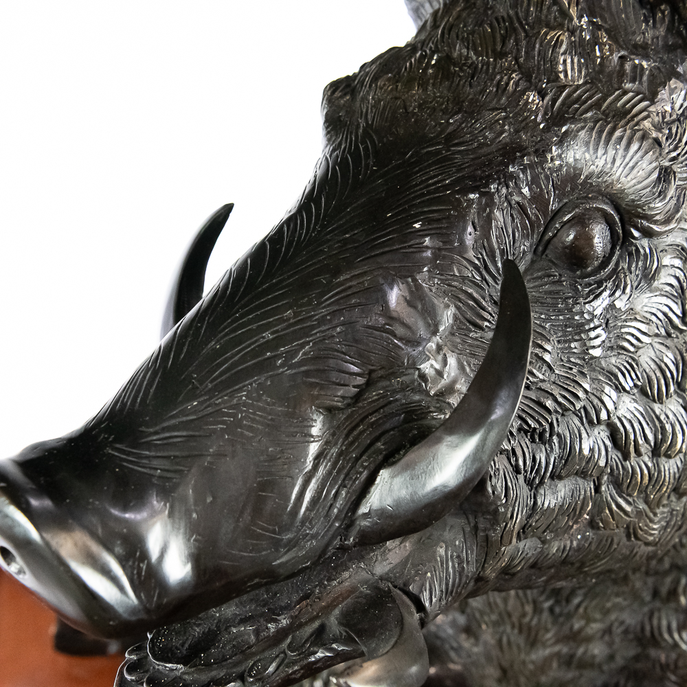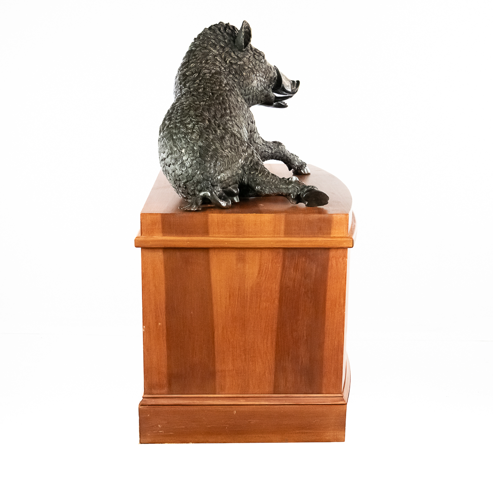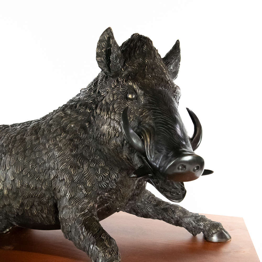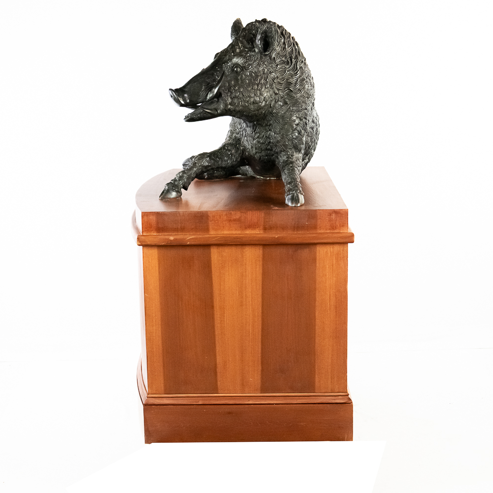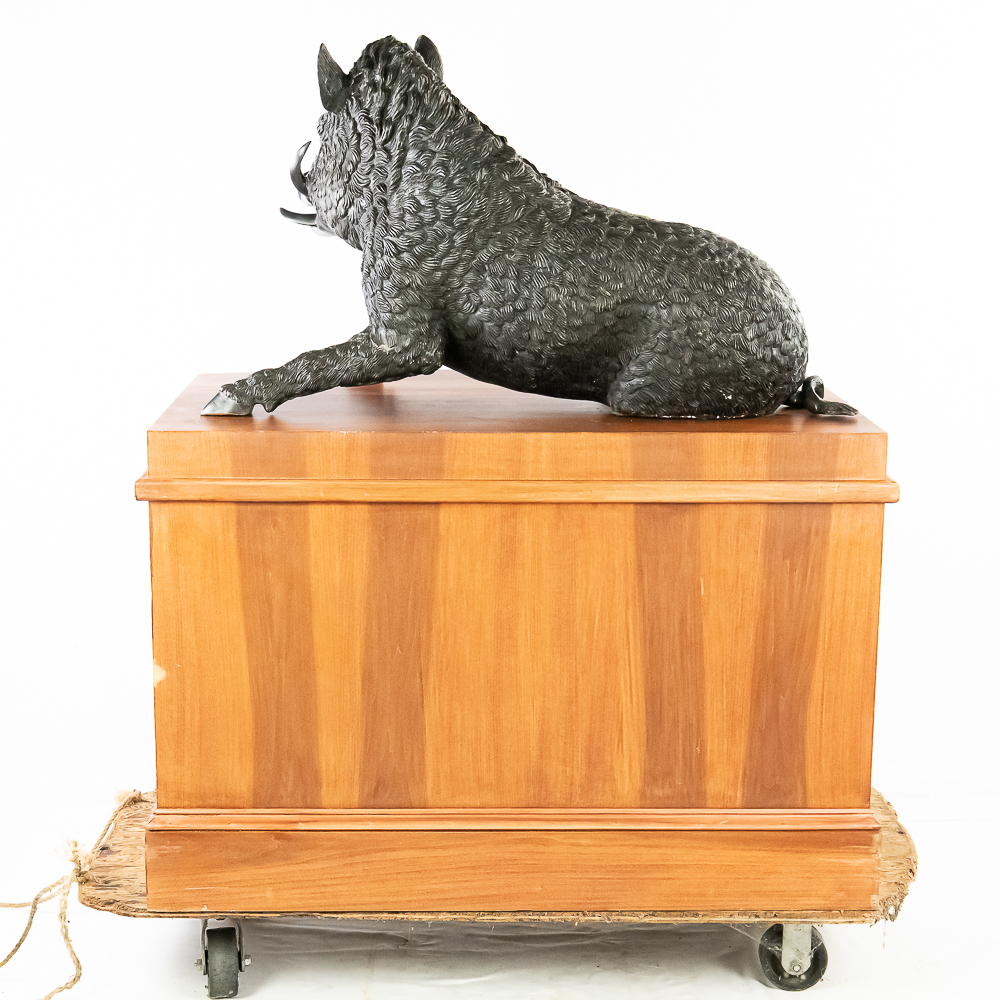 Large life size reclining bronze boar on a custom wood bow front pedestal. In overall VG condition. Bronze measures 25″ tall, 43″ wide, 22″deep. Custom display pedestal measures 32.5″ tall, 49″ wide, 33″ deep. VERY HEAVY.
