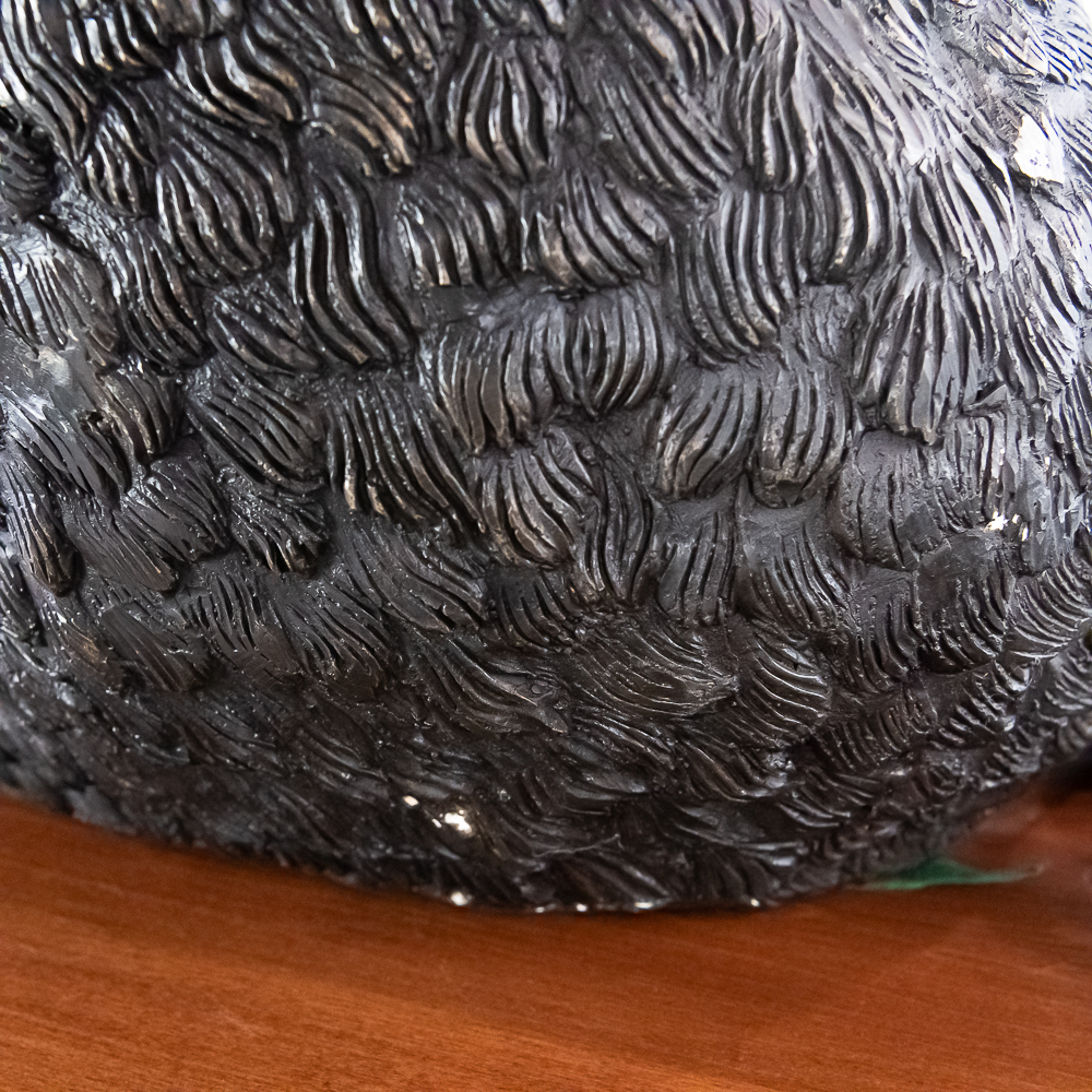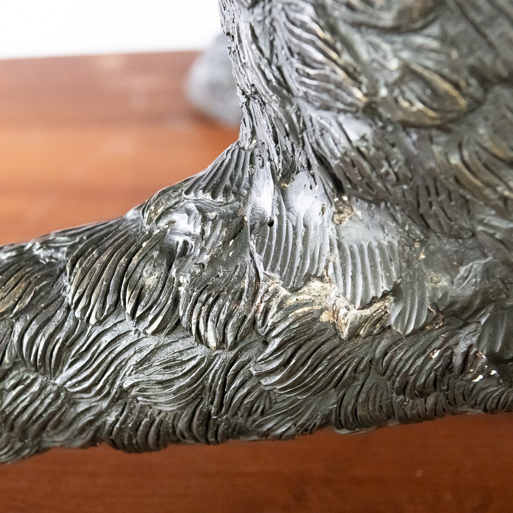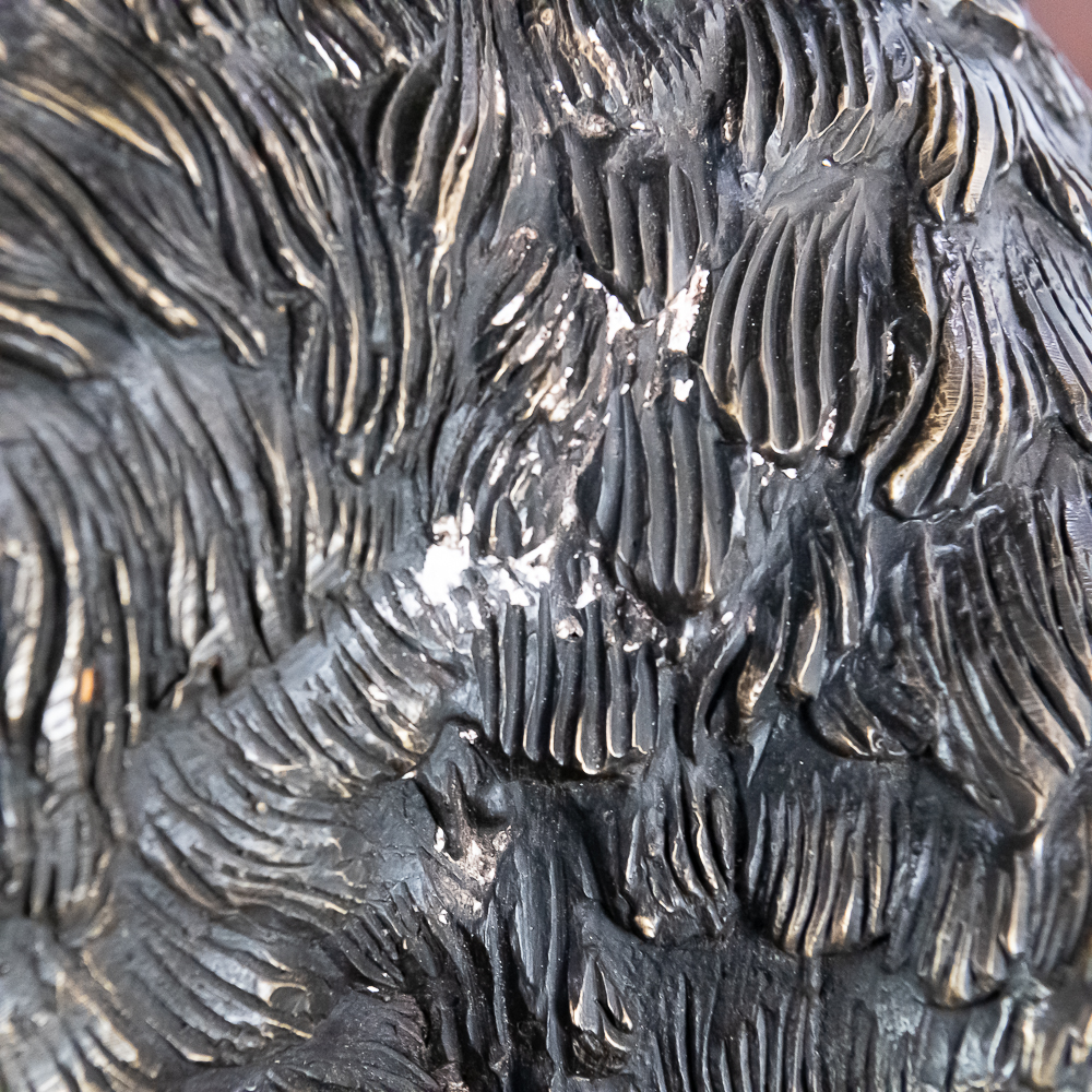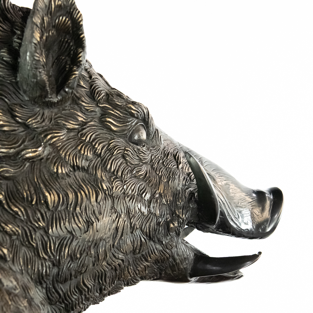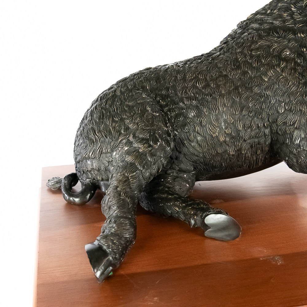 Large life size reclining bronze boar on a custom wood bow front pedestal. In overall VG condition. Bronze measures 25″ tall, 43″ wide, 22″deep. Custom display pedestal measures 32.5″ tall, 49″ wide, 33″ deep. VERY HEAVY.