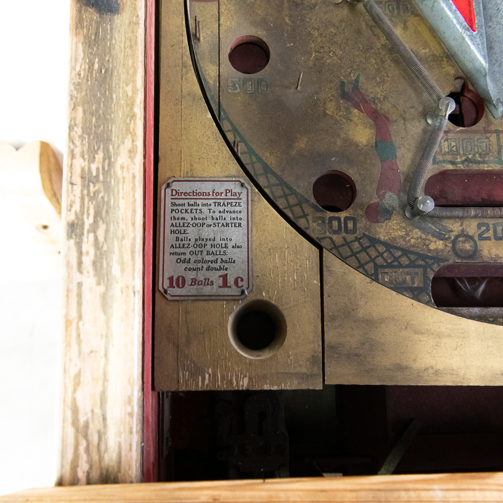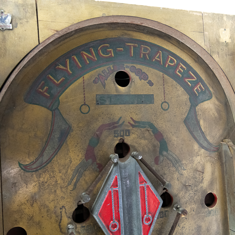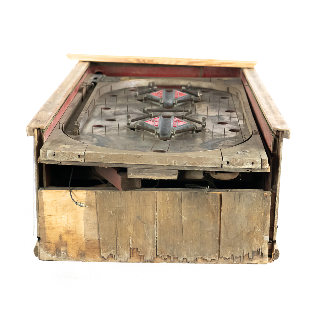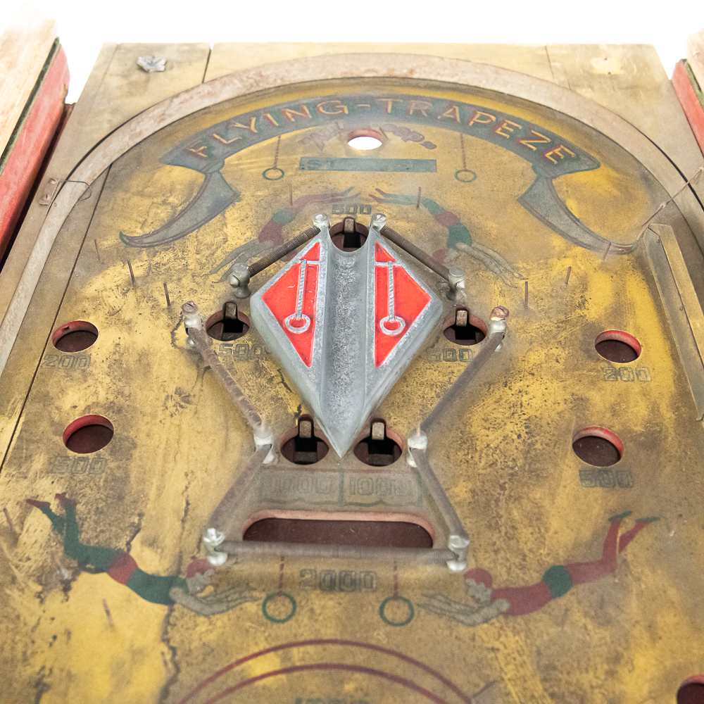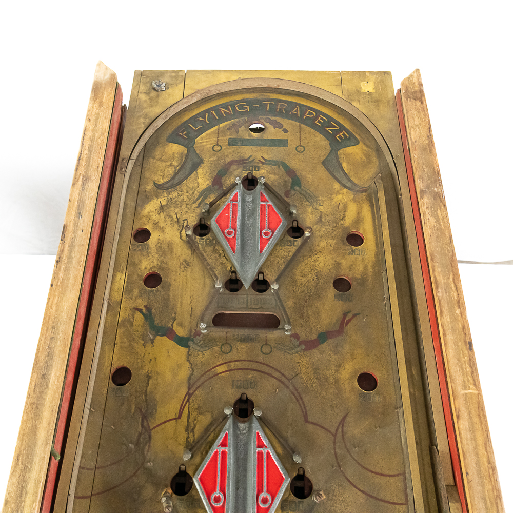 An exceptionally rare and historically important early mechanical pin game, “Flying-Trapeze” by the legendary D. Gottlieb & Co. of Chicago. This is one of the foundational games from the dawn of the pinball industry, featuring a wonderful, hand-painted circus theme with trapeze artists. The game is in as-found, project condition. The all-wood cabinet and playfield are heavily weathered and worn. The graphics are faded and stained but still visible. The original top glass for the playfield is missing. This is a fantastic opportunity for a dedicated collector to undertake a worthy restoration of a significant piece. Its working condition is unknown and it is being offered as-is. Dimensions: 20.5″ wide x 39″ long x 9.5″ front height x11.5″ rear height.. Legs are 34″ long.