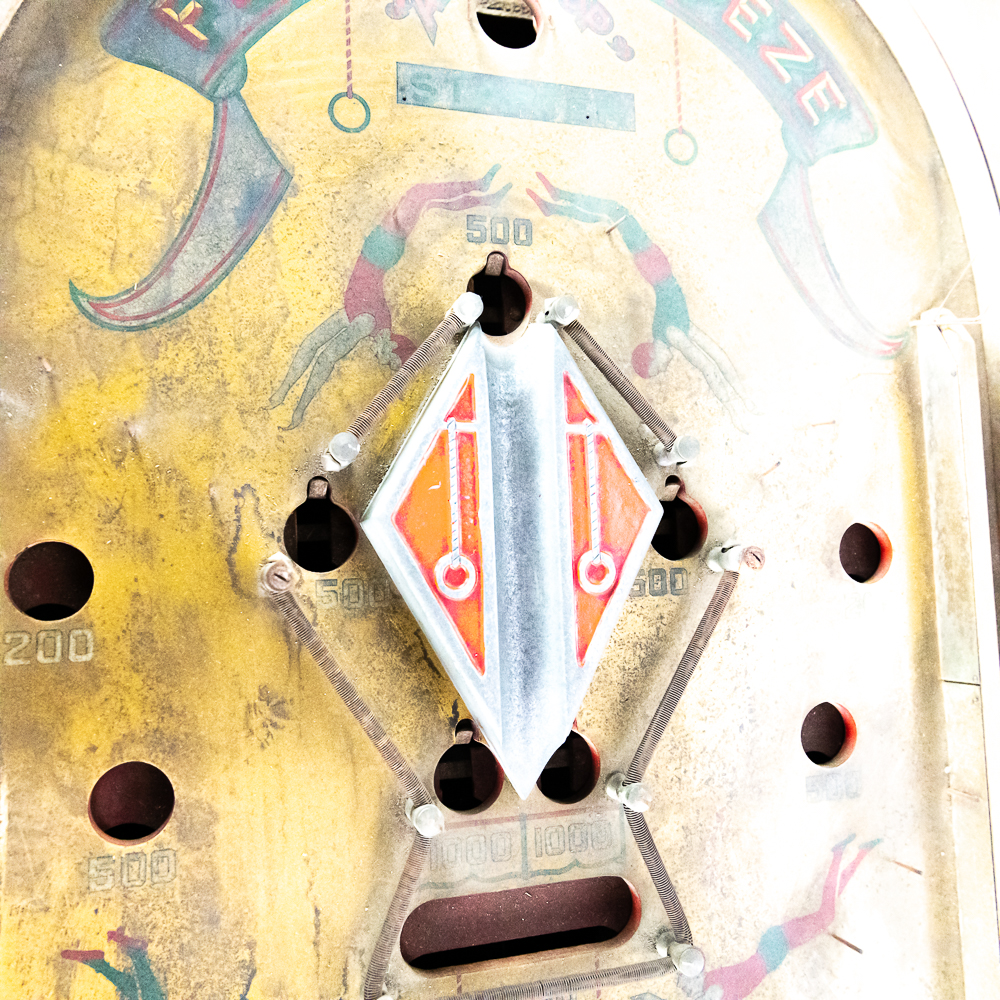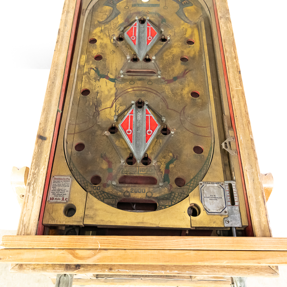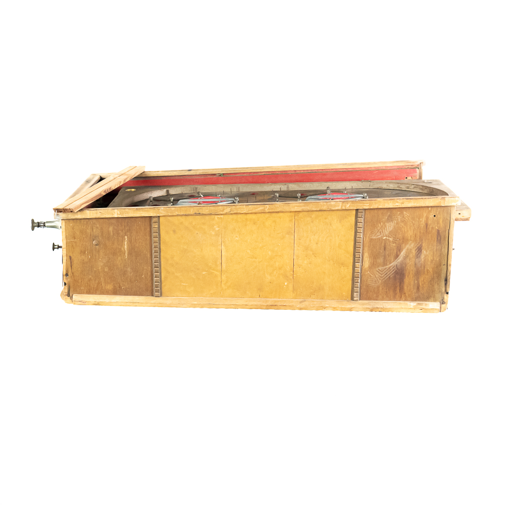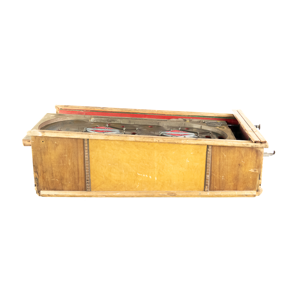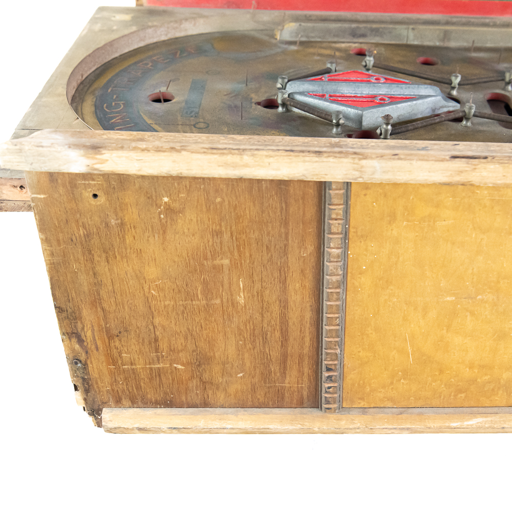 An exceptionally rare and historically important early mechanical pin game, “Flying-Trapeze” by the legendary D. Gottlieb & Co. of Chicago. This is one of the foundational games from the dawn of the pinball industry, featuring a wonderful, hand-painted circus theme with trapeze artists. The game is in as-found, project condition. The all-wood cabinet and playfield are heavily weathered and worn. The graphics are faded and stained but still visible. The original top glass for the playfield is missing. This is a fantastic opportunity for a dedicated collector to undertake a worthy restoration of a significant piece. Its working condition is unknown and it is being offered as-is. Dimensions: 20.5″ wide x 39″ long x 9.5″ front height x11.5″ rear height.. Legs are 34″ long.