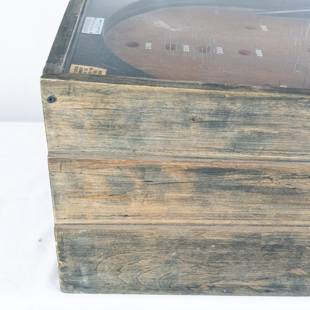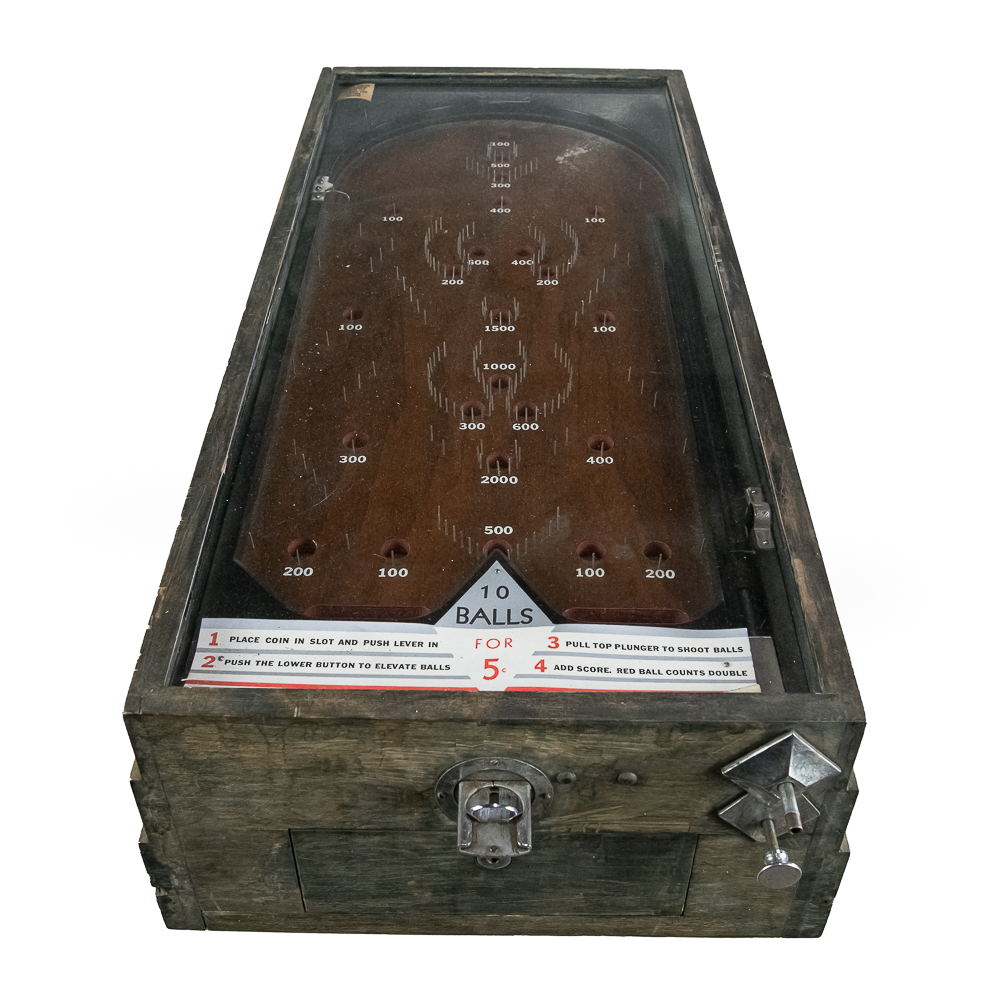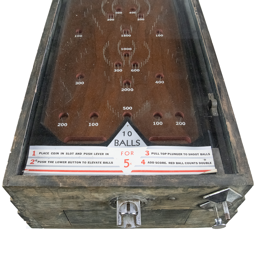 Machine. This 1930s mechanical game features a simple, addictive playfield where players shoot 10 balls for 5 cents. The game is housed in a robust, utilitarian wooden case with a great, heavily weathered and worn original finish. The playfield is dirty, with faded graphics and some bent pins under the original glass. The instruction card is a later paper replacement. It is in working condition with two cats eyes marbles included. It is being offered in as-is condition. Dimensions: 18″ wide x 36″ long and 9″ tall in front and 11.5″ tall at back. No key present for front access door.