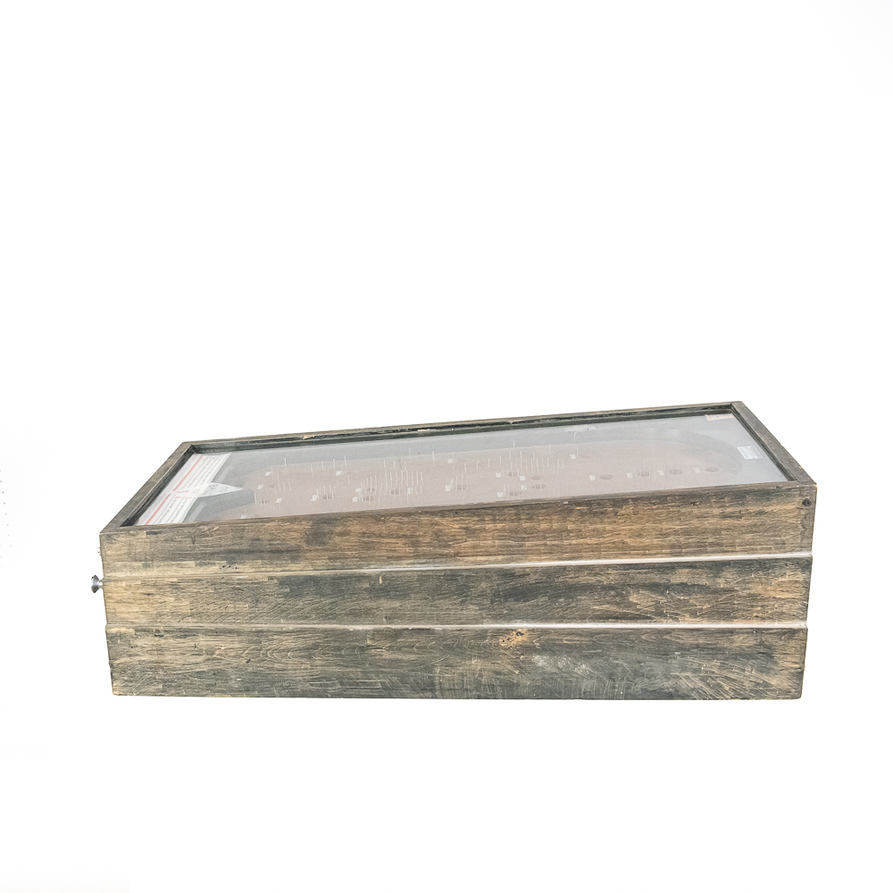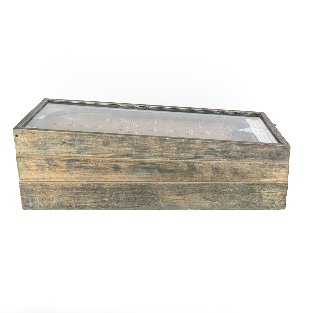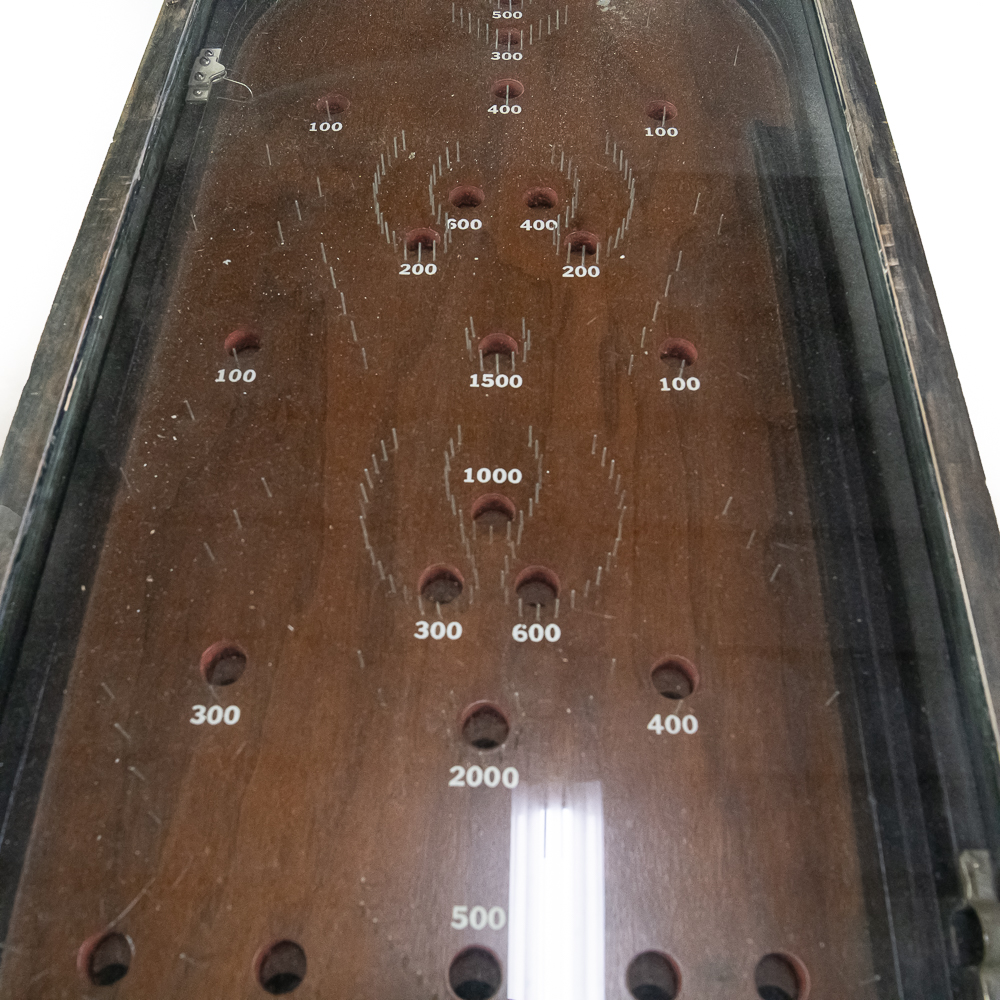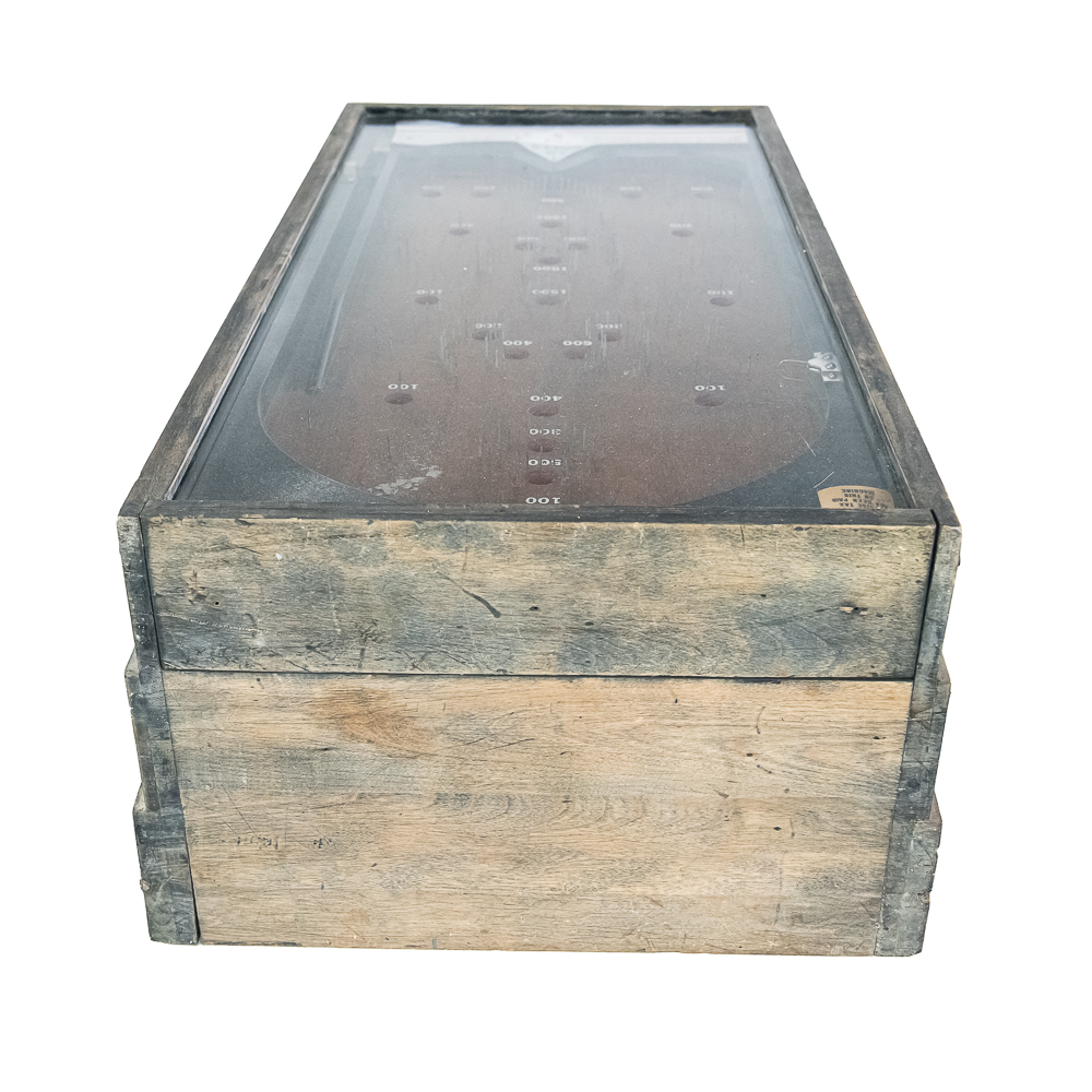Machine. This 1930s mechanical game features a simple, addictive playfield where players shoot 10 balls for 5 cents. The game is housed in a robust, utilitarian wooden case with a great, heavily weathered and worn original finish. The playfield is dirty, with faded graphics and some bent pins under the original glass. The instruction card is a later paper replacement. It is in working condition with two cats eyes marbles included. It is being offered in as-is condition. Dimensions: 18″ wide x 36″ long and 9″ tall in front and 11.5″ tall at back. No key present for front access door.
