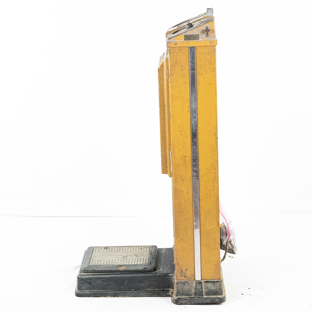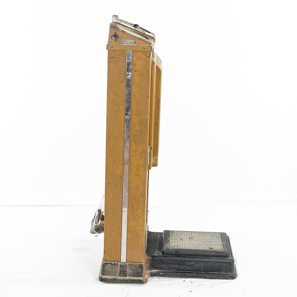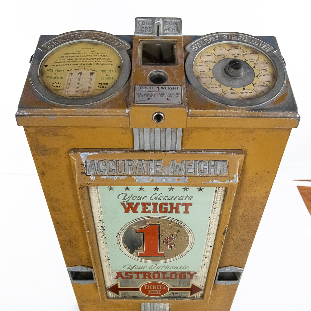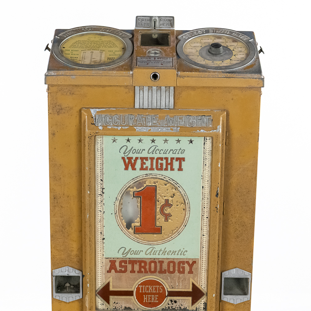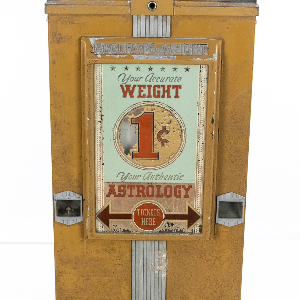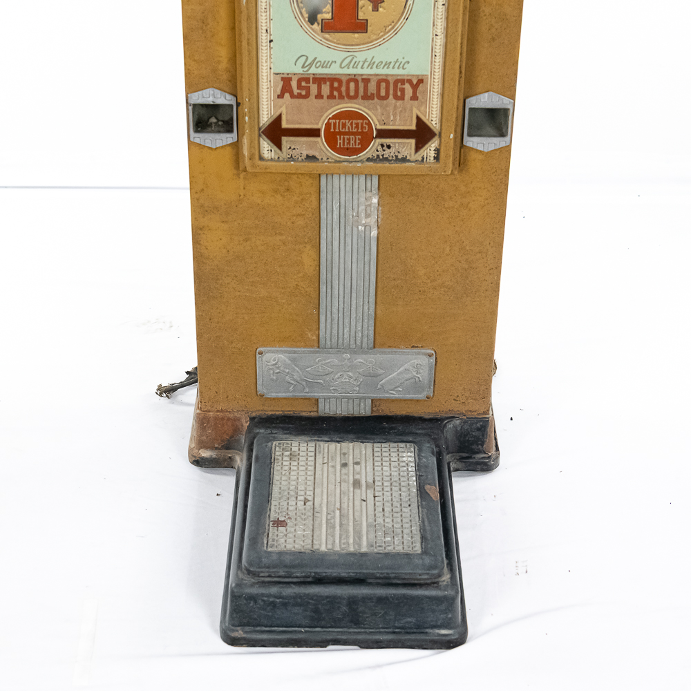 A rare one cent scale with astrology and health. ,Seldom seen, works but needs calibrating. Needs new lock, no keys, looks to be fairly complete. Some paint flaking throughout. Small crack in left top casting. Please see photos. Front reverse glass advertising has some paint flaking. If you’re going to restore a scale, this would be a great one with all the extras. Also missing marquee that bolts to its back. Overall fair to good condition.