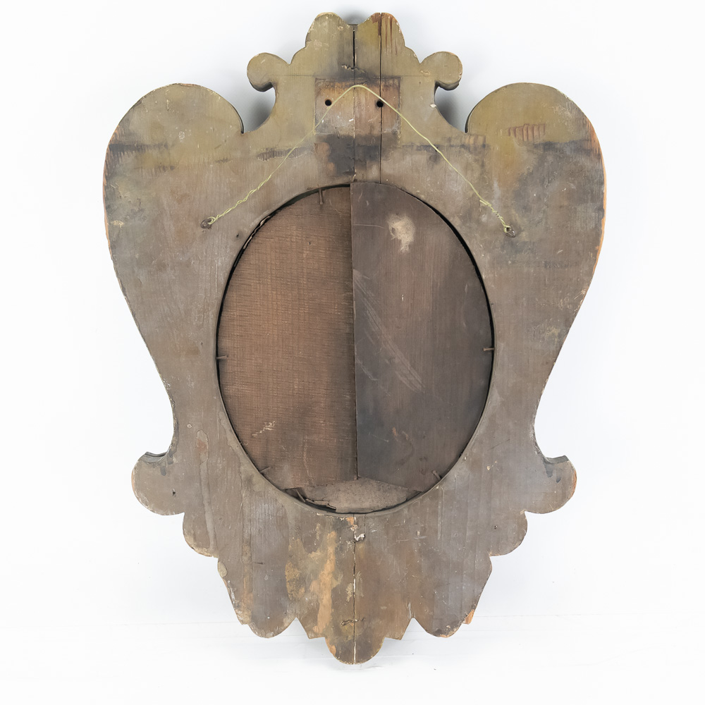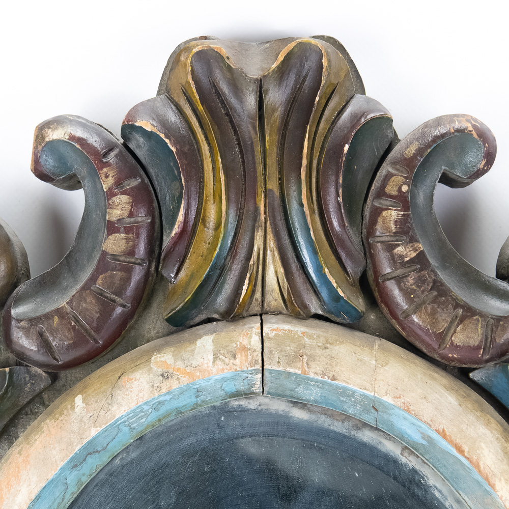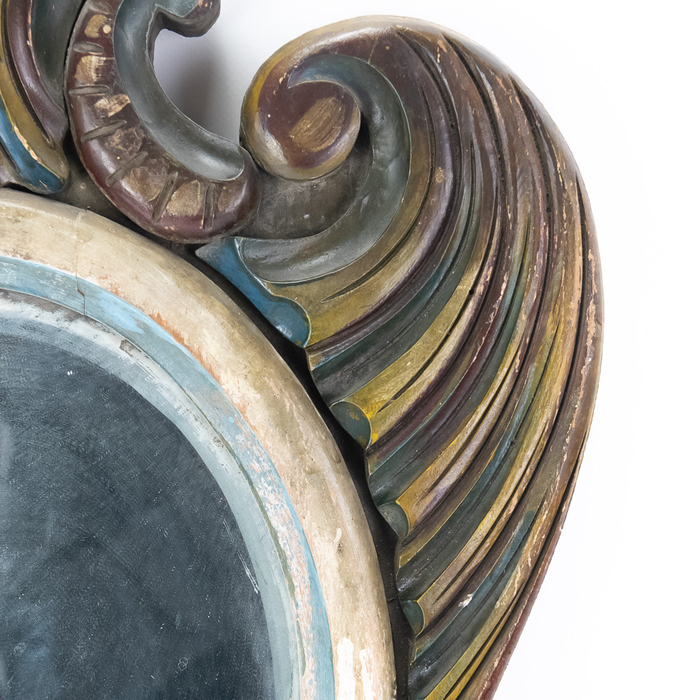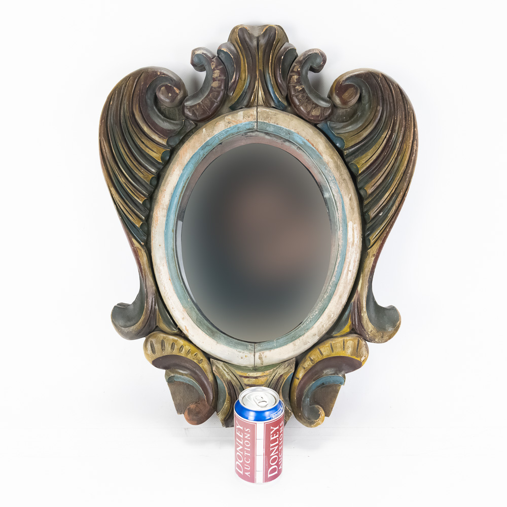 Vintage Carousel Surround Board Wood Mirror, features a beveled edge with some desilvering of mirror at the bottom, distressed paint finish, shows some wear, hanging wire on back, measures 23 3/4″ x 17″, see photos.