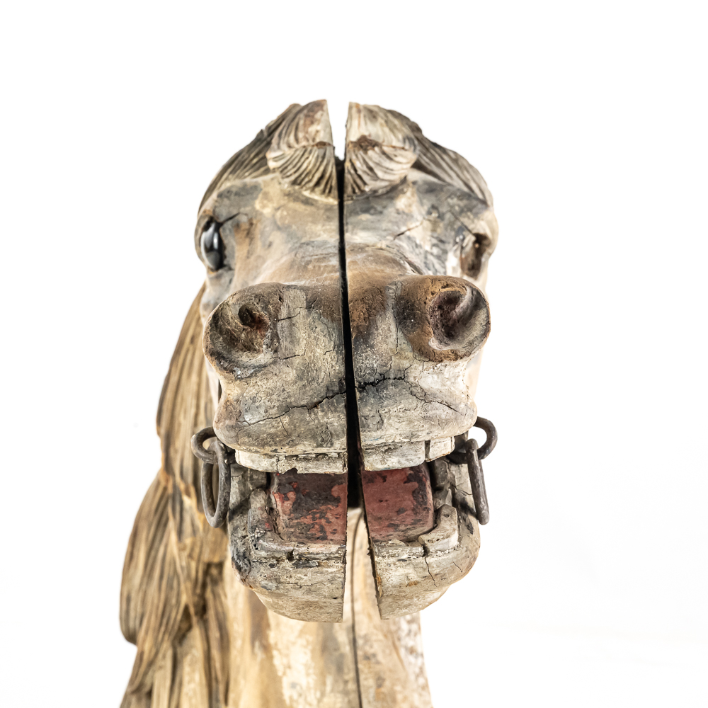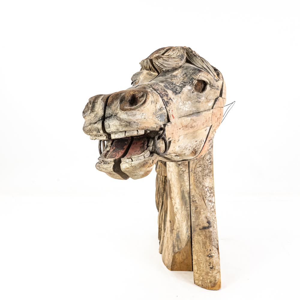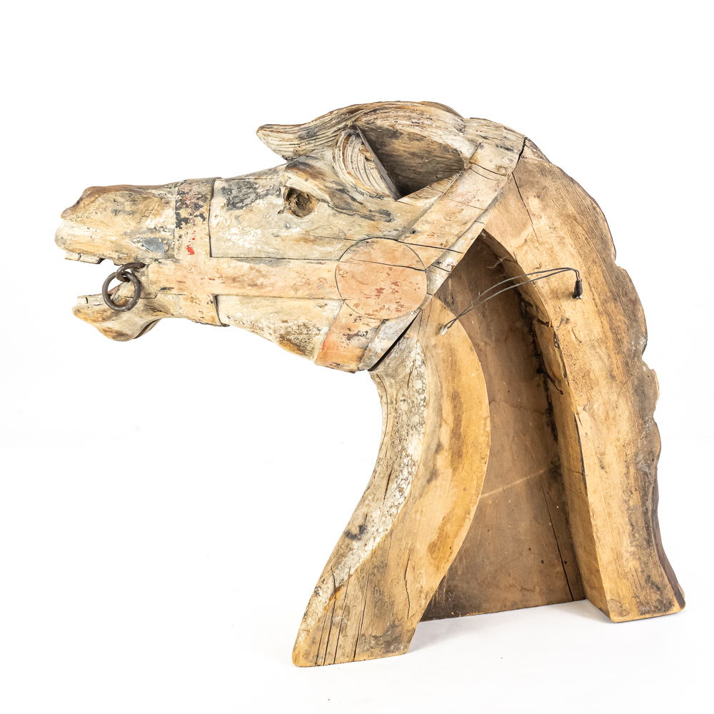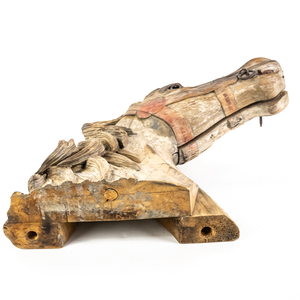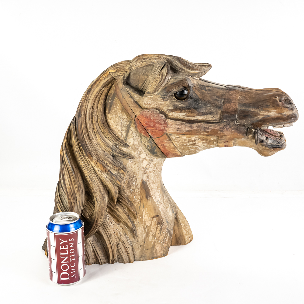 Carousel Horse Wood Head Fragment, hand carved pieces of wood attached together to form a nice hanging piece, shows remnants of original paint, glass eye and bit rings, measures 16 1/2″ x 17″, sits flush against a wall, 4″ deep, see photos.