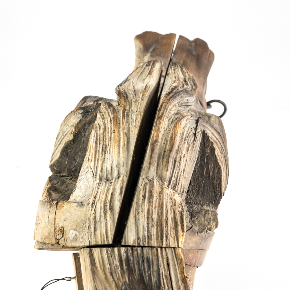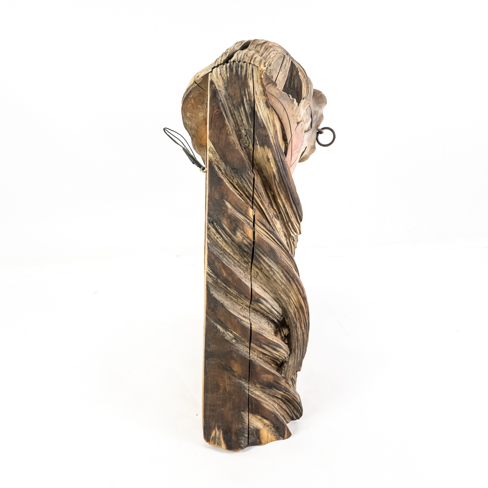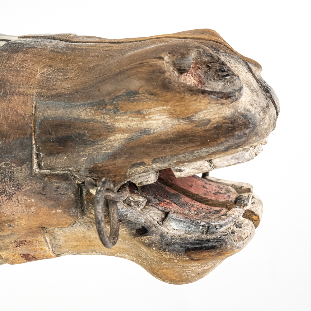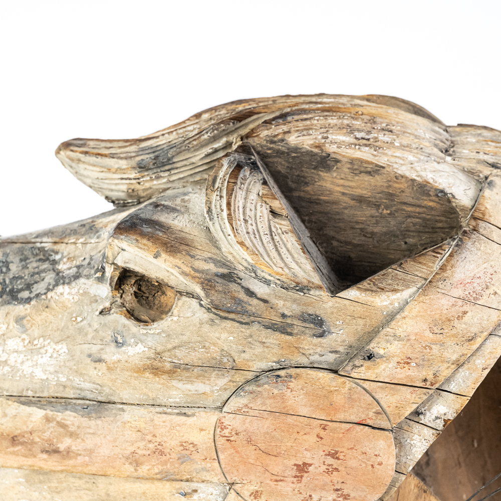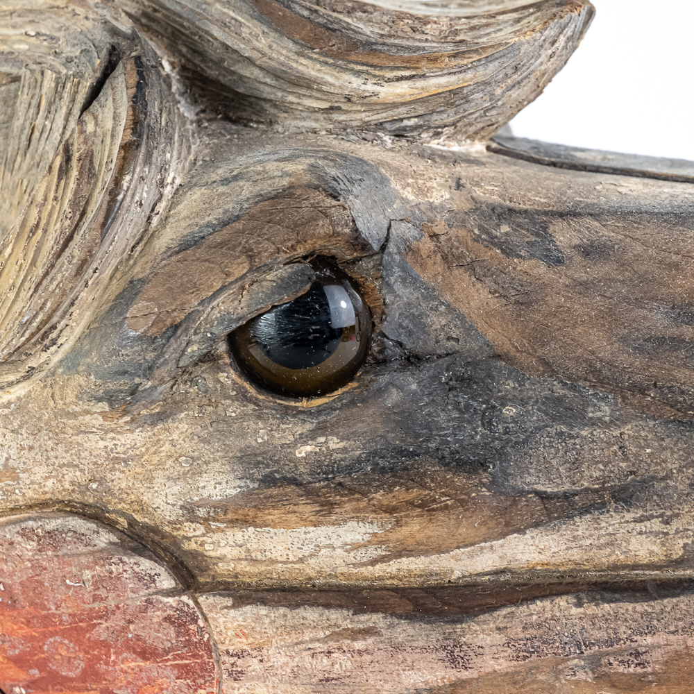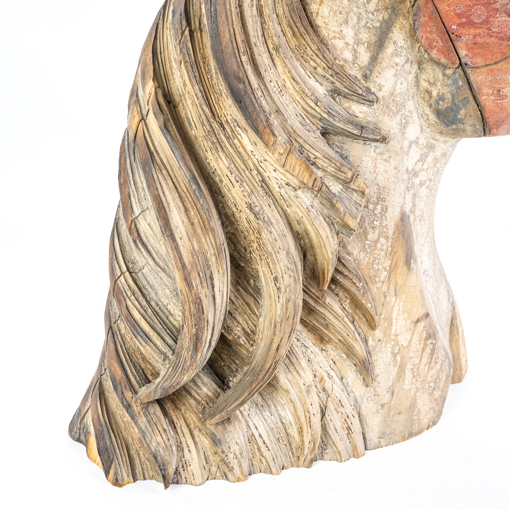 Carousel Horse Wood Head Fragment, hand carved pieces of wood attached together to form a nice hanging piece, shows remnants of original paint, glass eye and bit rings, measures 16 1/2″ x 17″, sits flush against a wall, 4″ deep, see photos.