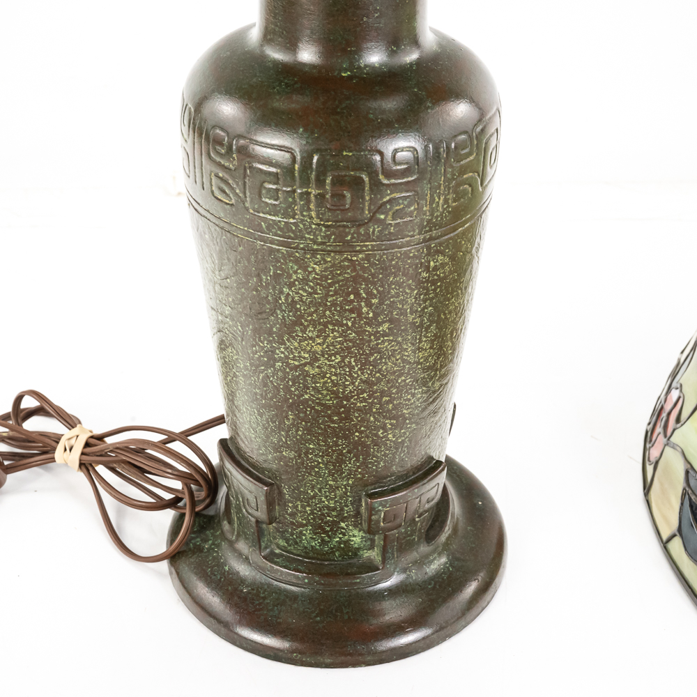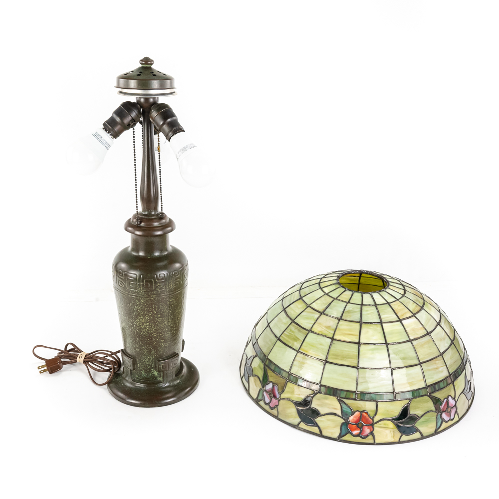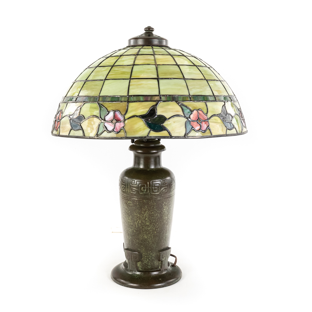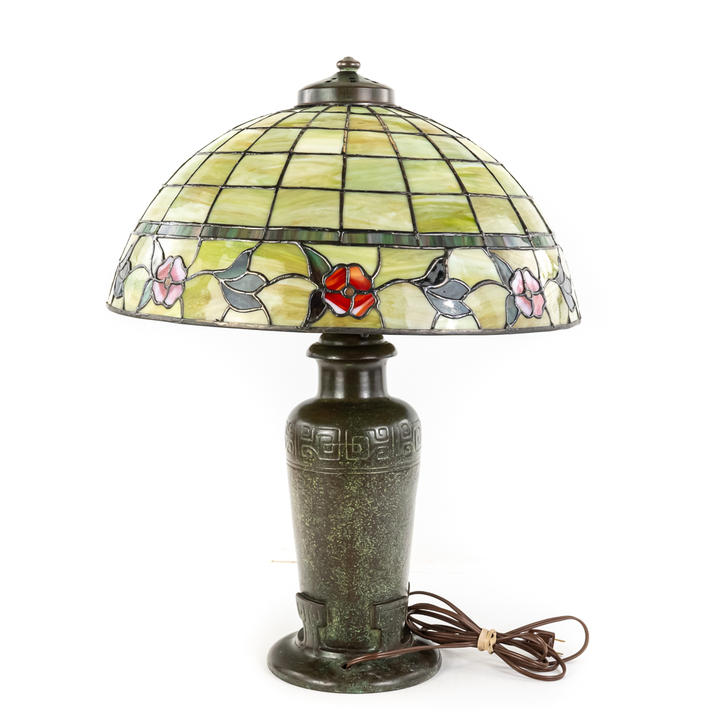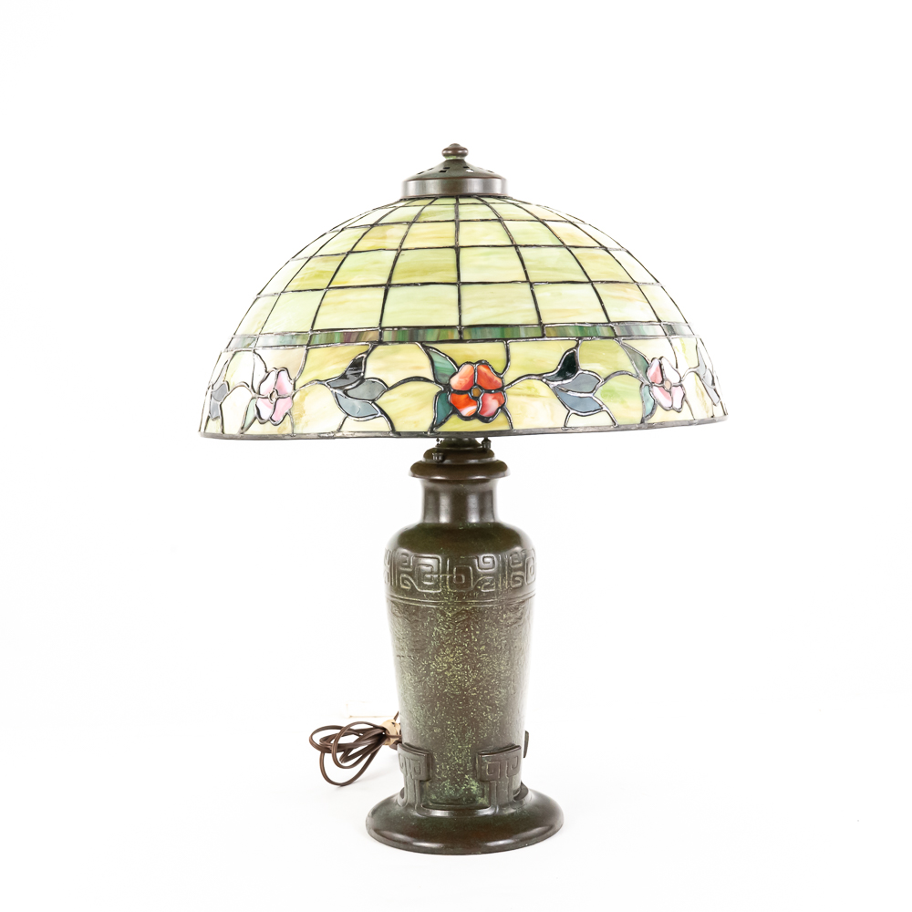 This is a high-quality reproduction table lamp featuring a domed leaded glass shade composed of a geometric grid of variegated green and cream slag glass, accented by a lower border of pink floral blossoms and dark green leaves. The shade rests on a heavy metal base with a dark verdigris patina, featuring a vase-form column molded with archaic Chinese-style geometric scrollwork. Although the base is clearly stamped “HANDEL” on the foot, we’ve determined this is a reproduction. The fixture includes a three-socket cluster operated by acorn pull chains and is surmounted by a pierced metal heat cap. Condition notes include oxidation and white residue on the lead caning, and minor surface wear to the patina on the base. The underside is covered in felt. Est. 23″ H x 18″ Dia.