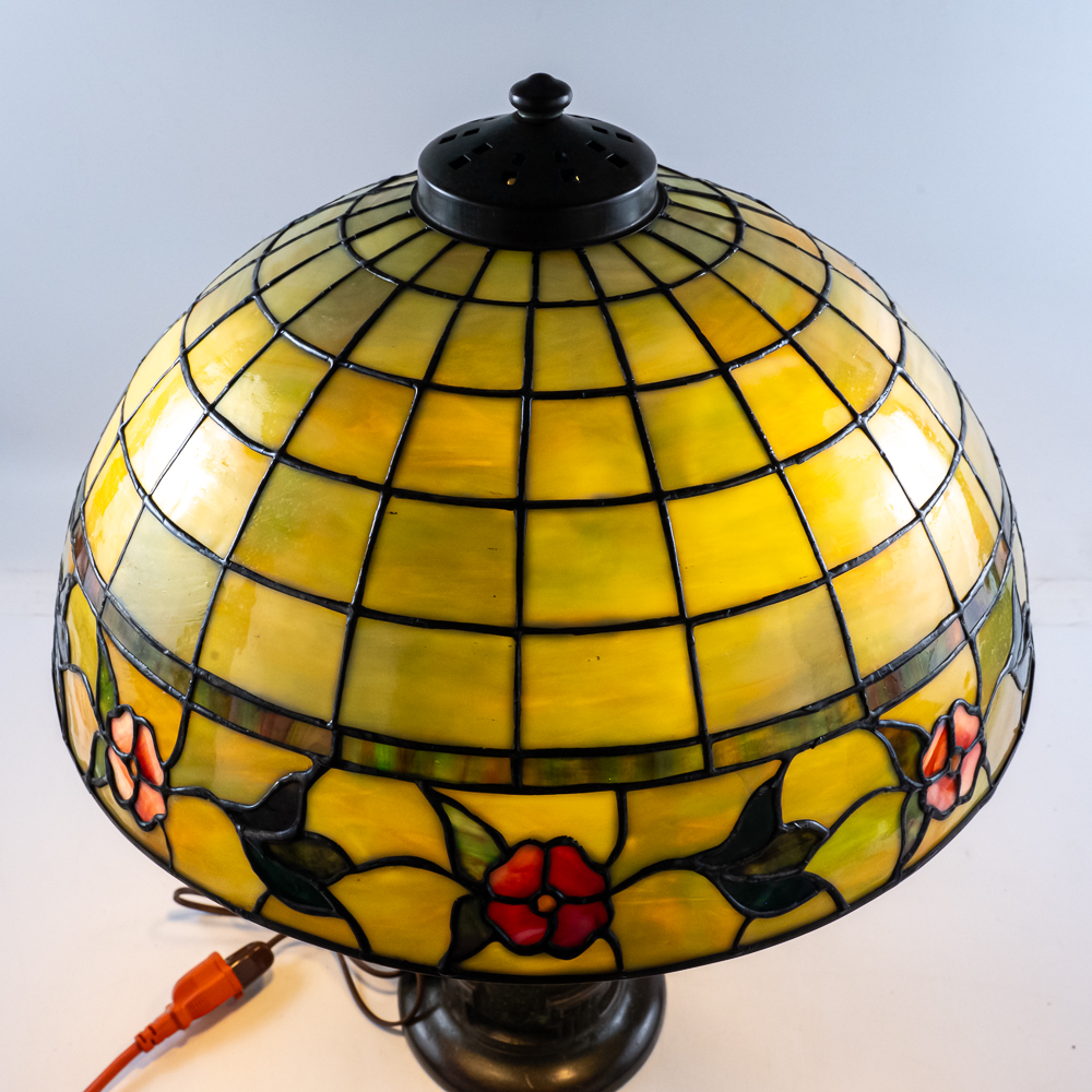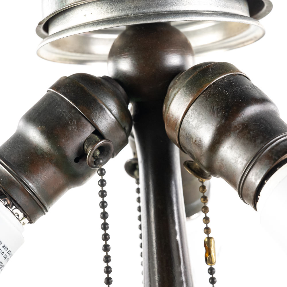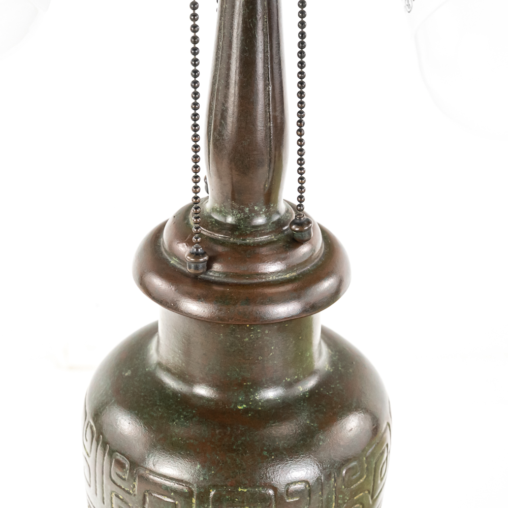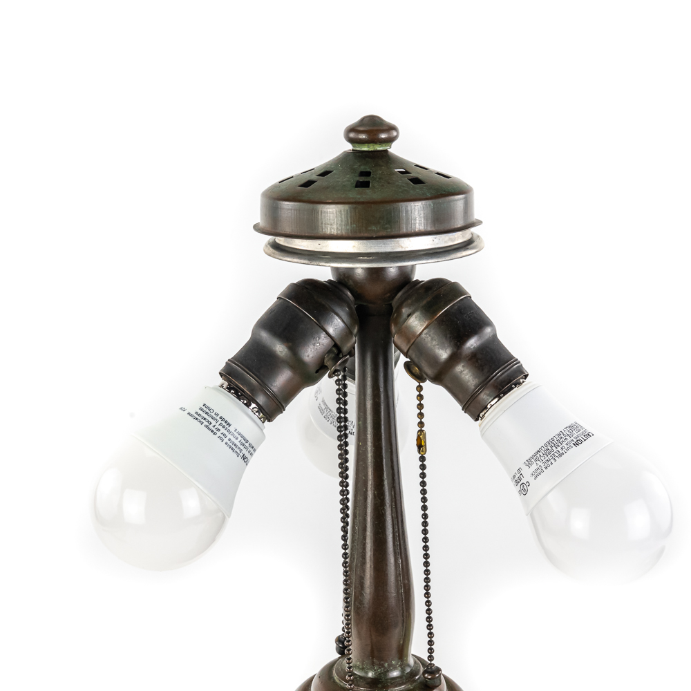 This is a high-quality reproduction table lamp featuring a domed leaded glass shade composed of a geometric grid of variegated green and cream slag glass, accented by a lower border of pink floral blossoms and dark green leaves. The shade rests on a heavy metal base with a dark verdigris patina, featuring a vase-form column molded with archaic Chinese-style geometric scrollwork. Although the base is clearly stamped “HANDEL” on the foot, we’ve determined this is a reproduction. The fixture includes a three-socket cluster operated by acorn pull chains and is surmounted by a pierced metal heat cap. Condition notes include oxidation and white residue on the lead caning, and minor surface wear to the patina on the base. The underside is covered in felt. Est. 23″ H x 18″ Dia.