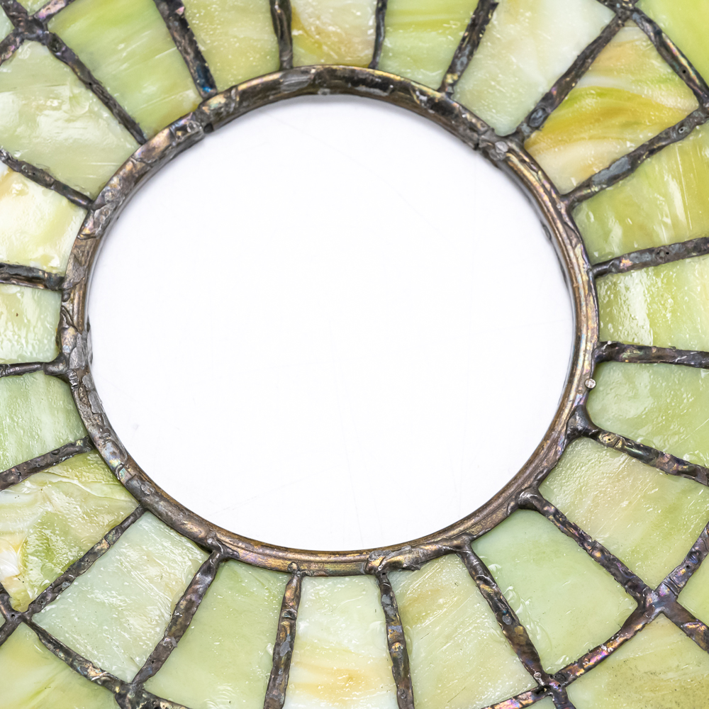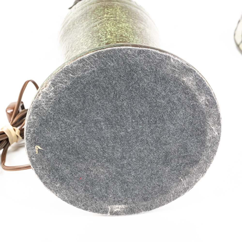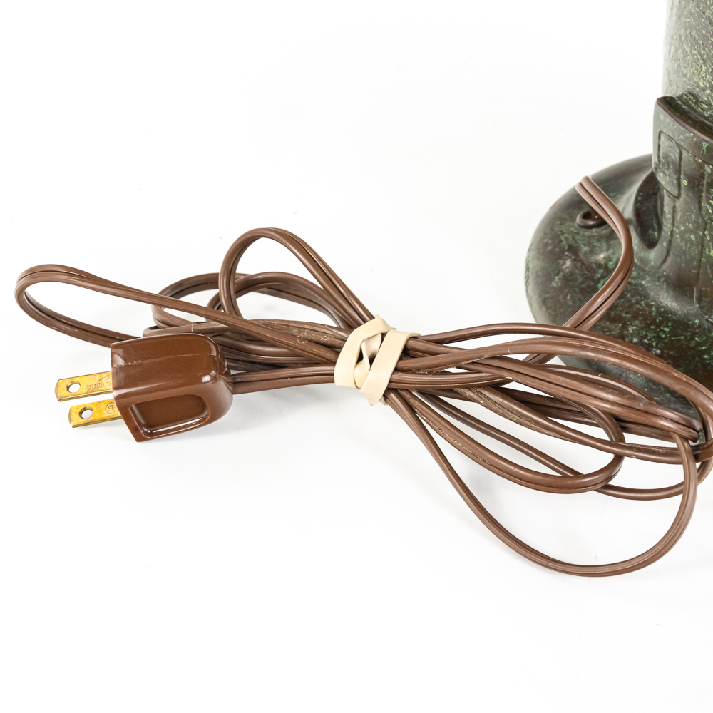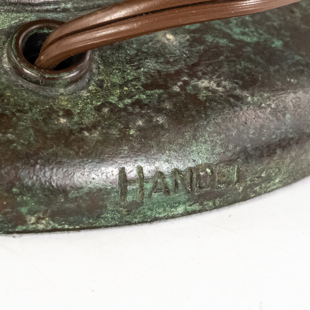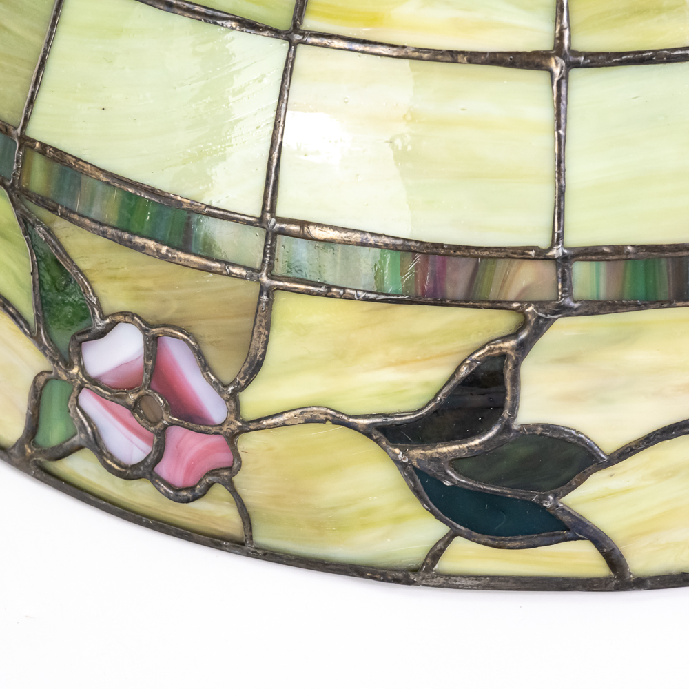 This is a high-quality reproduction table lamp featuring a domed leaded glass shade composed of a geometric grid of variegated green and cream slag glass, accented by a lower border of pink floral blossoms and dark green leaves. The shade rests on a heavy metal base with a dark verdigris patina, featuring a vase-form column molded with archaic Chinese-style geometric scrollwork. Although the base is clearly stamped “HANDEL” on the foot, we’ve determined this is a reproduction. The fixture includes a three-socket cluster operated by acorn pull chains and is surmounted by a pierced metal heat cap. Condition notes include oxidation and white residue on the lead caning, and minor surface wear to the patina on the base. The underside is covered in felt. Est. 23″ H x 18″ Dia.