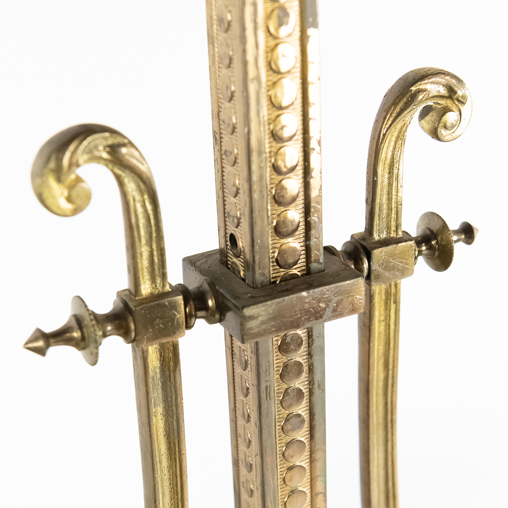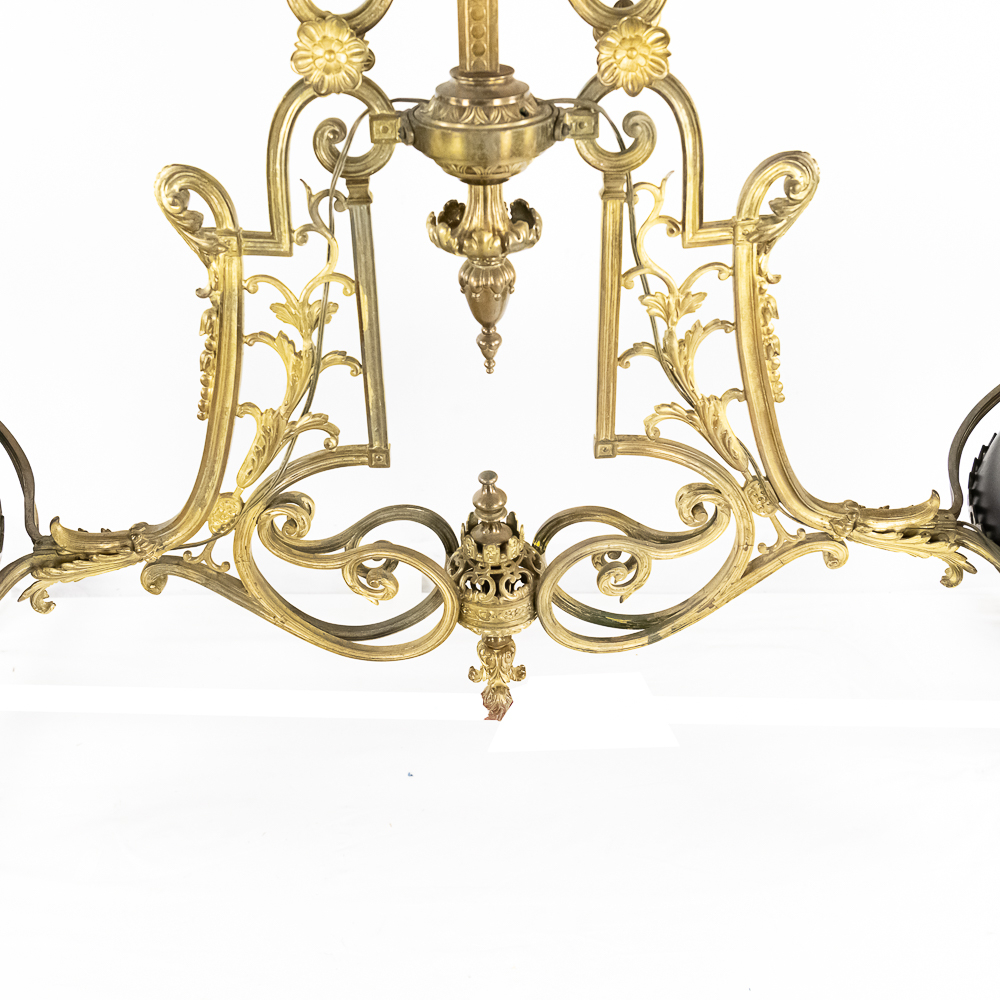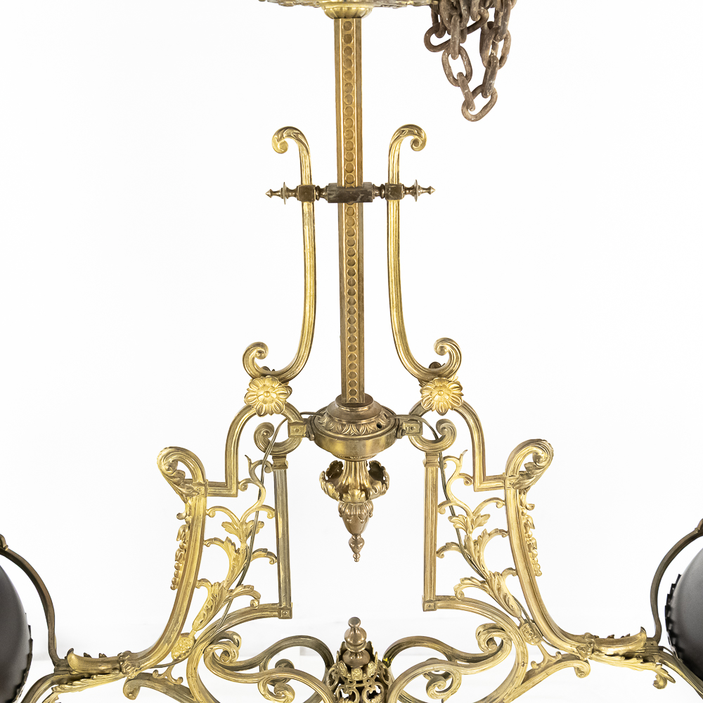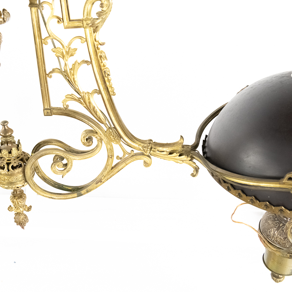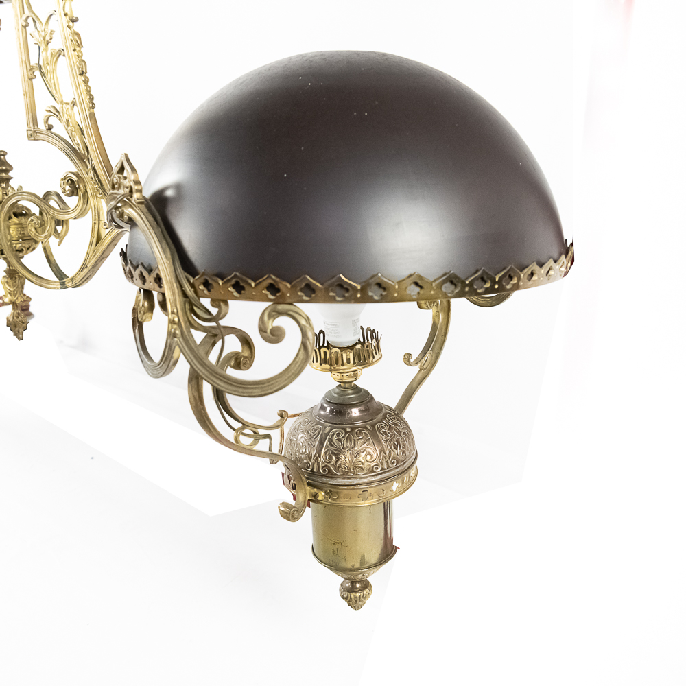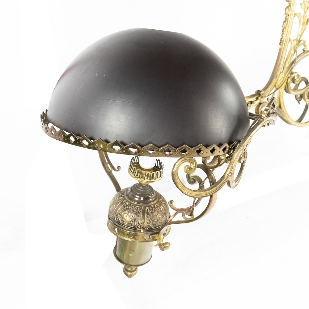 Vintage solid cast brass ornate 2 arm light fixture perfect to hang over a bar or pool table. Originally oil lamps, it has been converted to electric. The original glass shades have been replaced with plastic reproductions painted black. In overall good condition with no breaks or repairs to the castings. Measures 54″ drop, 74″ wide.