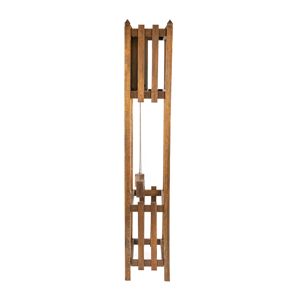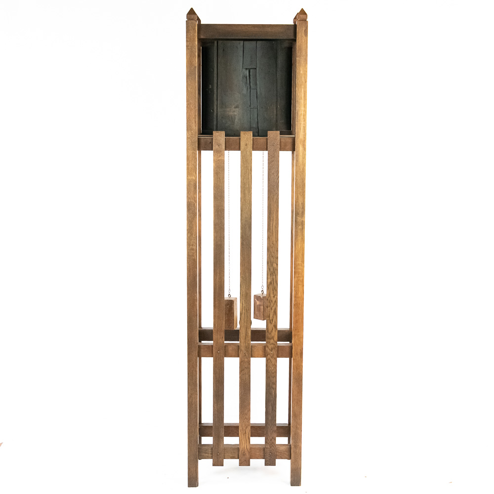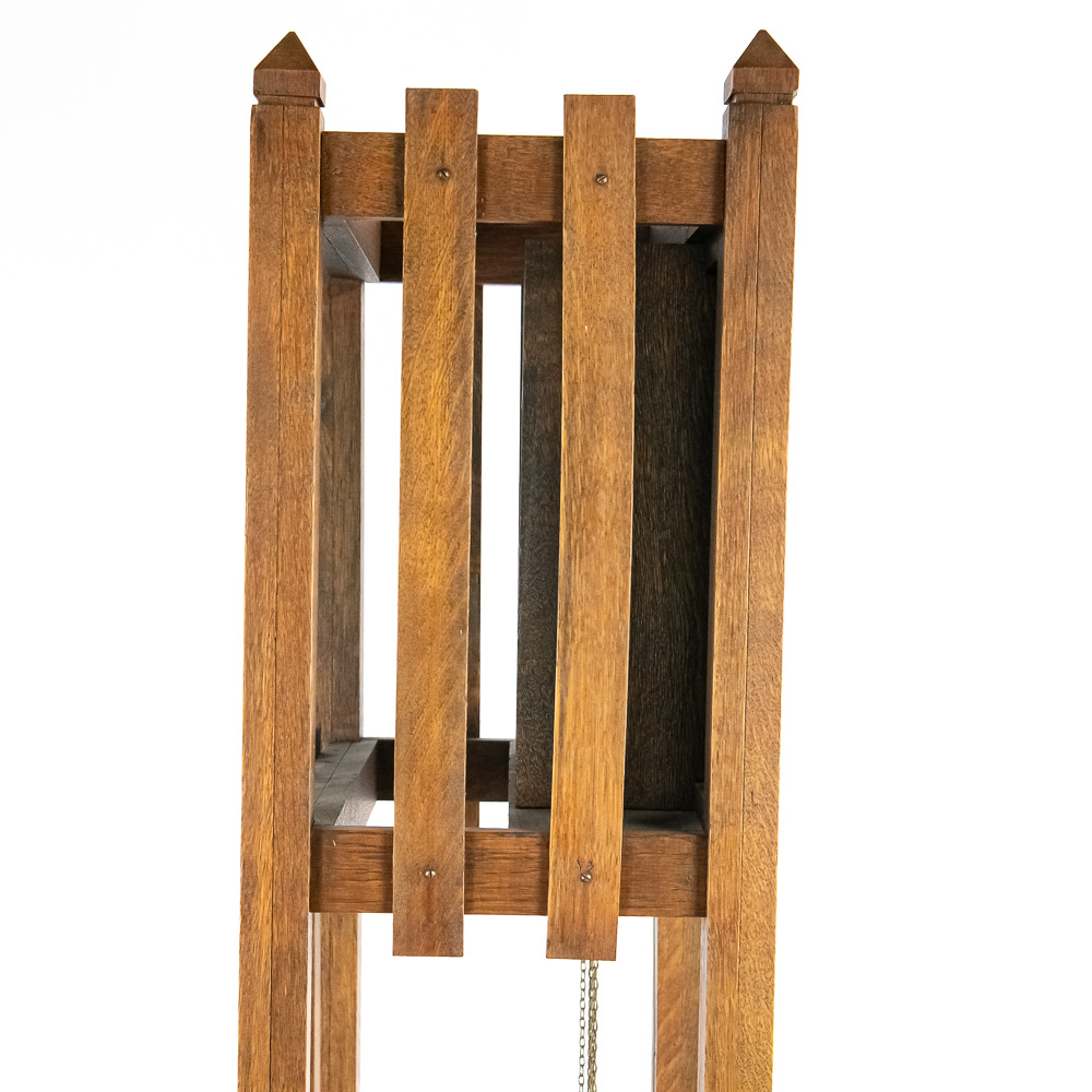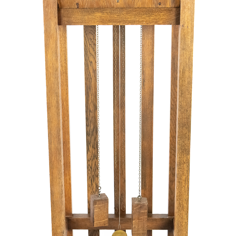 This is an exceptional example of an Arts and Crafts/Mission style grandfather or tall case clock, likely constructed of quarter-sawn oak. The aesthetic is classic Gustav Stickley-era with its straight lines, exposed joinery, and vertical, slatted open case. The face features bronze-tone Arabic numerals and hands on a wooden dial. The open case reveals the chain-driven weight movement, which features two prominent wooden block weights and a pendulum, characteristic of a clock meant to be wound daily. Given its height, this piece would have been a substantial, fashionable furnishing for an early 20th-century home. The clock appears to be in nice, operational condition, exhibiting a desirable, rich, dark patina consistent with age and use. There are no immediate signs of major structural damage, though the finish shows minor scuffs and wear typical of a piece this vintage. H 74″, W 17″, D 13″. Note: Pickup/Transport required. Contacts available post auction.
