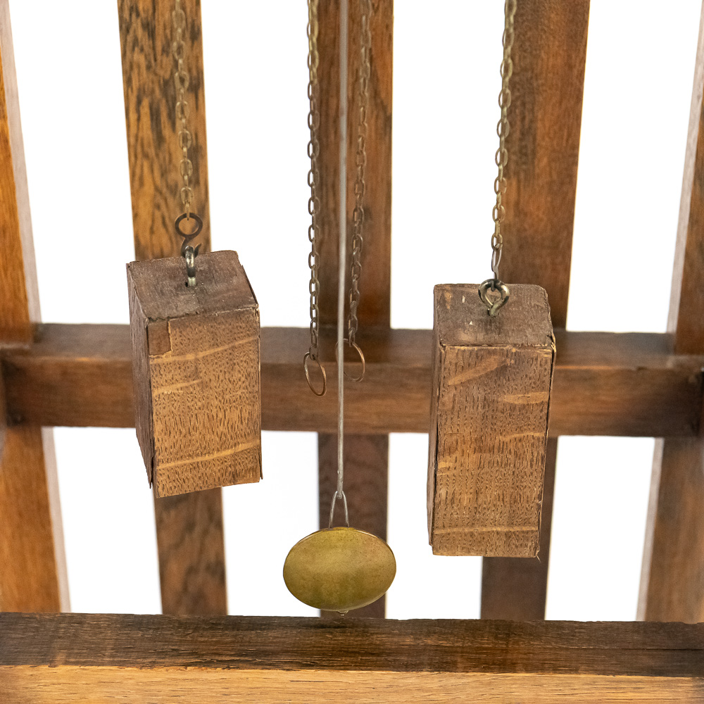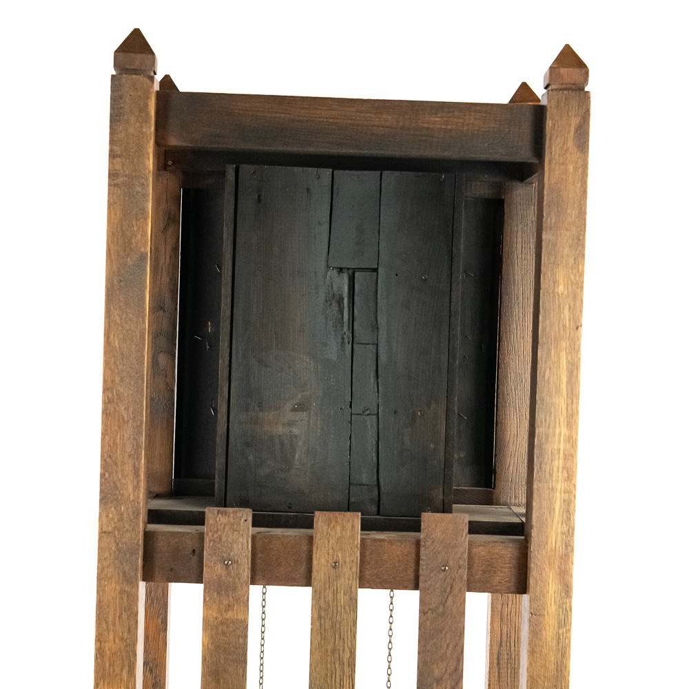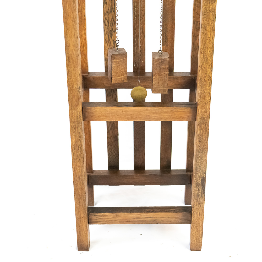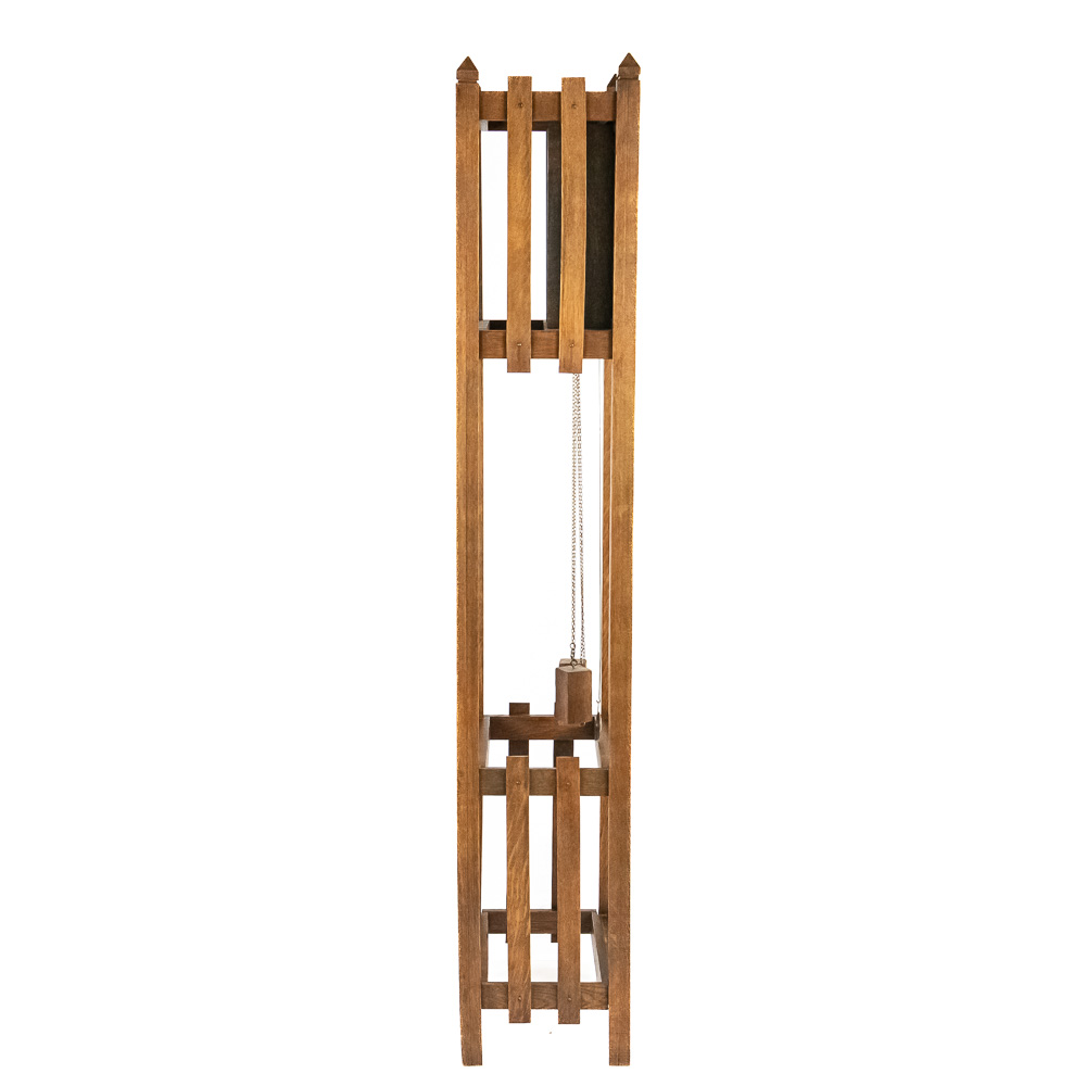This is an exceptional example of an Arts and Crafts/Mission style grandfather or tall case clock, likely constructed of quarter-sawn oak. The aesthetic is classic Gustav Stickley-era with its straight lines, exposed joinery, and vertical, slatted open case. The face features bronze-tone Arabic numerals and hands on a wooden dial. The open case reveals the chain-driven weight movement, which features two prominent wooden block weights and a pendulum, characteristic of a clock meant to be wound daily. Given its height, this piece would have been a substantial, fashionable furnishing for an early 20th-century home. The clock appears to be in nice, operational condition, exhibiting a desirable, rich, dark patina consistent with age and use. There are no immediate signs of major structural damage, though the finish shows minor scuffs and wear typical of a piece this vintage. H 74″, W 17″, D 13″. Note: Pickup/Transport required. Contacts available post auction.