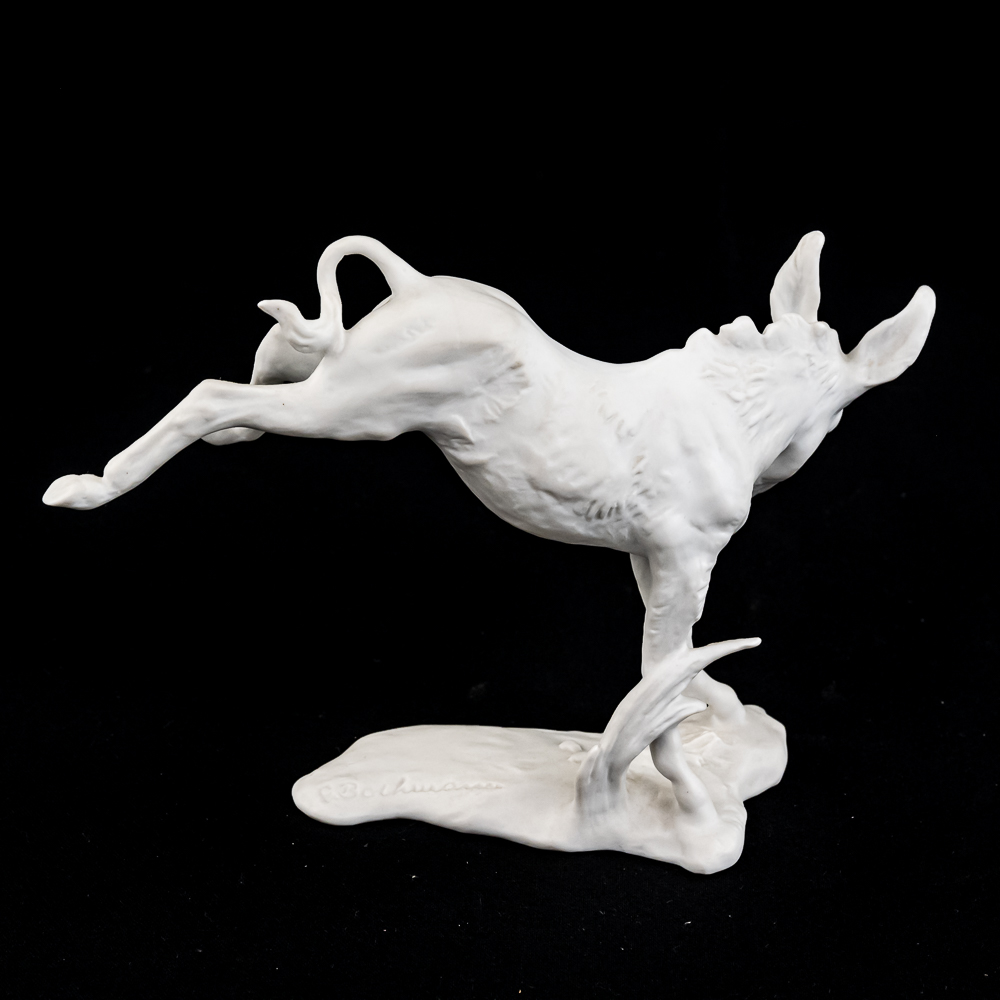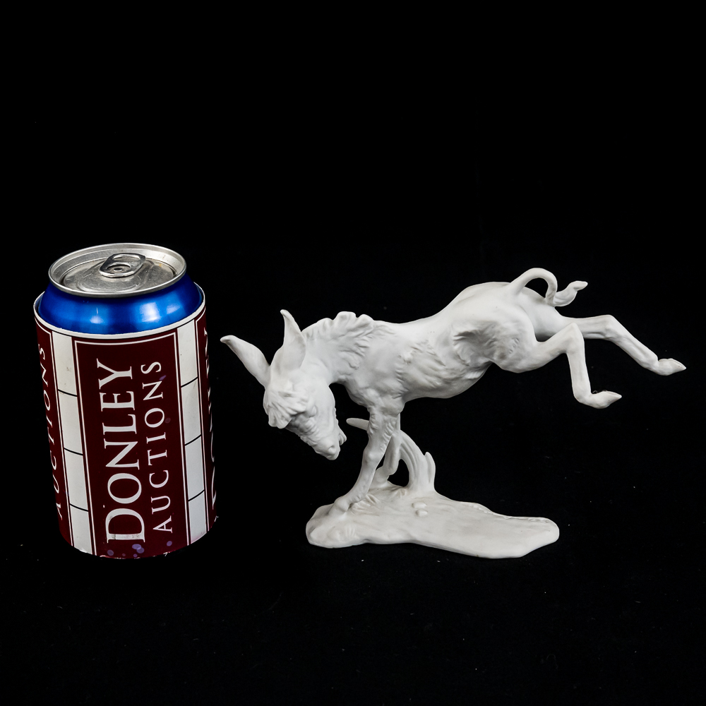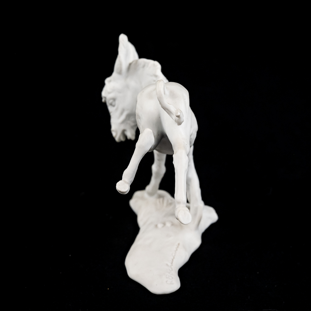 Kaiser Germany #389 white bisque Kicking Donkey porcelain figurine (5″t x 7″l). Very Good overall condition with no visible cracks or chips, minor discoloration. Perfect addition to your household. Please use photos to judge condition and bid accordingly.