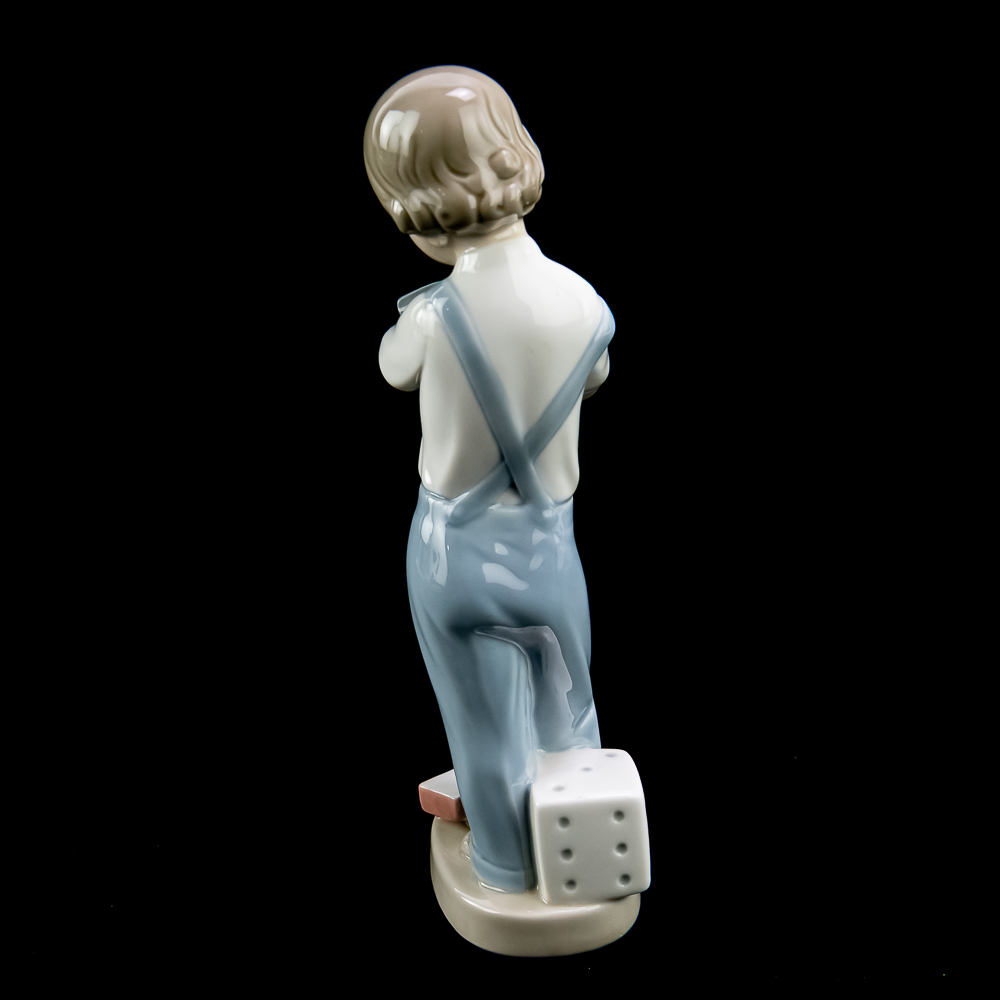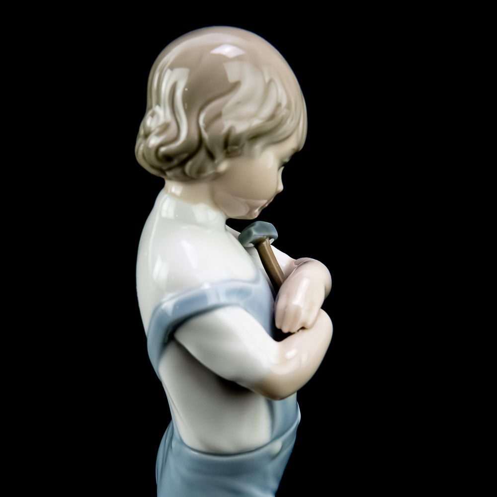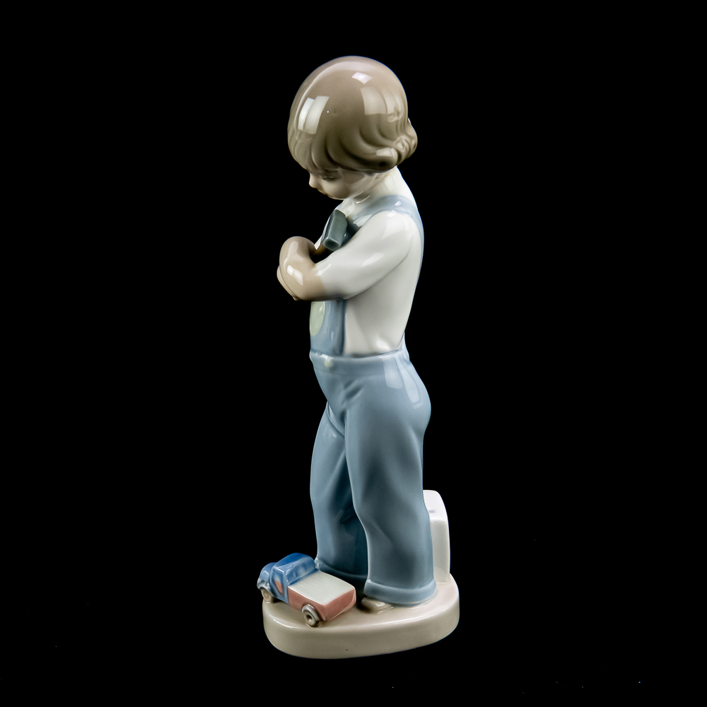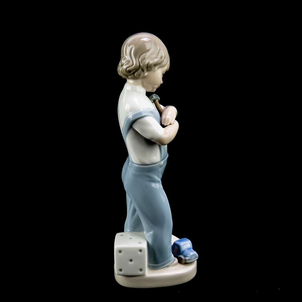 “The Mechanic” (model #4897). This charming porcelain figure features a boy holding a hammer with a toy truck at his feet. Sculpted by Francisco CatalΓ‘, it was introduced in 1974 and retired in 1985. The piece is finished in LladrΓ³’s signature pastel glazes and stands about 8.25 inches tall. In VG condition with no chips, cracks, or repairs. No box or paperwork.