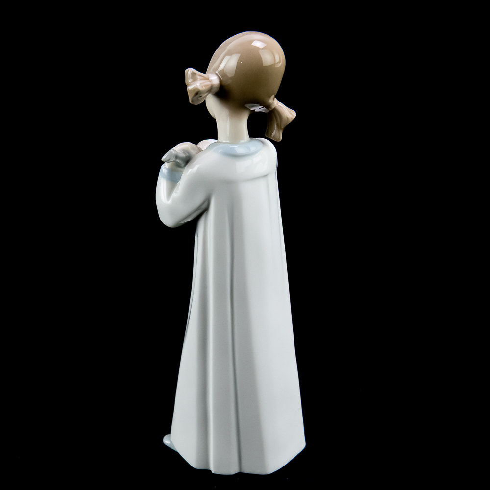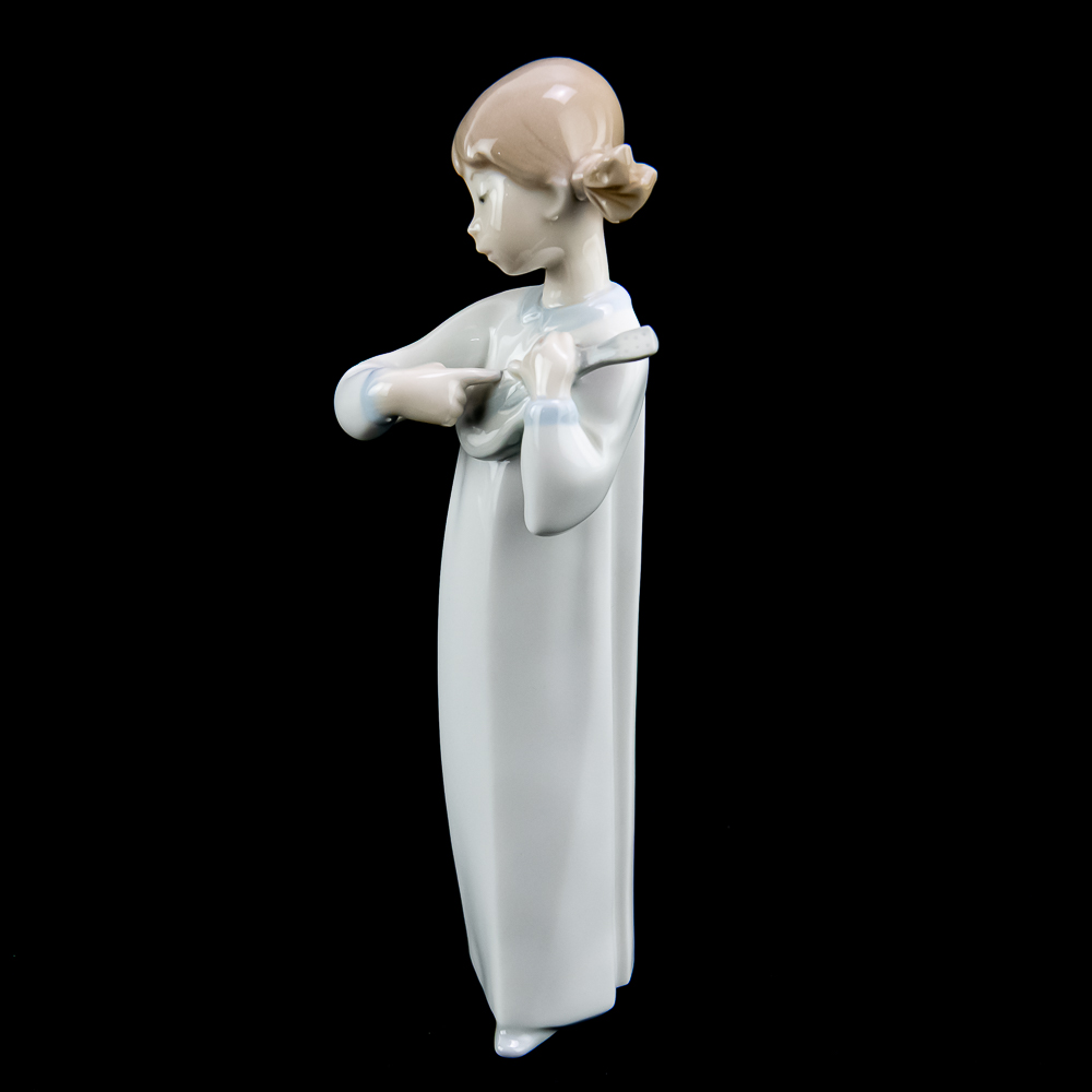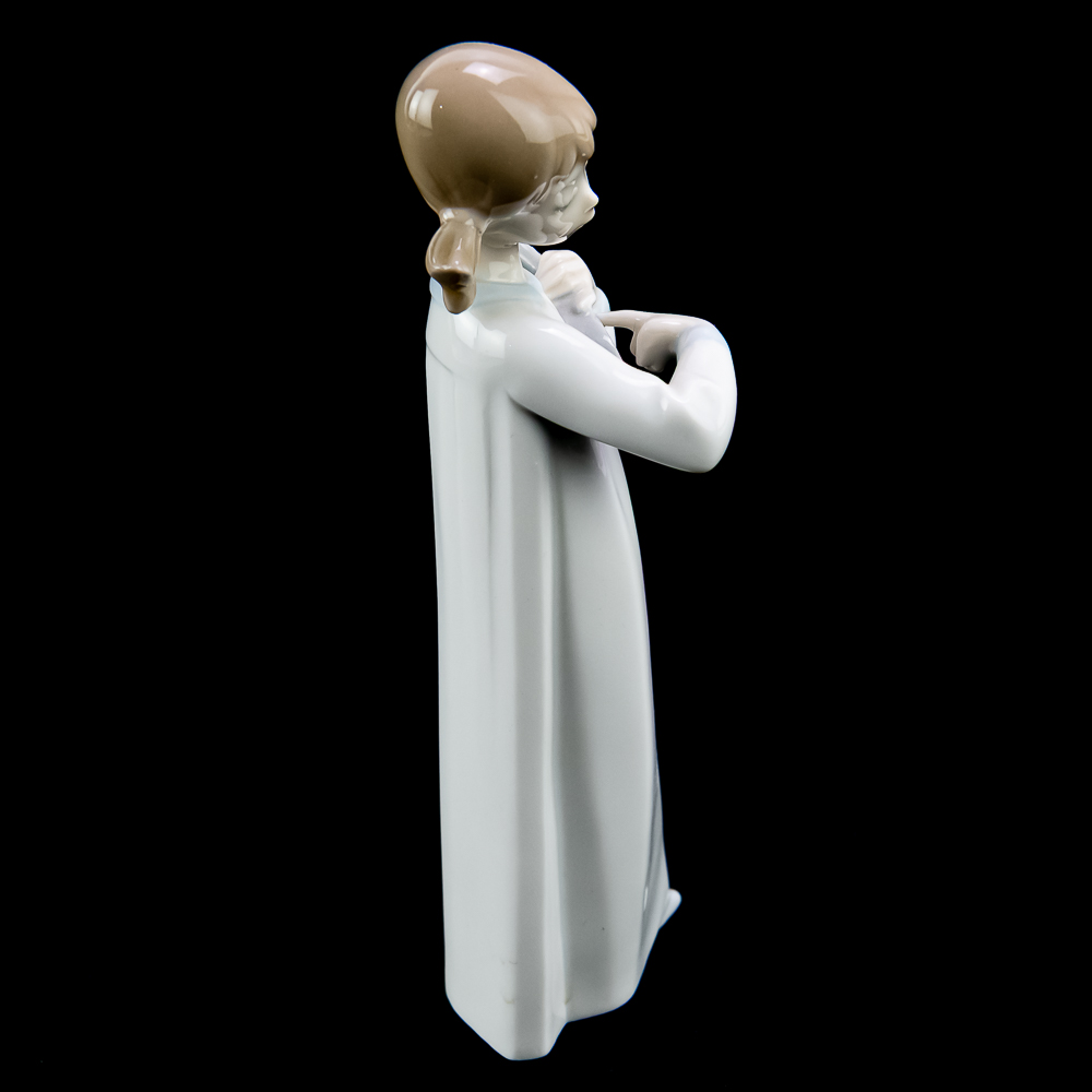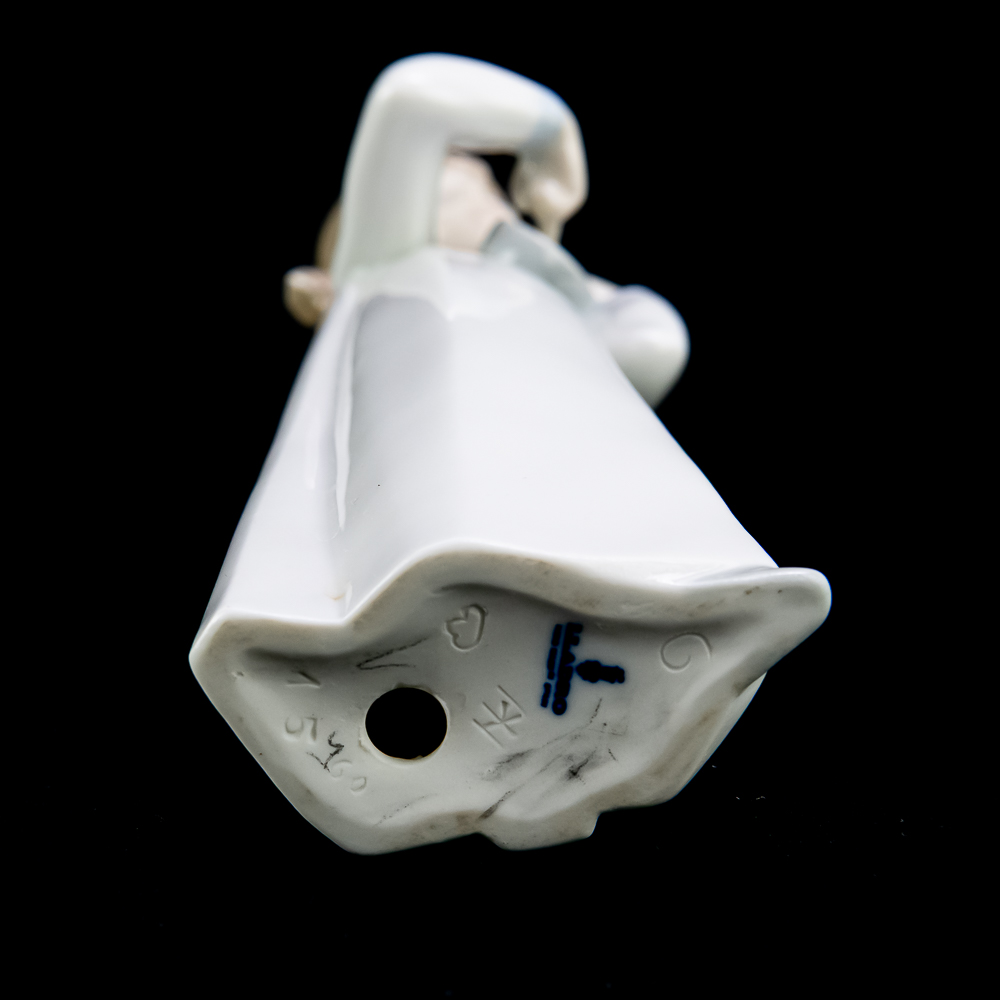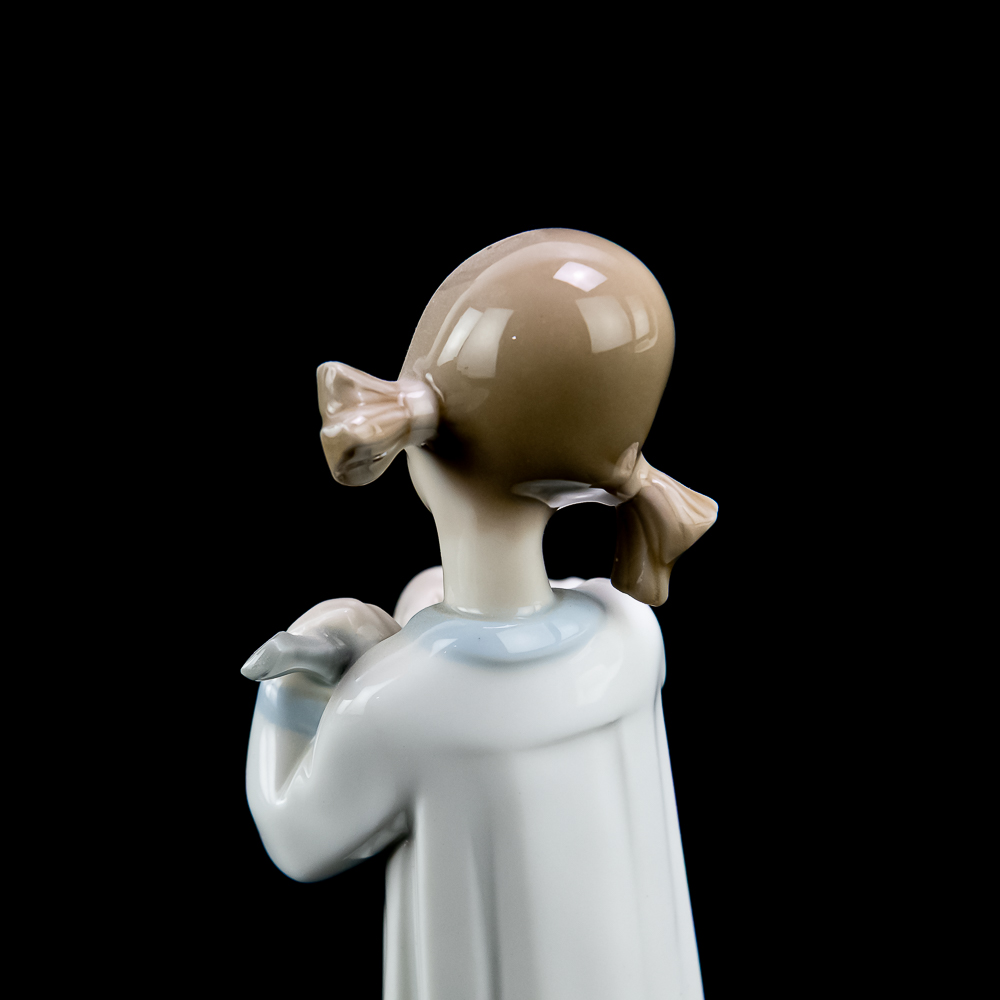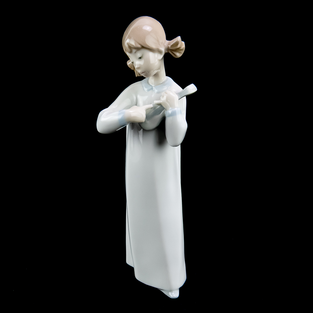 “Girl with Guitar” (model #4871), which depicts a young girl playing a small guitar, often interpreted as a ukulele. Designed by Fulgencio Garcia, this piece was introduced in 1974 and retired in 2001. The figurine stands about 8.25 inches tall and features a glossy finish. In VG condition with no chips, cracks, or repairs. No box or paperwork.
